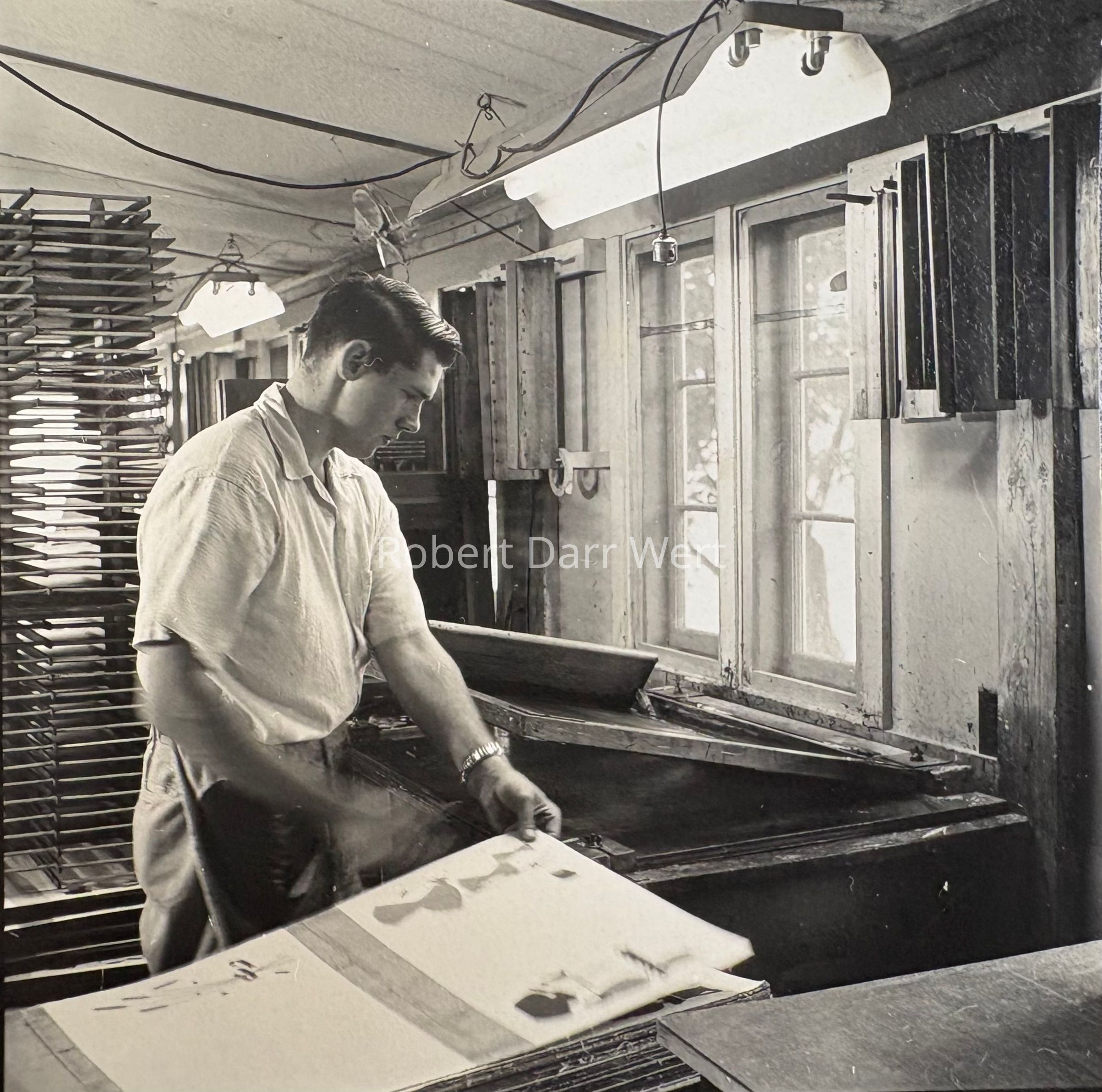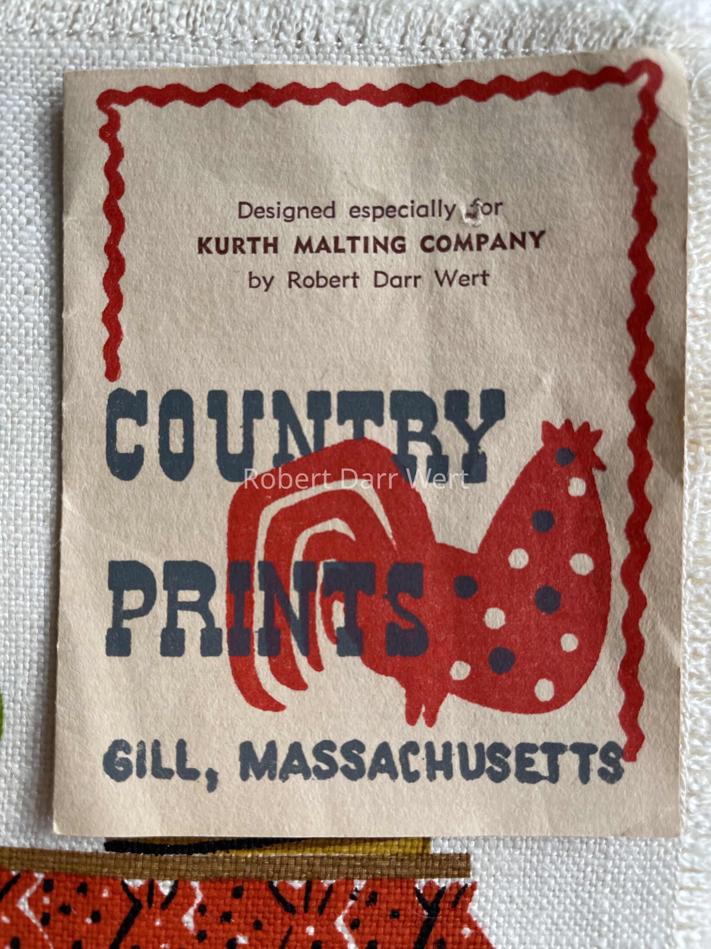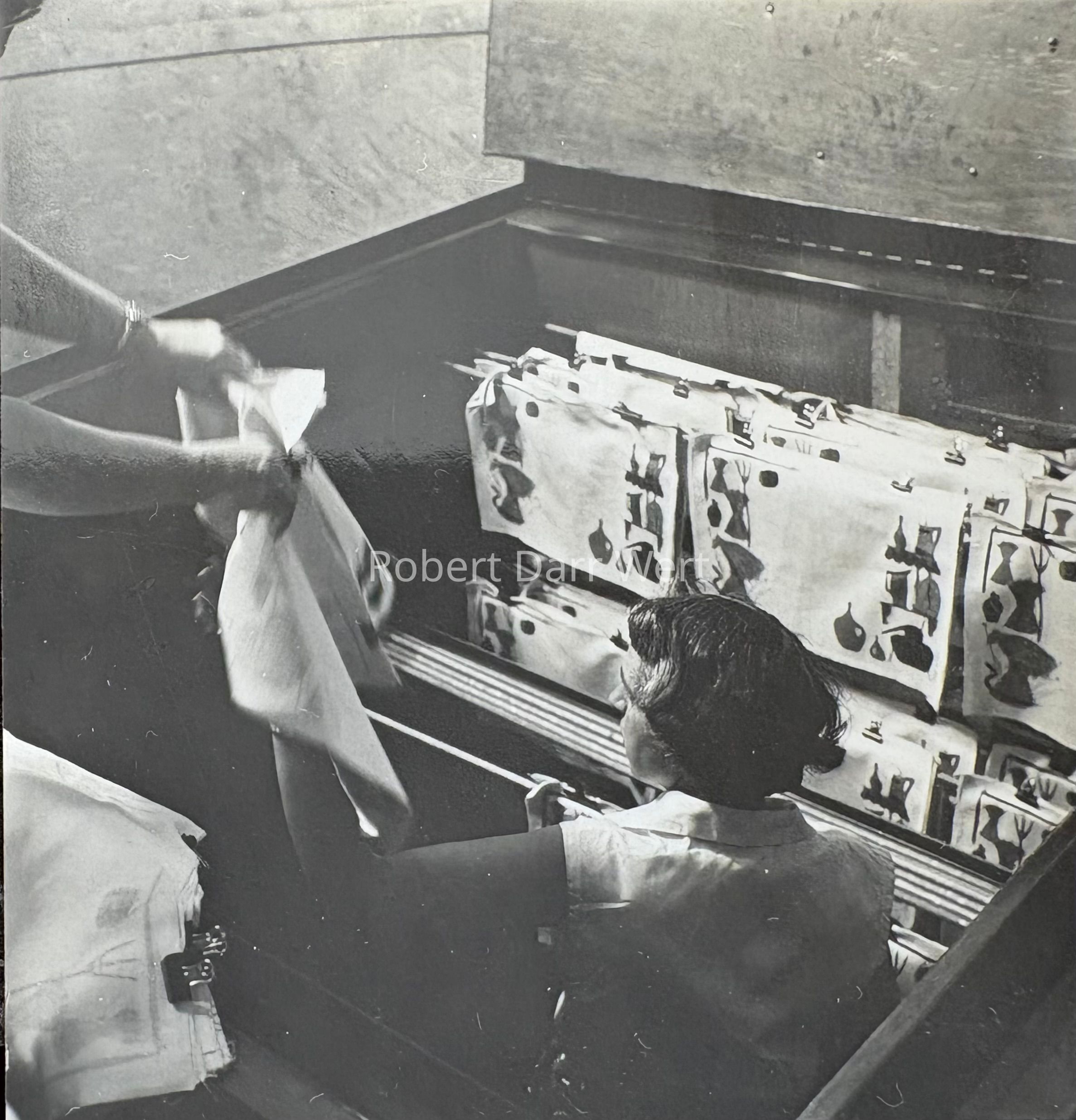 This set is pictured in production photos taken at the Country Print workshop in May 1957; see images. Year based on CP products on view in a photo set of the workshop, specifically Country Pokes tote bags, which were introduced in 1957, as per a January 19, 1957 article in the Greenfield Recorder-Gazette.Made/Created