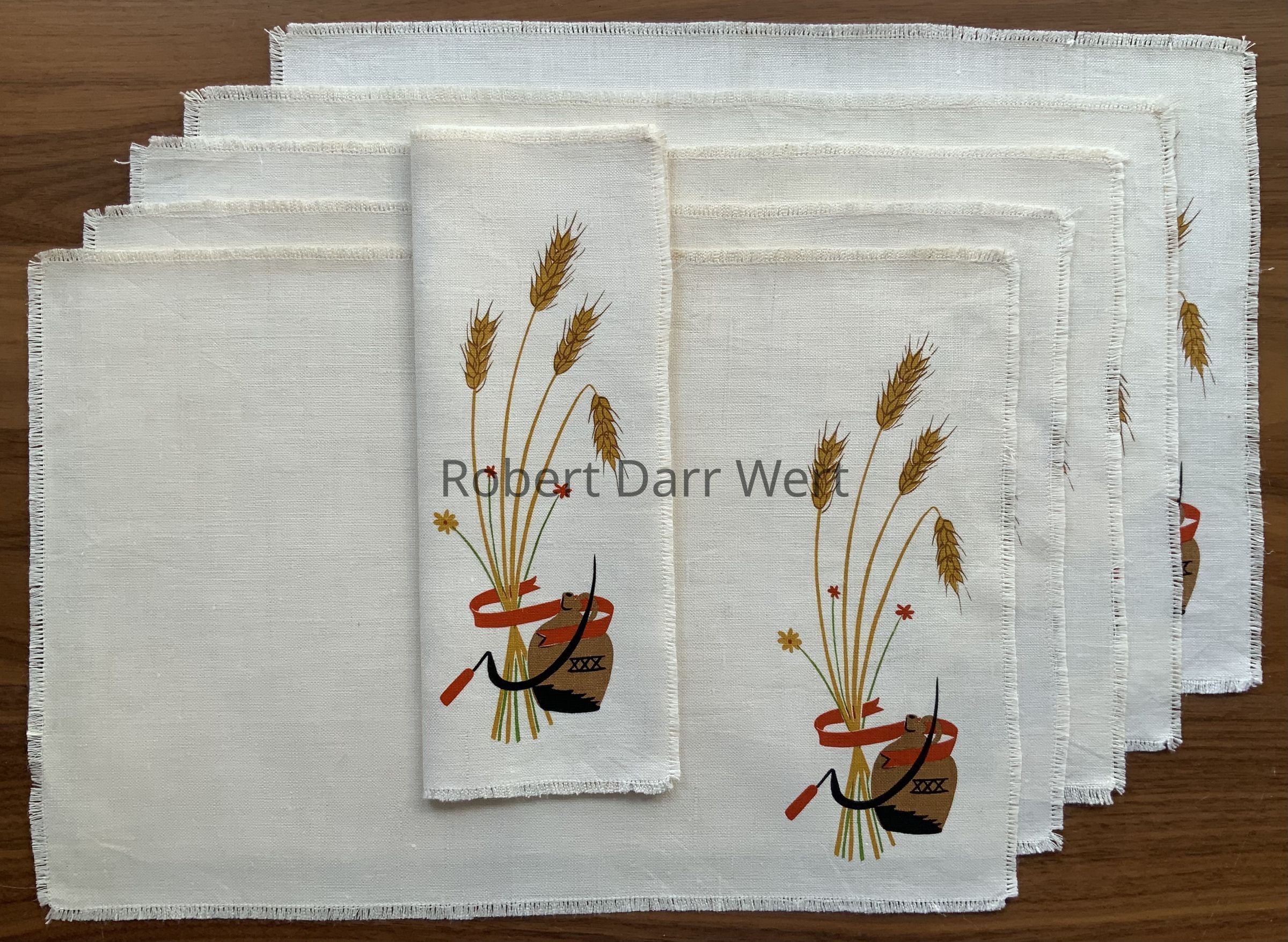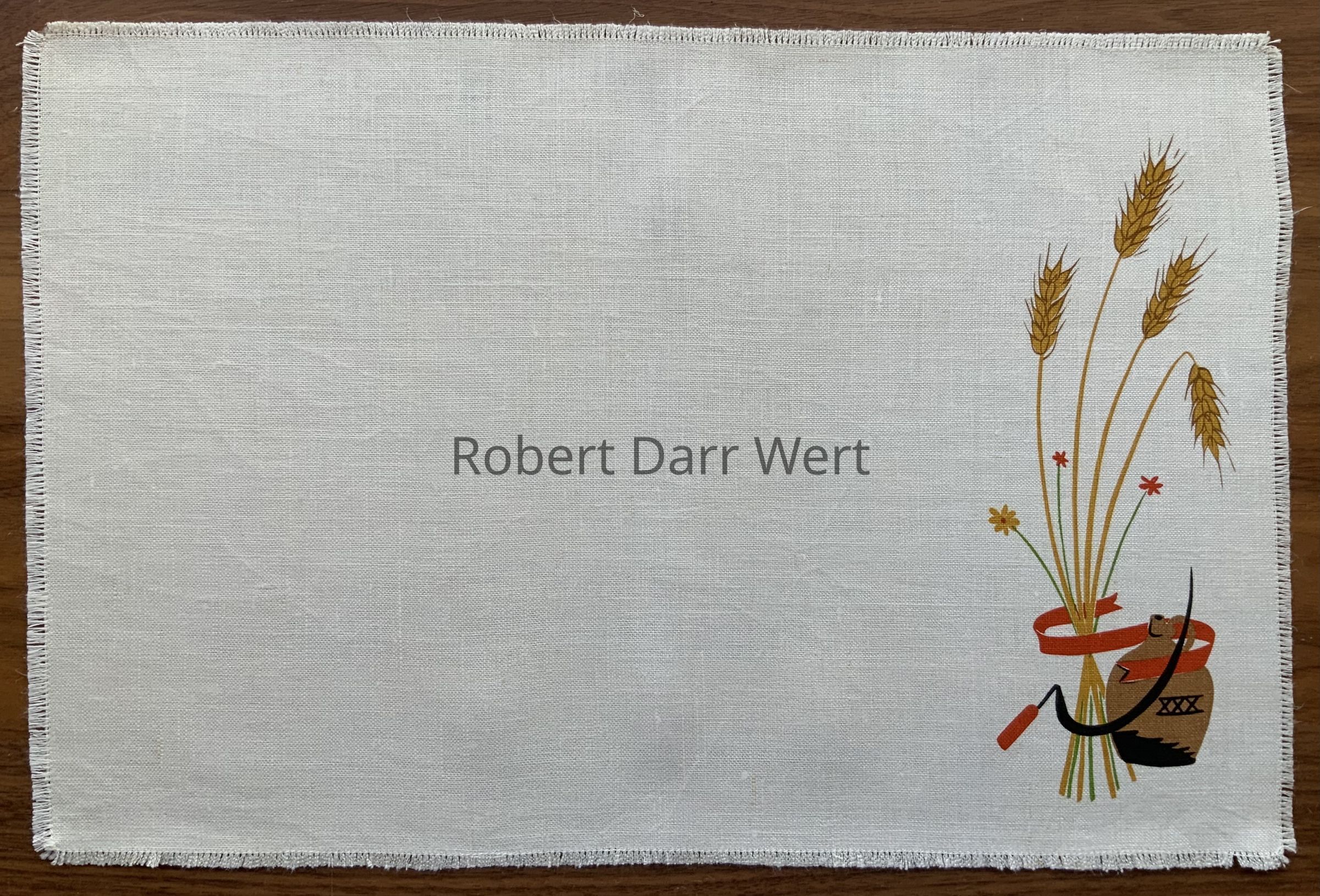 Napkin: a five-color silkscreen print on off-white linen depicting stalks of wheat, a hand sickle, and a brownware jug of alcohol marked “XXX”.