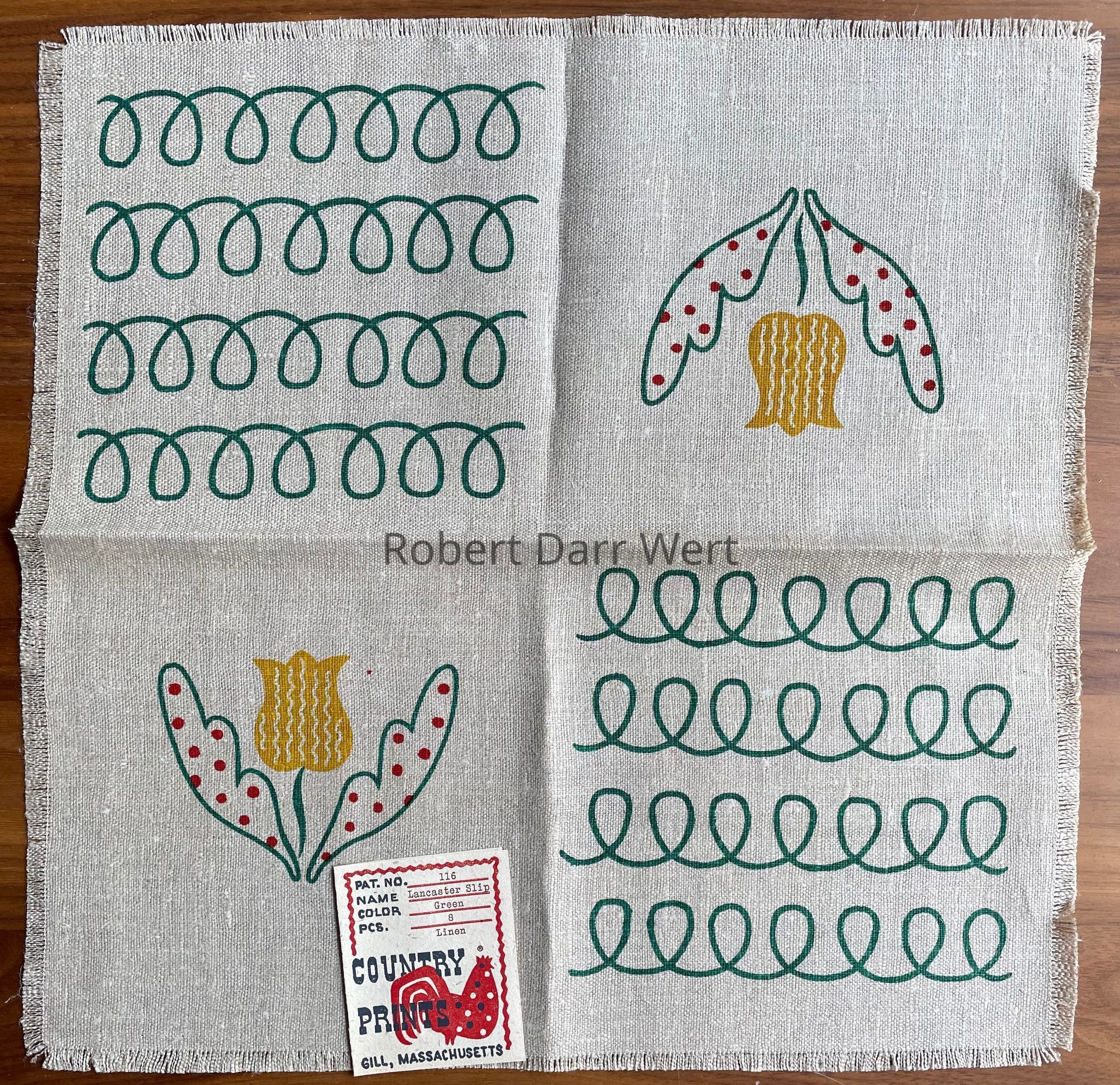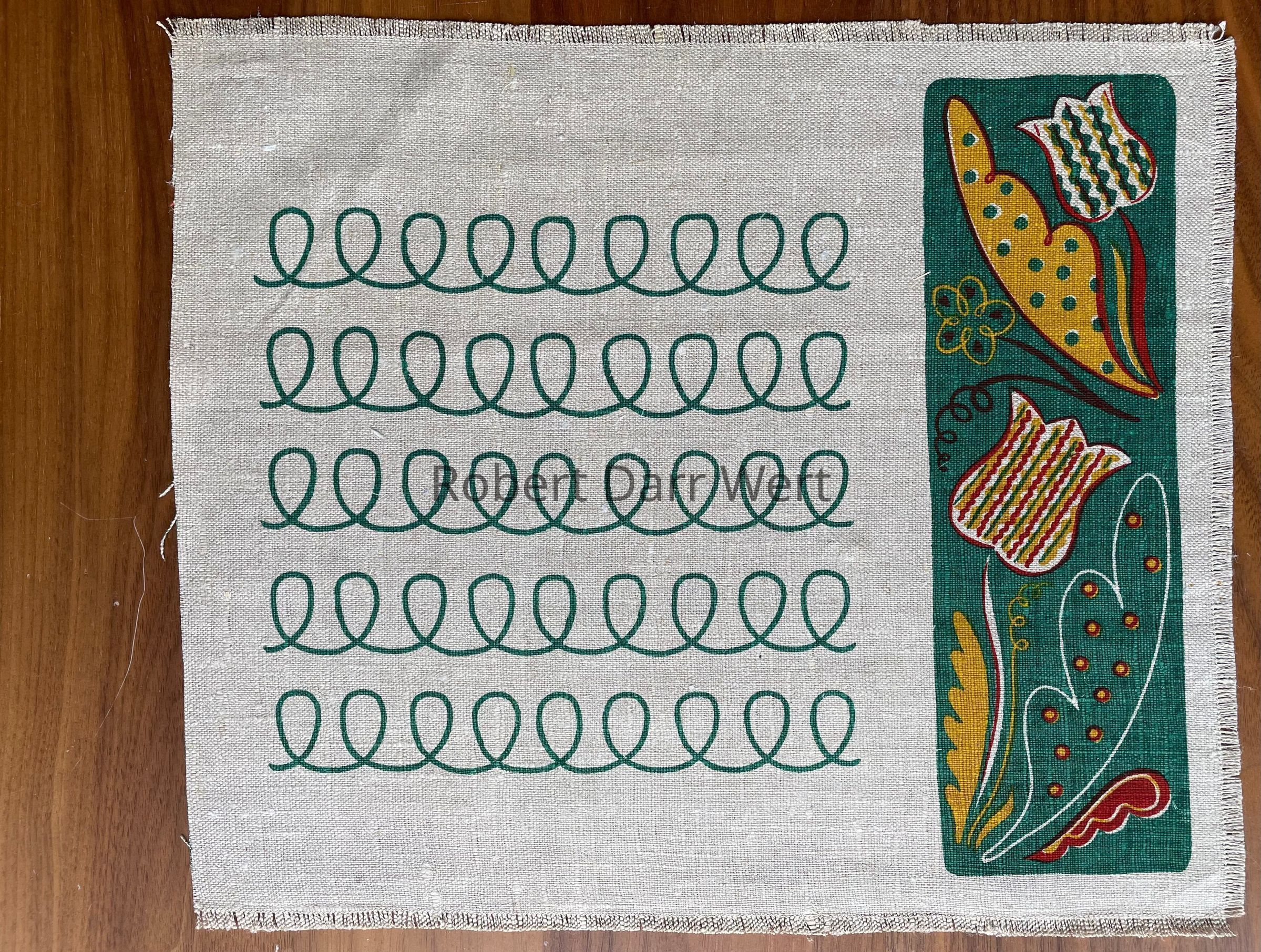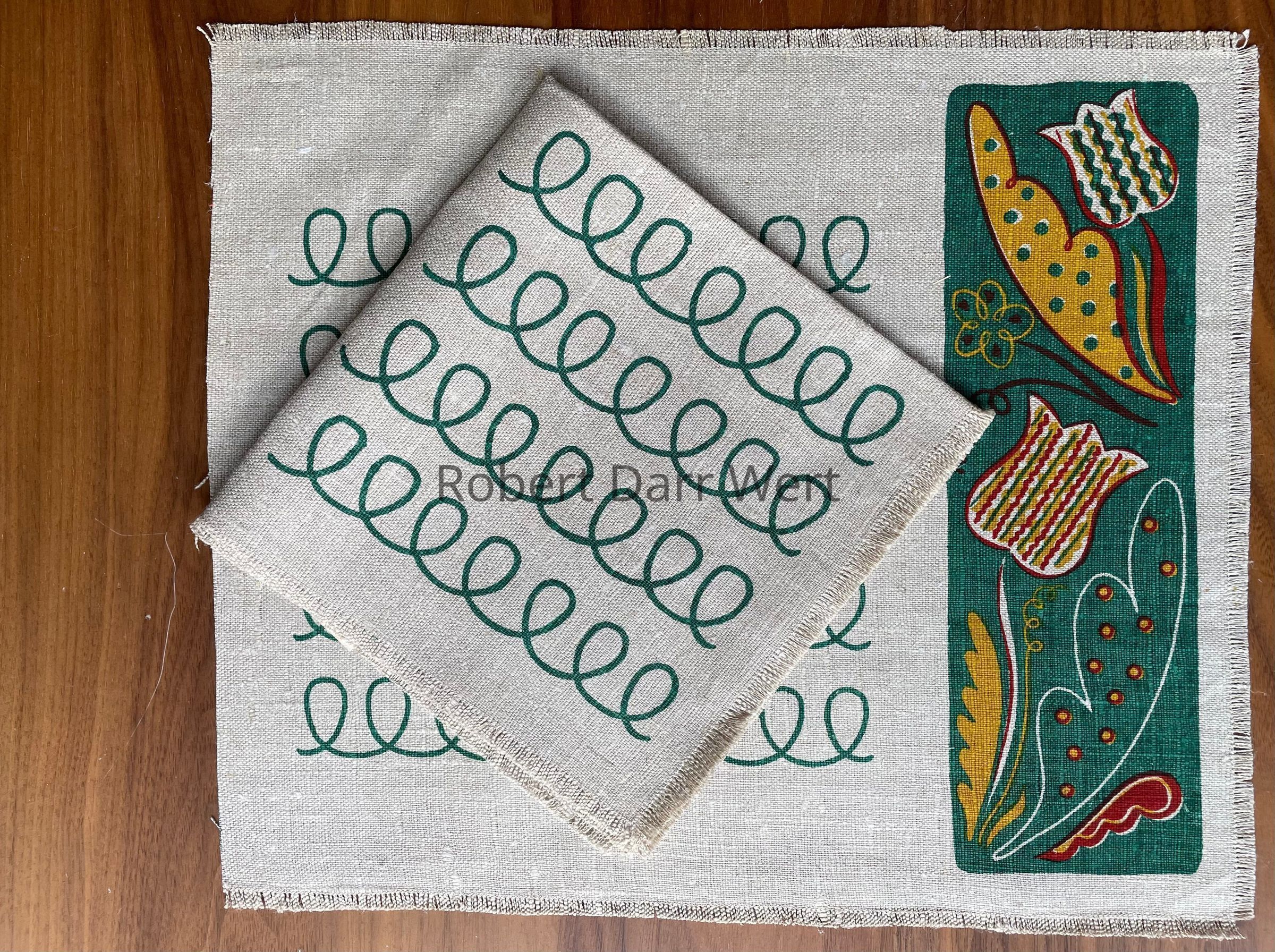 A placemat with a three-color silkscreen print depicting Wert’s interpretation of Pennsylvania “Dutch” folk art motifs in rectangular fields at left and right, with five rows of calligraphic scrolls between. The napkin bears a one-color print of scrolls to match the placemat.