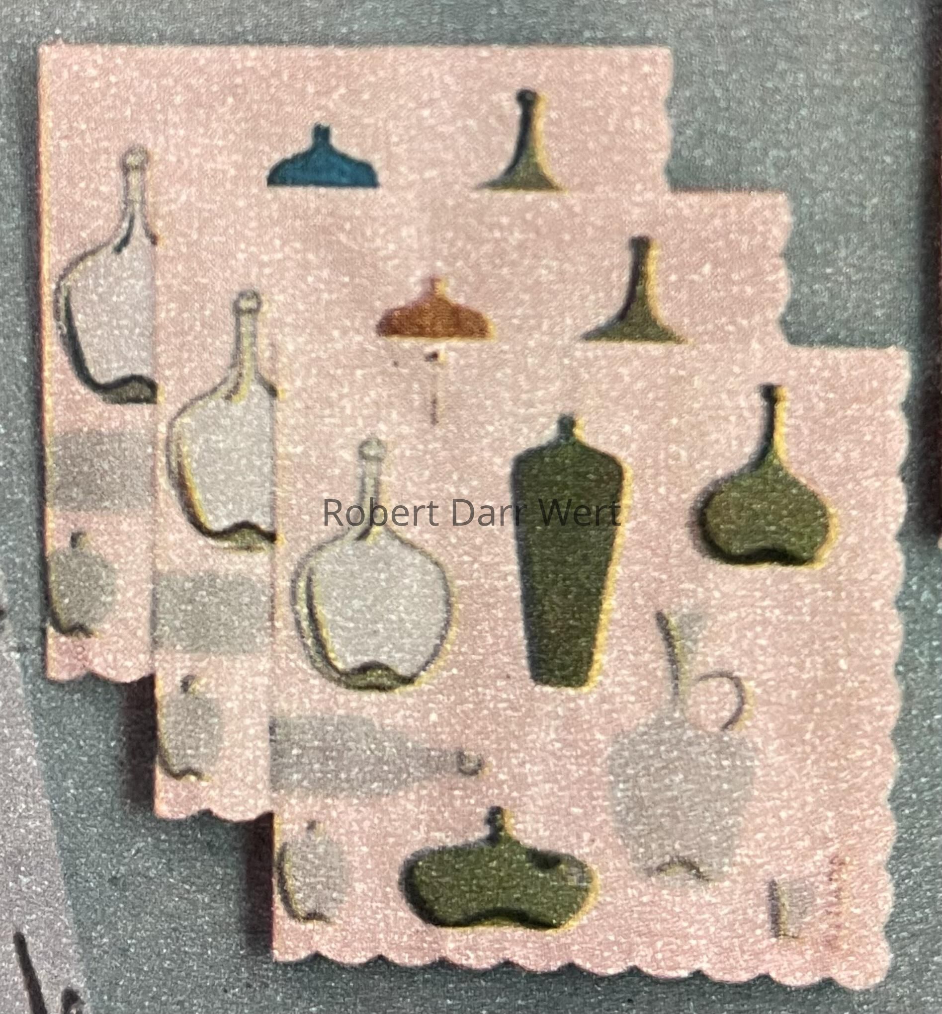 Napkins with a three or four-color silkscreen print on off-white linen or paper depicting numerous early American glass bottles. A matching placemat has not been documented.Made/Created