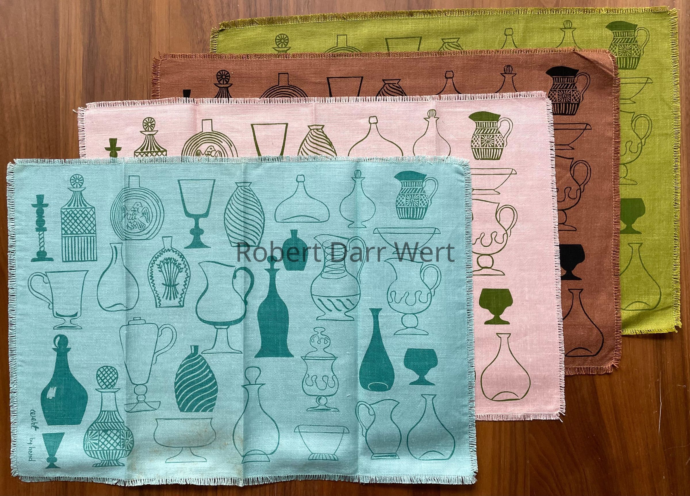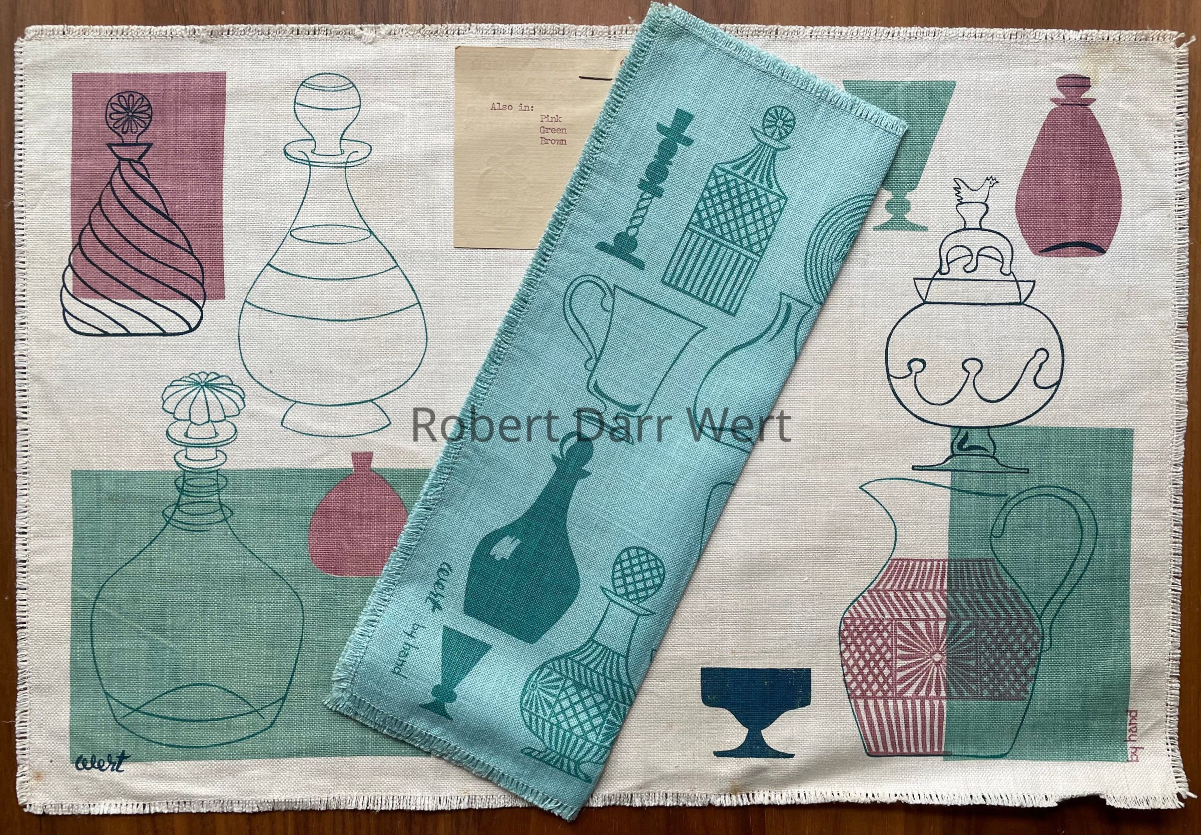 This napkin is part of a placemat set titled Bottles 125. It was produced in four colorways: aqua, pink, brown and green.