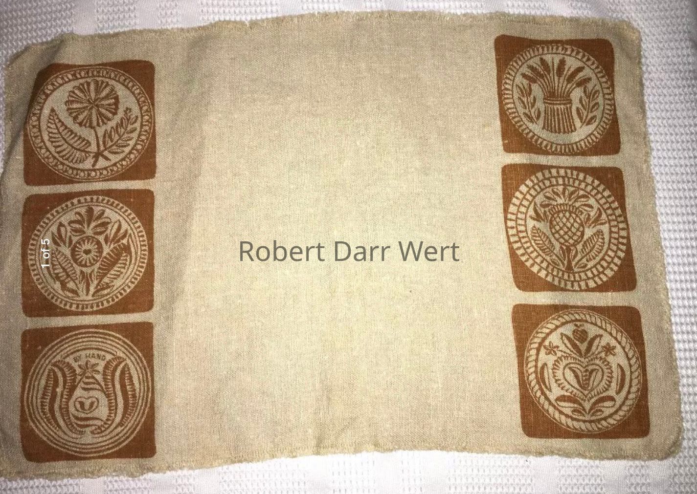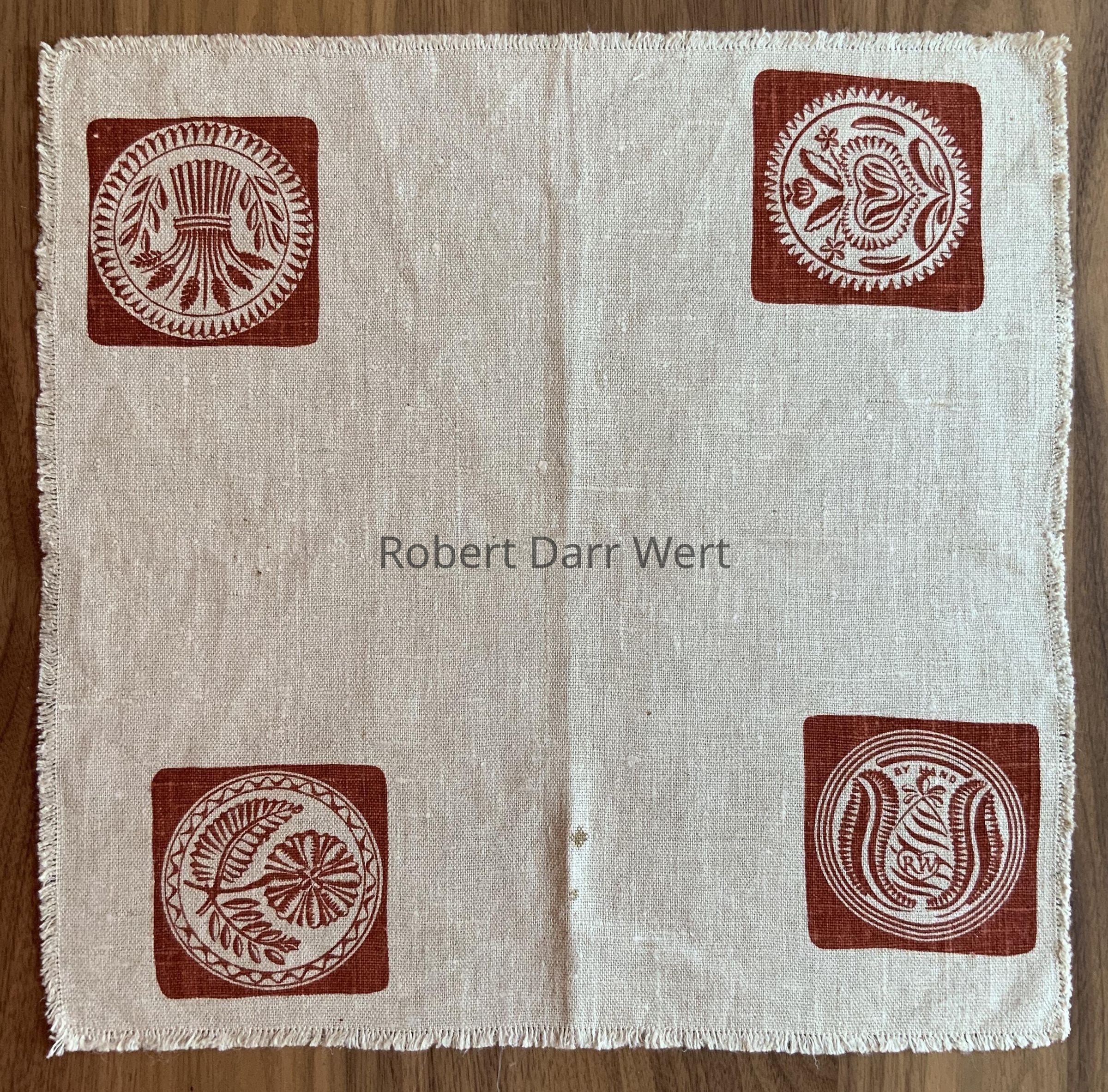 A napkin with a one-color silkscreen print on natural linen depicting four round carved wood butter mold designs set within square fields.