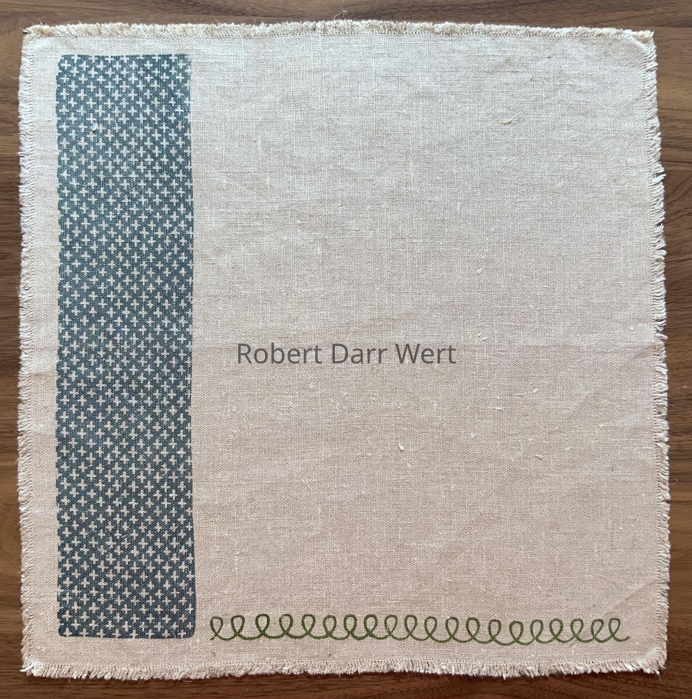 A two-color silkscreen print on natural linen. At left, a vertical field of navy blue is populated with small crosses or plus signs, reminiscent of calico fabric patterns. Across the lower margin is a green scrolled line. The asymmetrical nature of the design allows for playful presentations depending on how the napkin is folded.