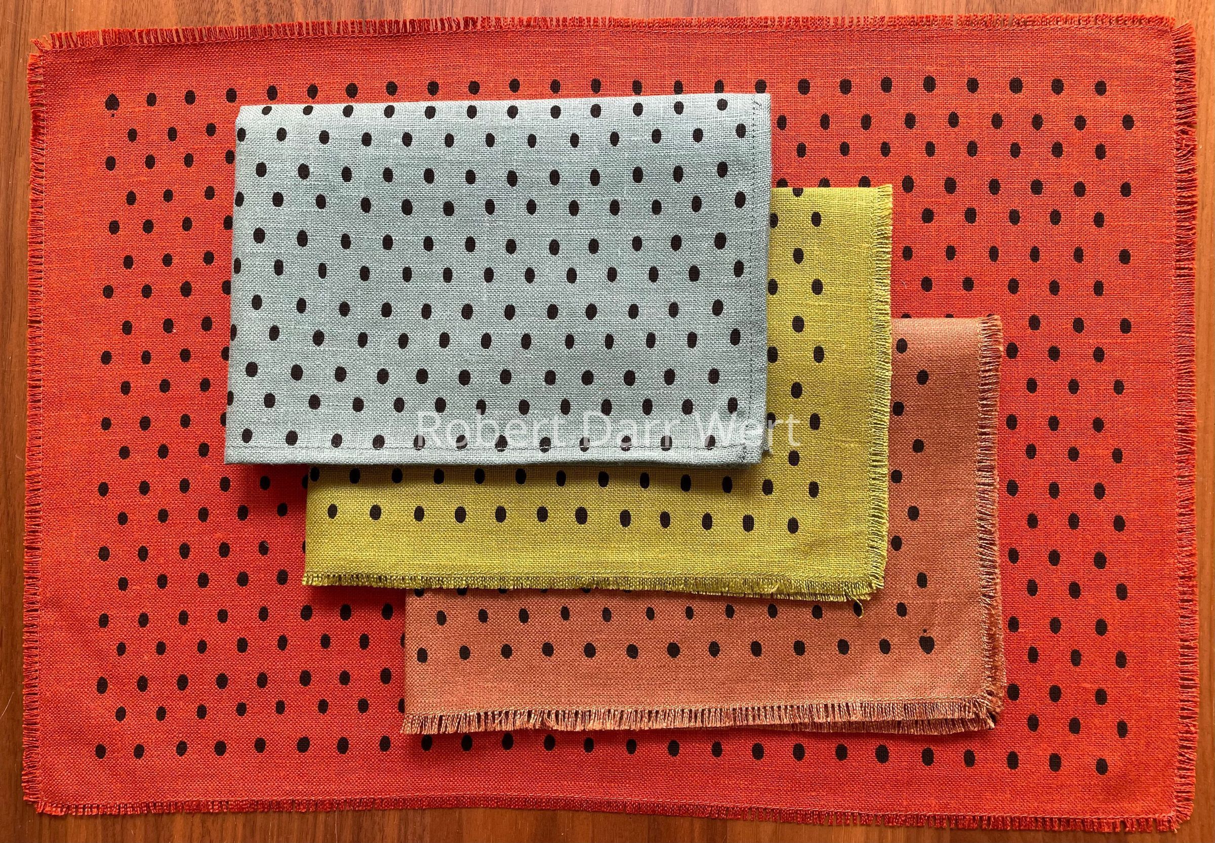 Solid color rectangular dinner napkins with a field of silkscreen printed black ovals. A small heart in one corner of each identifies these as Country Prints designs.