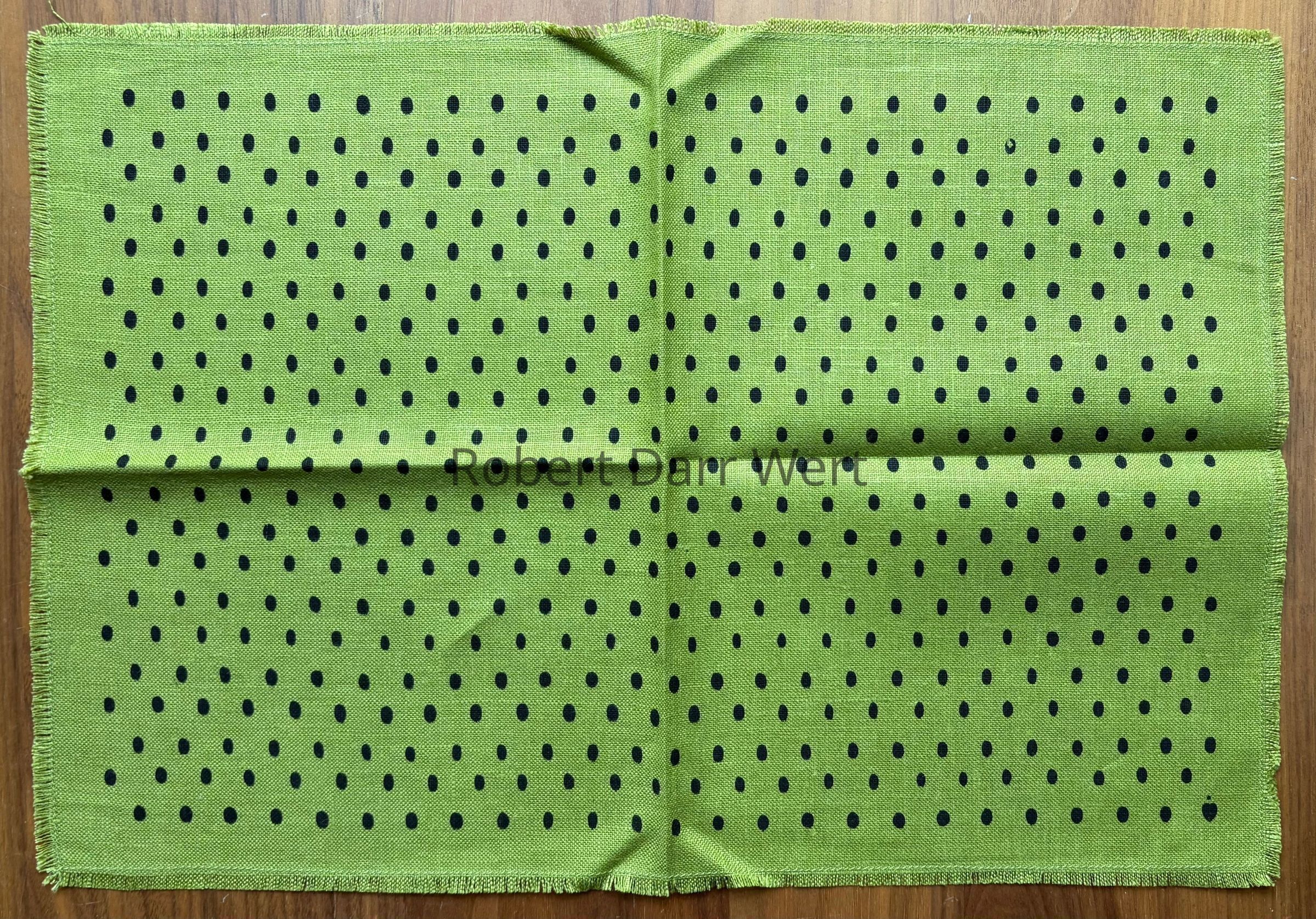 A placemat sized napkin with a one-color silkscreen print of oval polka-dots on solid color linen. The napkin is unsigned, however, the bottom right polka-dot is Wert’s heart signet.