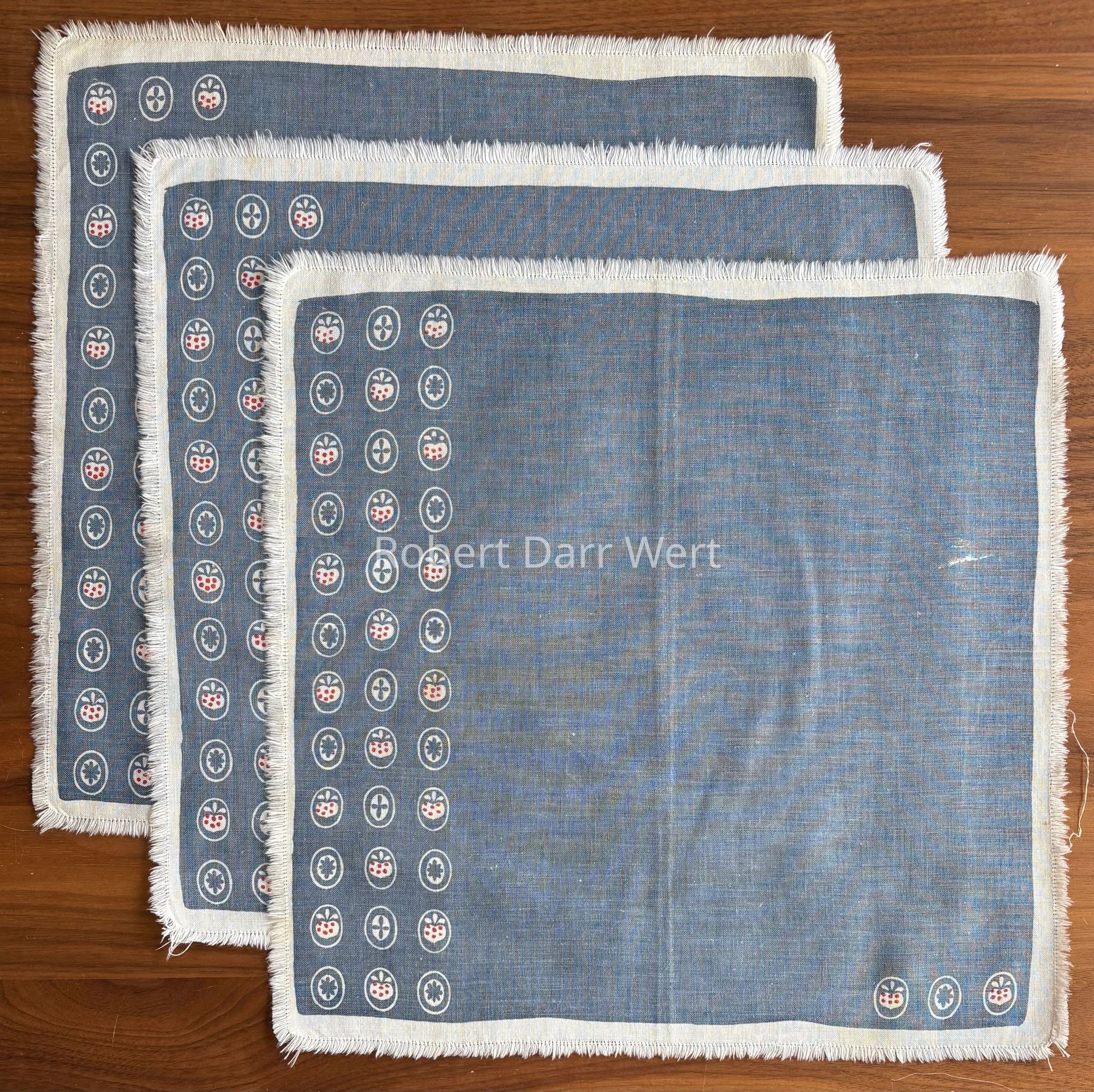 A two-color silkscreen print on fine white cotton crash. Repeated design elements comprised of three motifs within ovals: a strawberry, a four-lobed cross, and a sunburst. Motifs are arranged asymmetrically on a field of green, with three vertical rows to the far left and three single ovals horizontally at the lower right (two strawberries and a sunburst). The asymmetrical nature of the composition allows for playful place settings depending on how the napkin is folded.