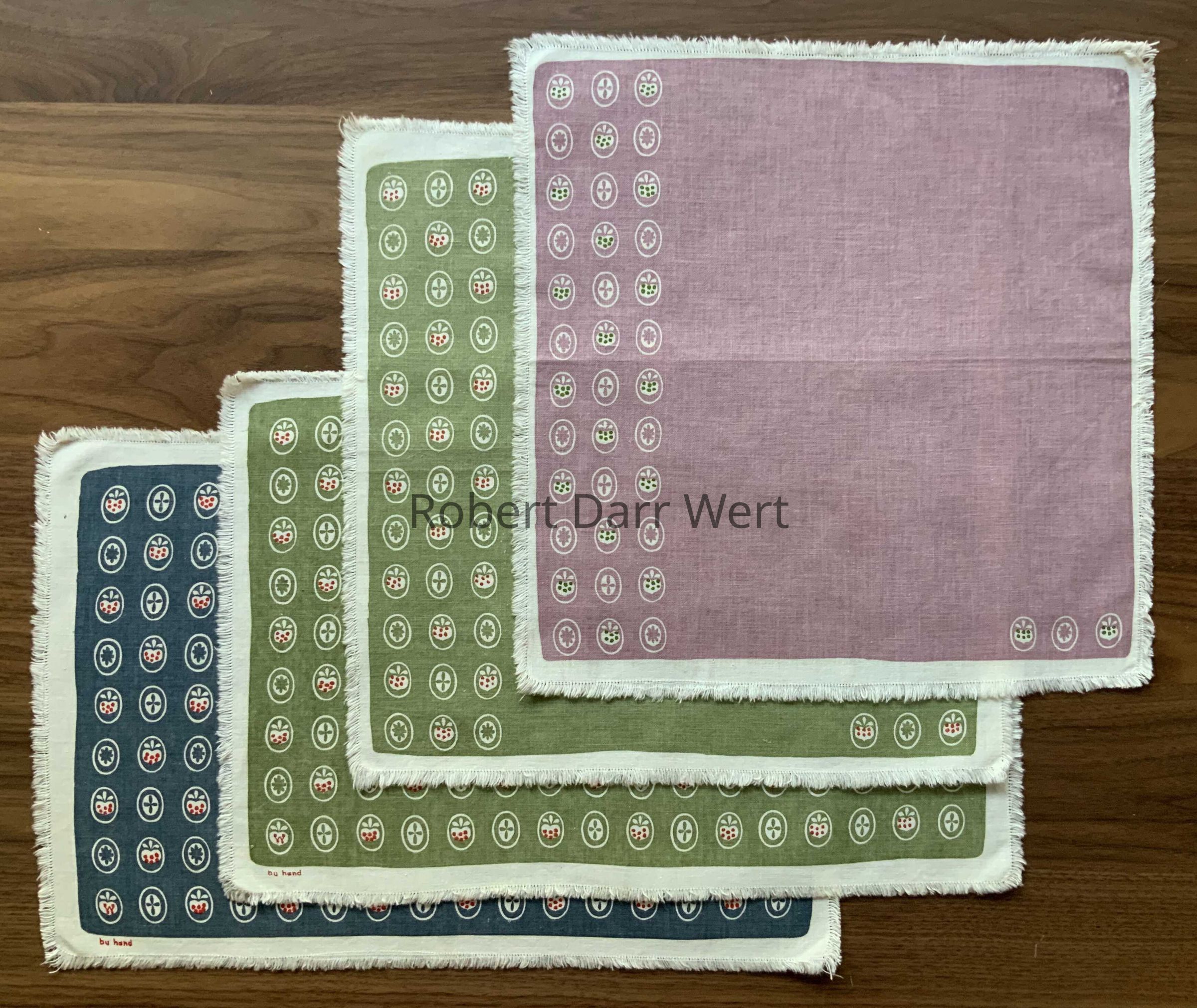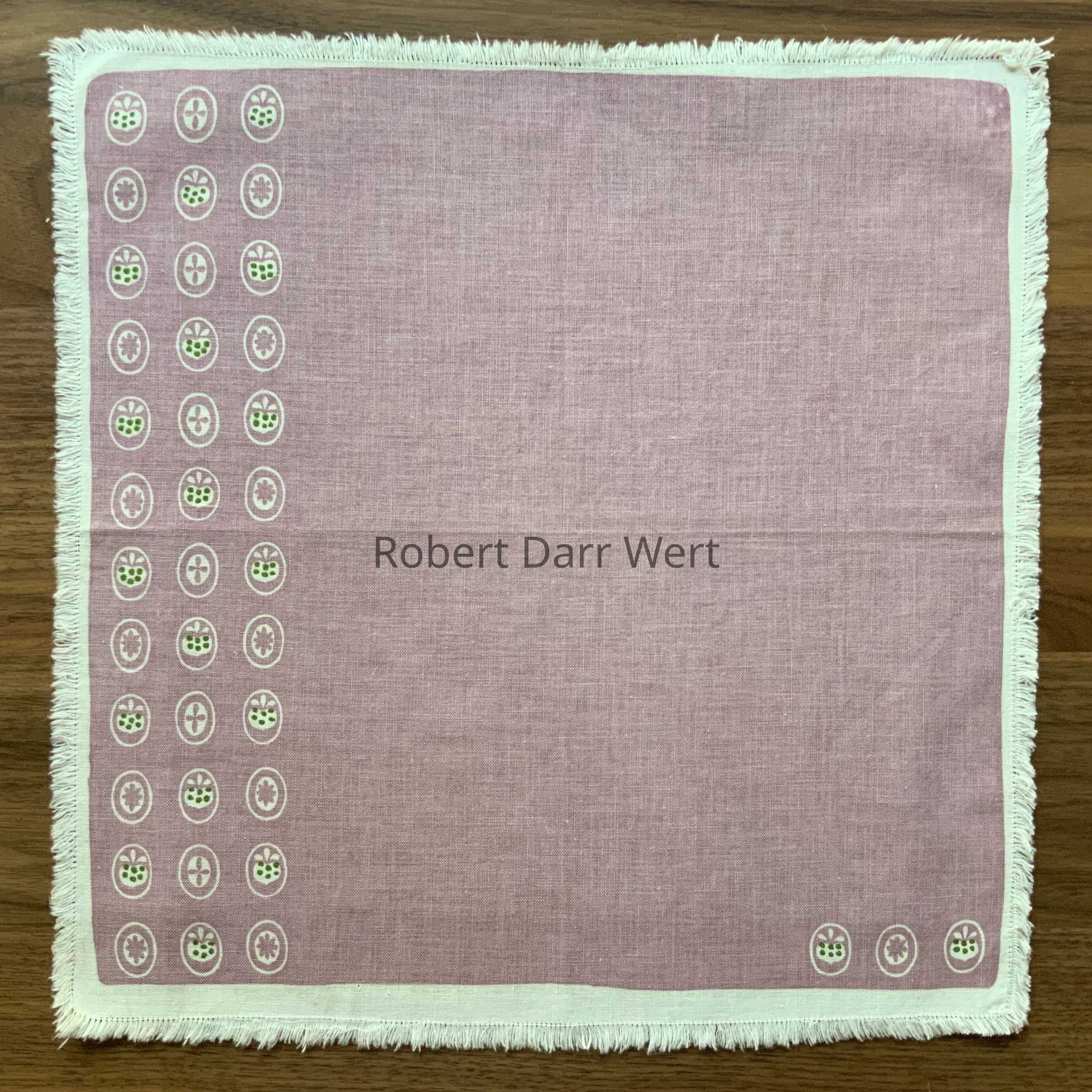 A two-color silkscreen print on fine white linen or cotton crash. Repeated design elements comprised of three motifs within ovals: a strawberry, a four-lobed cross, and a sunburst. Motifs are arranged asymmetrically on a field of green, with three vertical rows to the far left and three single ovals horizontally at the lower right (two strawberries and a sunburst). The asymmetrical nature of the composition allows for playful place settings depending on how the napkin is folded.