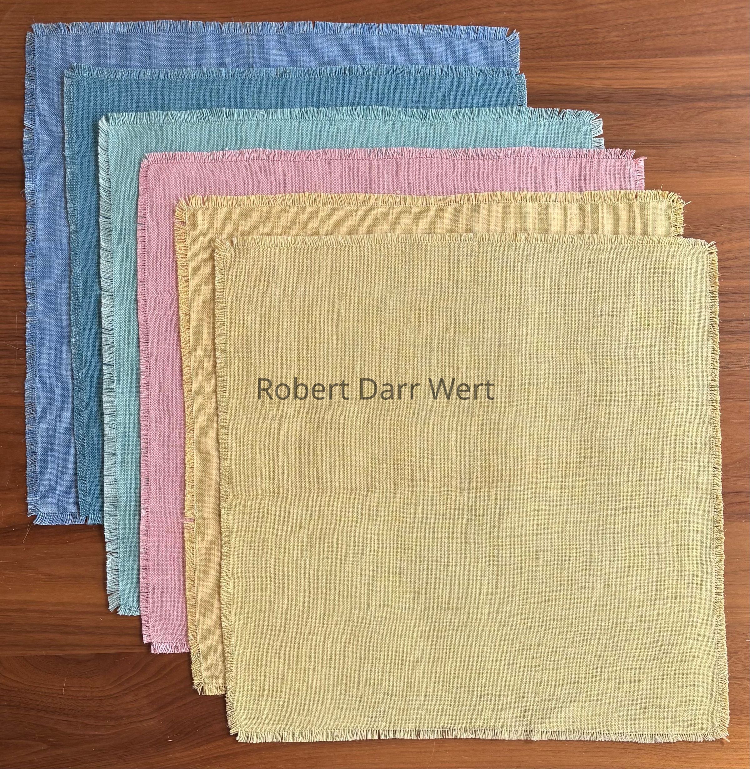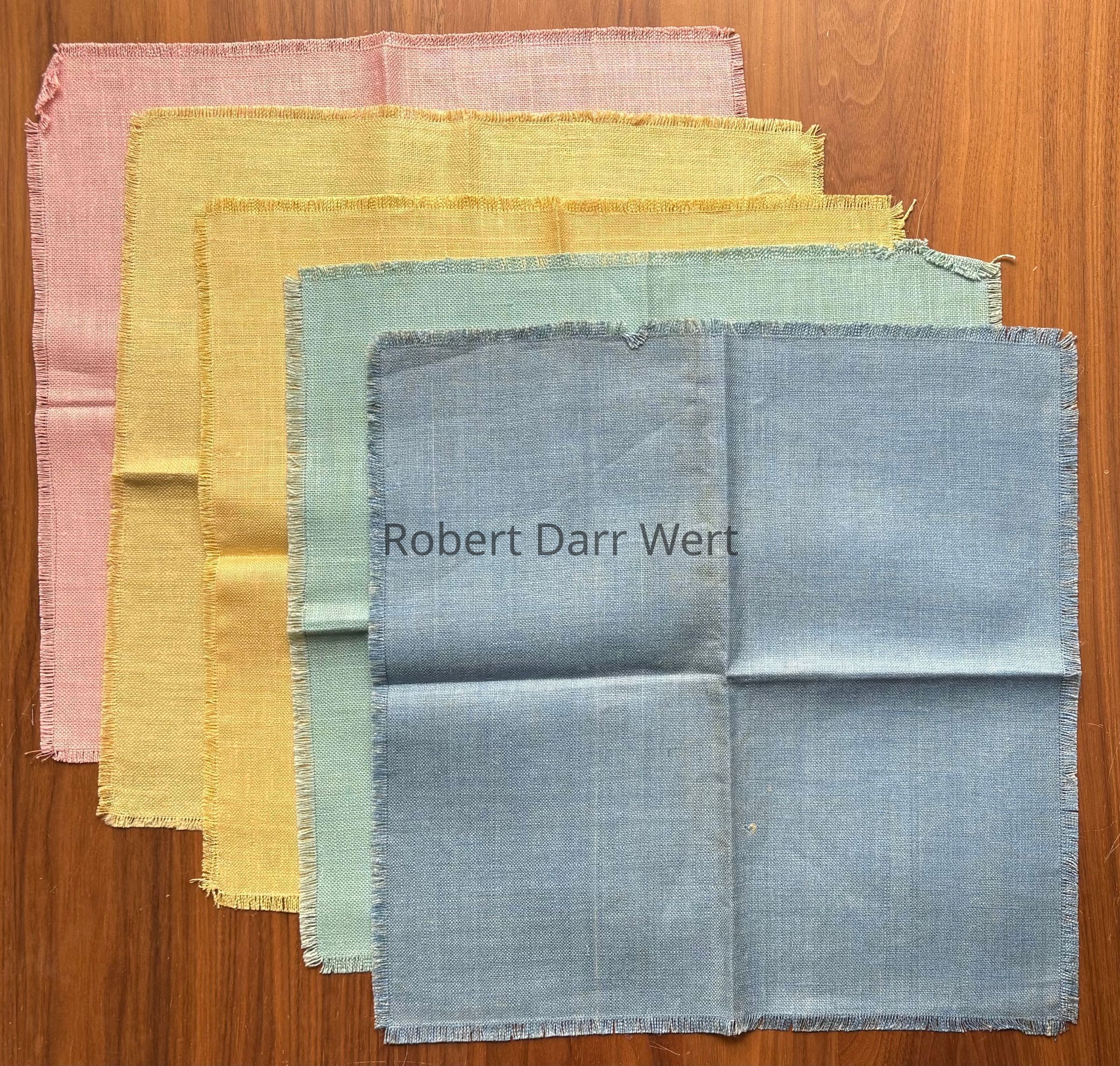 Square solid color linen napkins paired with placemat sets in the late 1940’s and/or early 1950’s. Edges are straight stitched and fringed.Made/Created