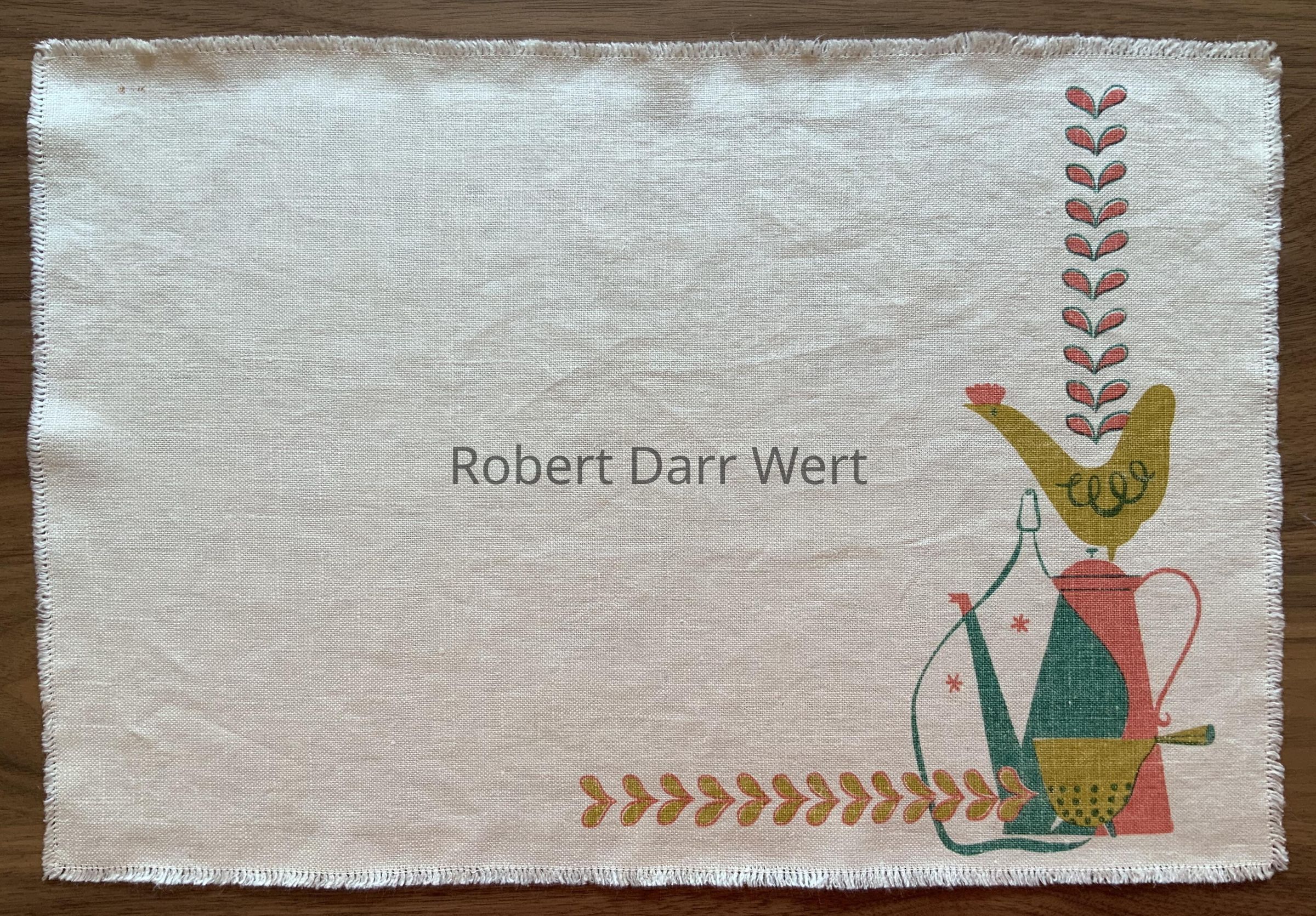 A three-color silkscreen print on off-white linen depicting trailing vines, a chicken, coffee pot, colander and demijohn.