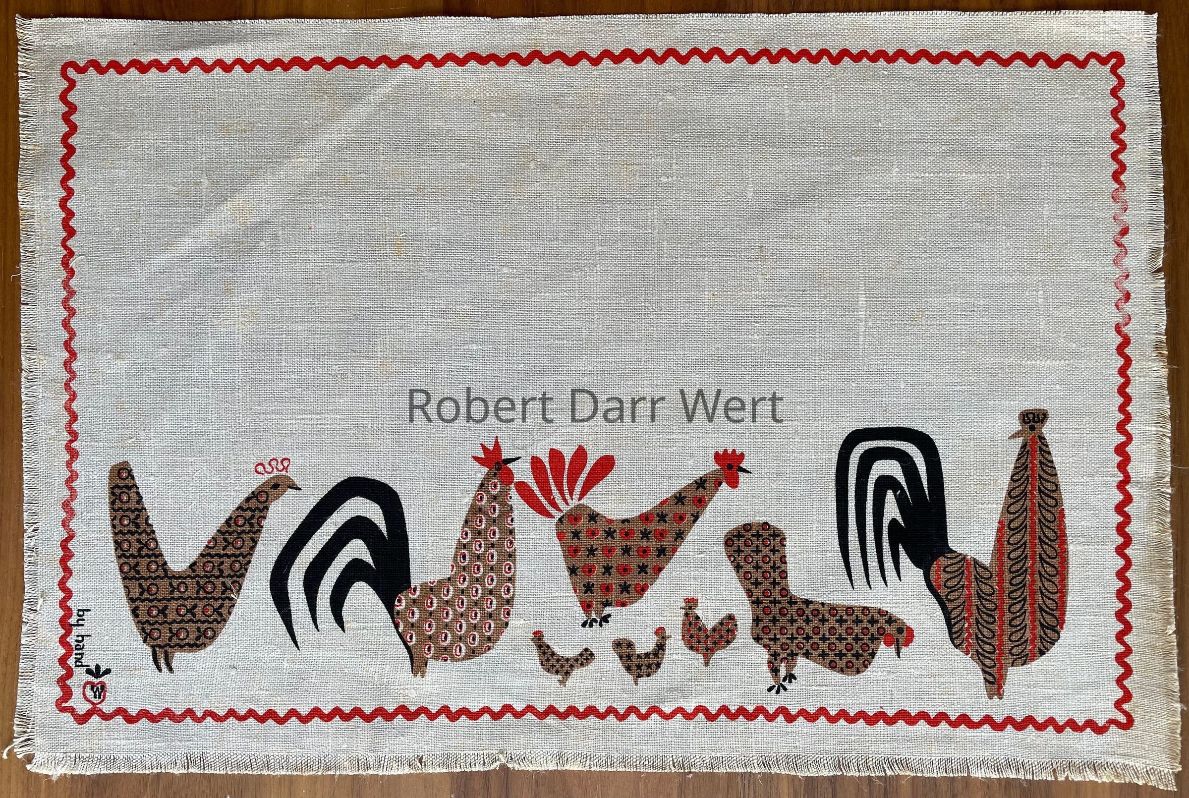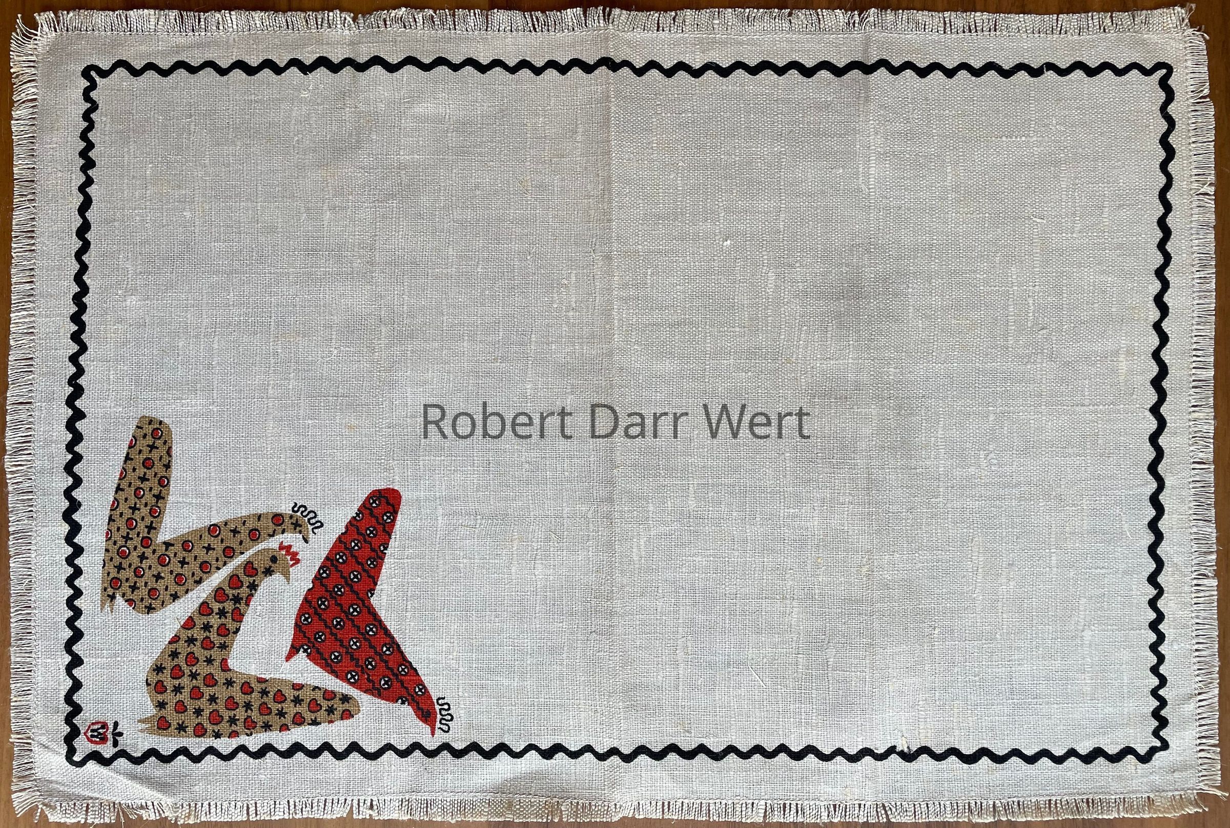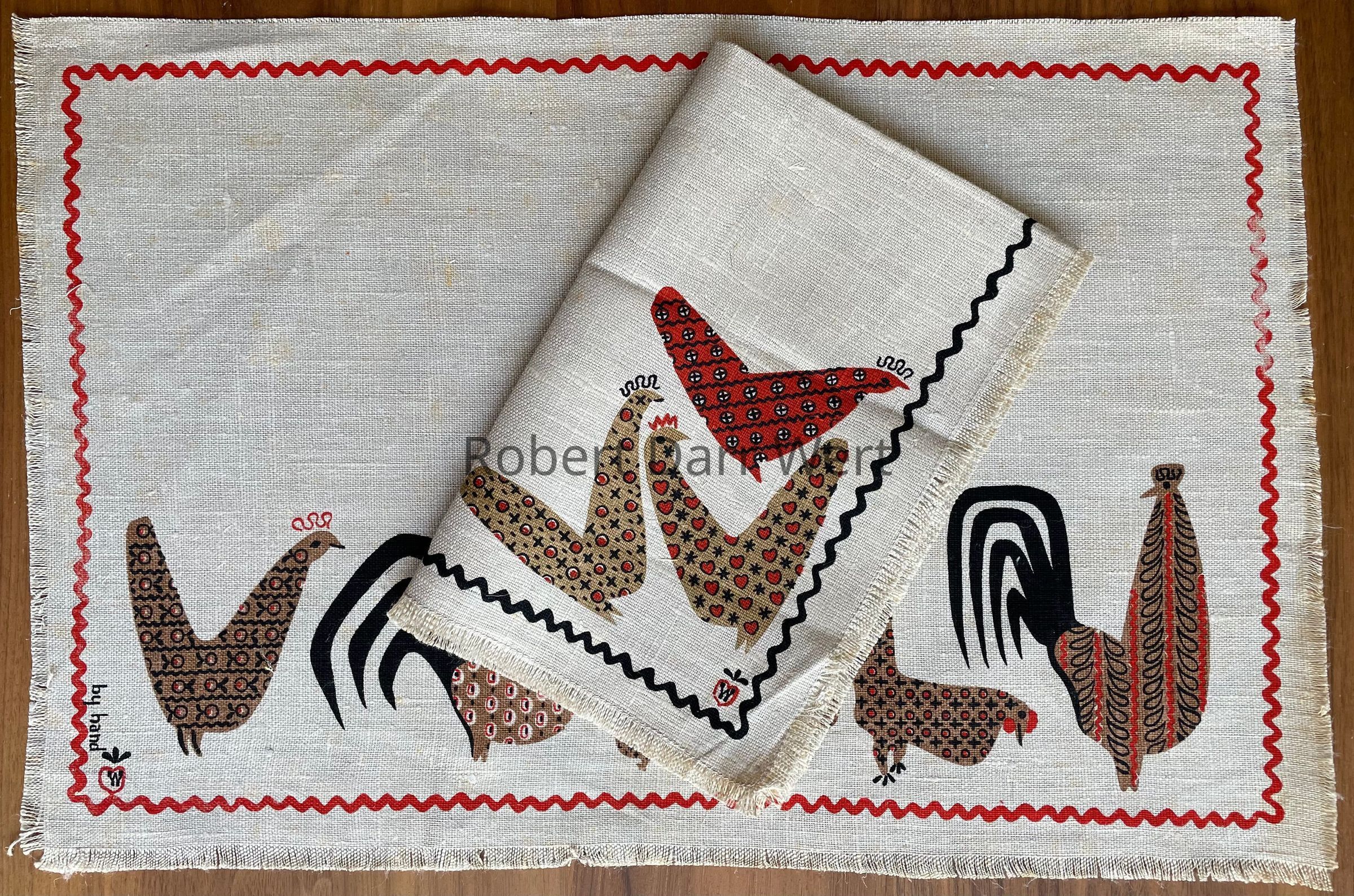A placemat set with two three-color silkscreen prints on natural linen depicting a stylized rooster and flock of hens superimposed with Wert’s interpretation of calico fabric prints. The compositions are framed with a wavy rick-rack style border.
