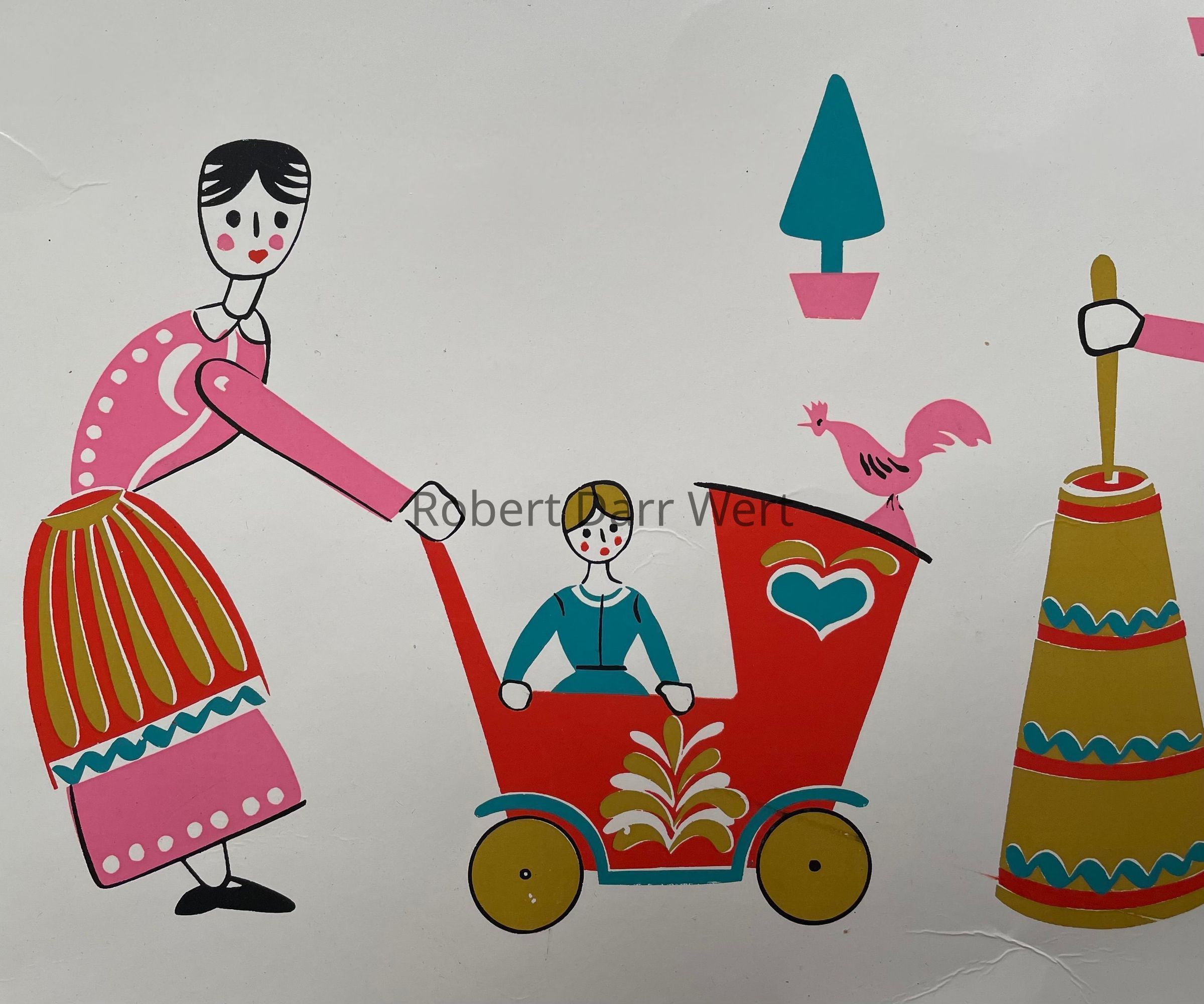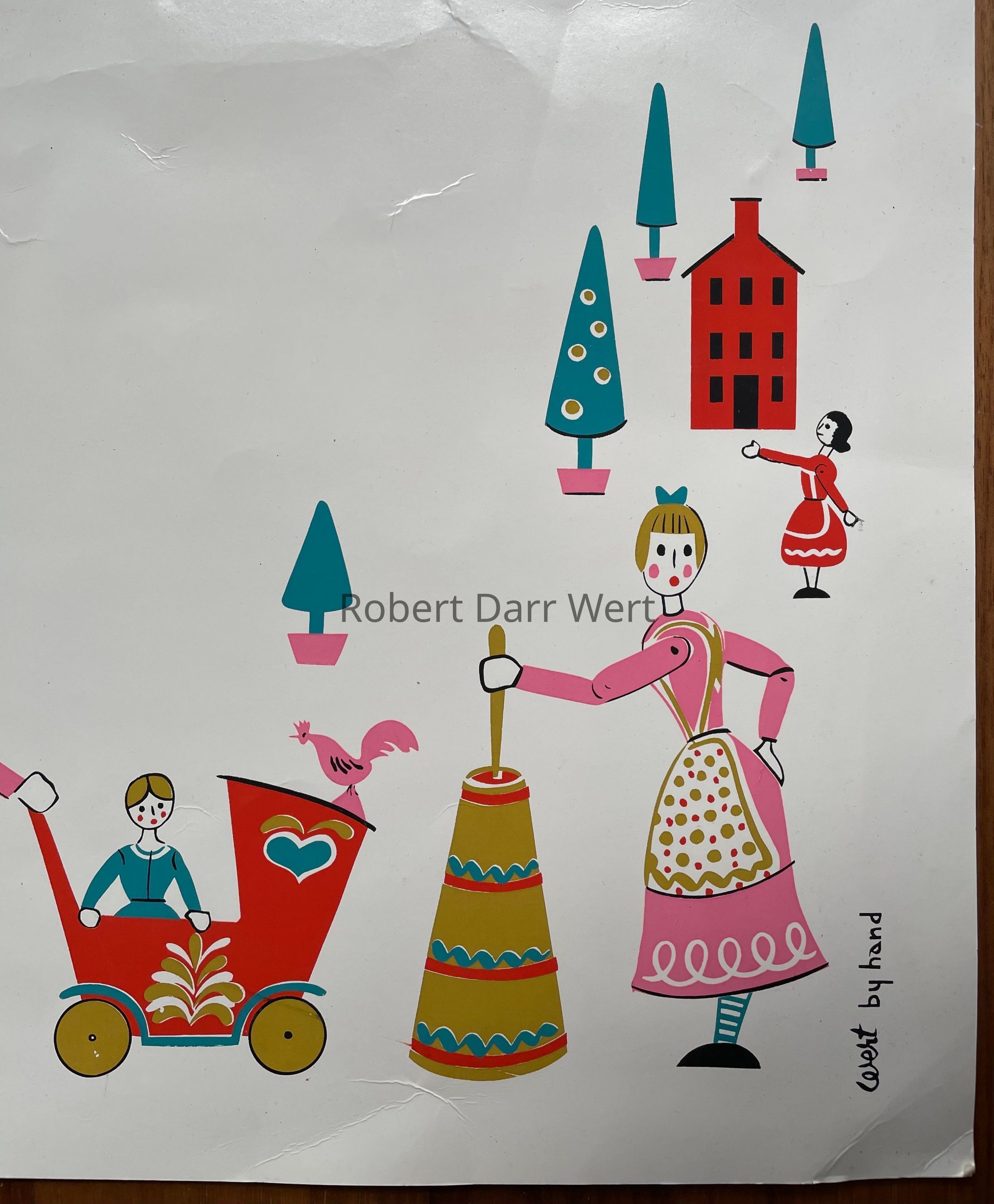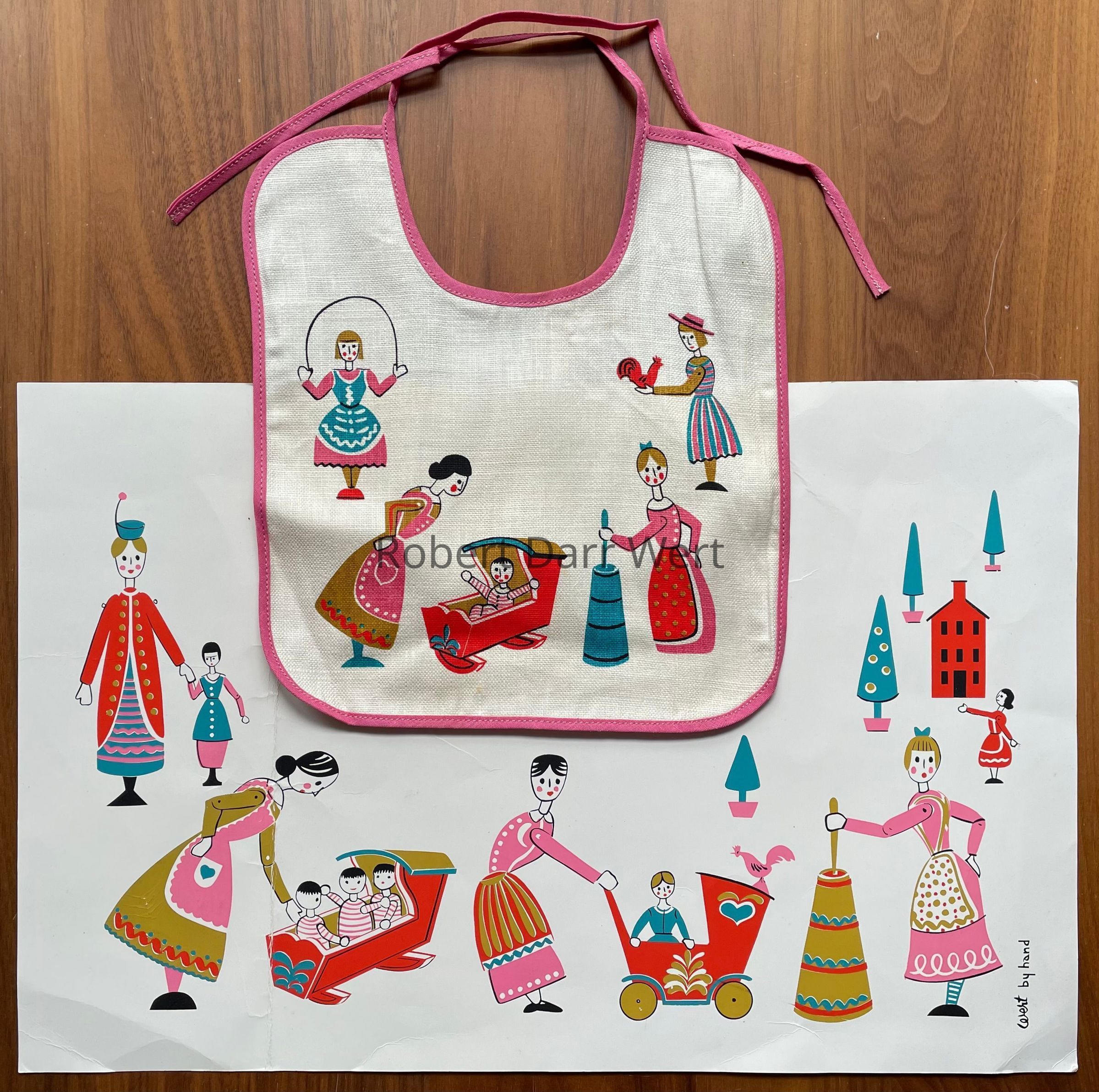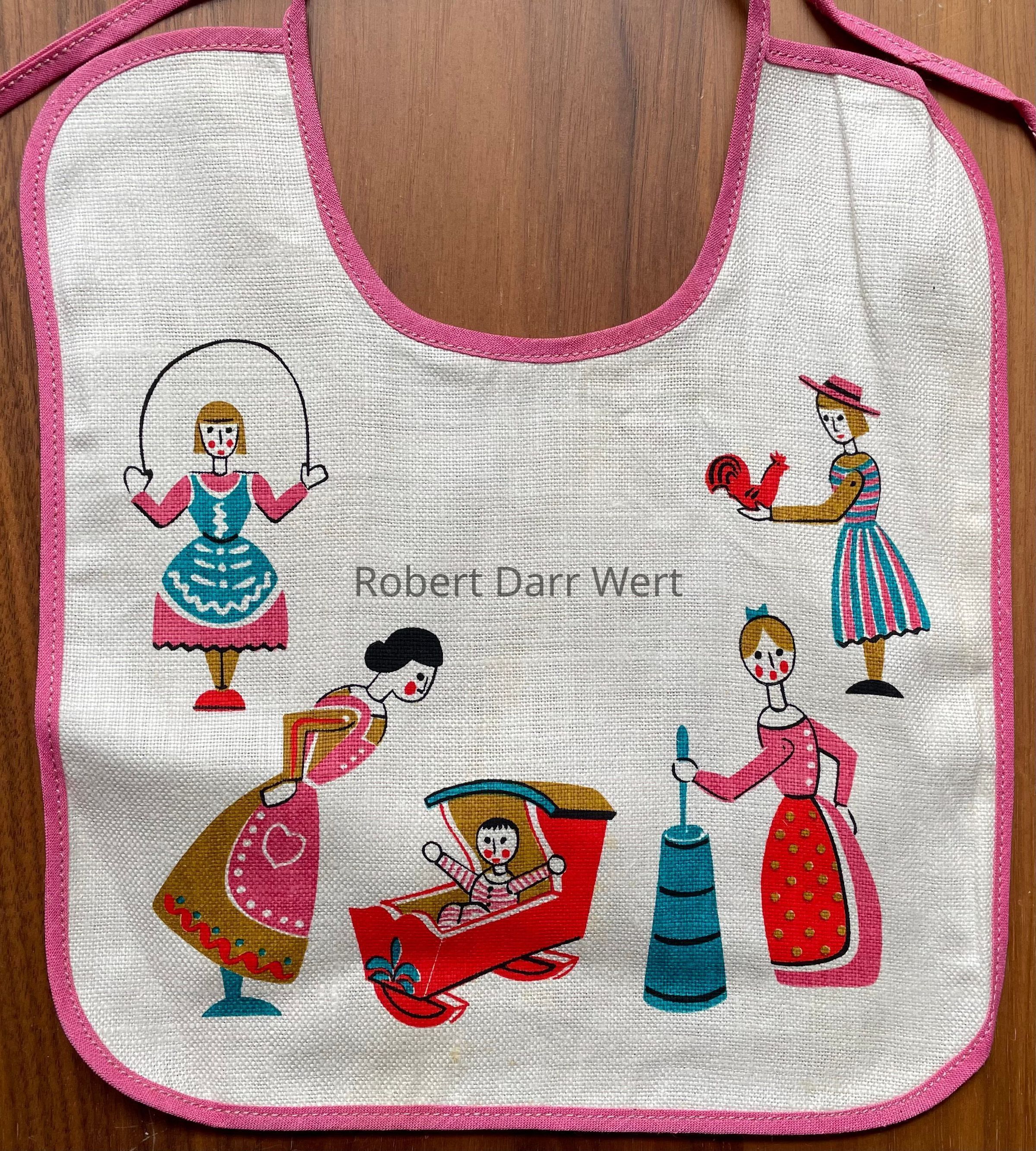 A five-color silkscreen printed children’s placemat and bib set. The placemat is printed on white clay coated cardboard which was laminated for easy cleanup (this example is not laminated). The bib is printed on white linen with a pink border. Imagery is a reimagining of German painted wood toys. This “Dolls” set was intended for girls. A “Hobby Horse” set was produced for boys.