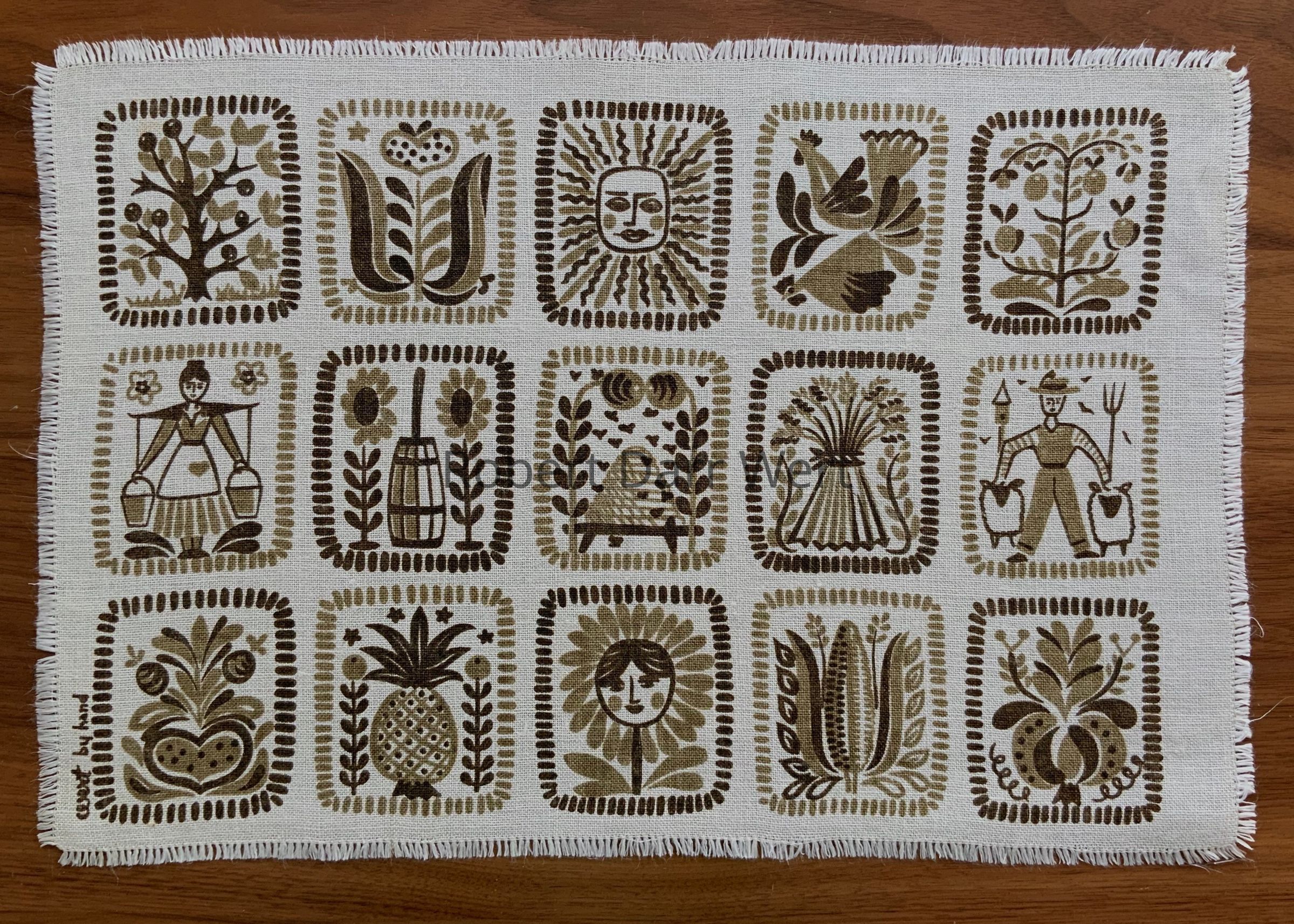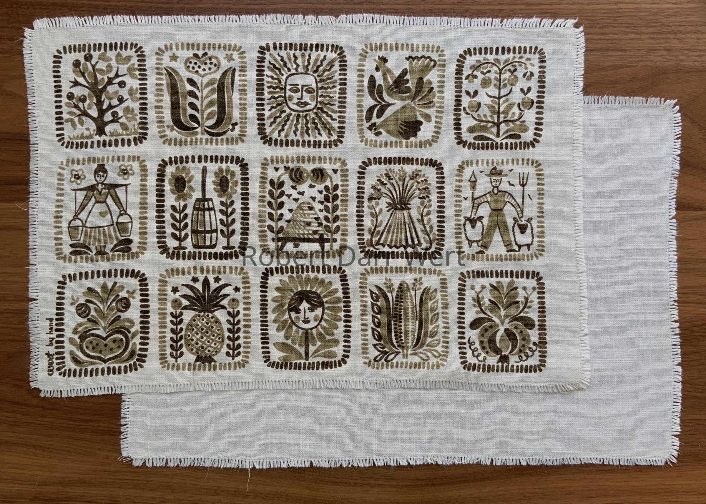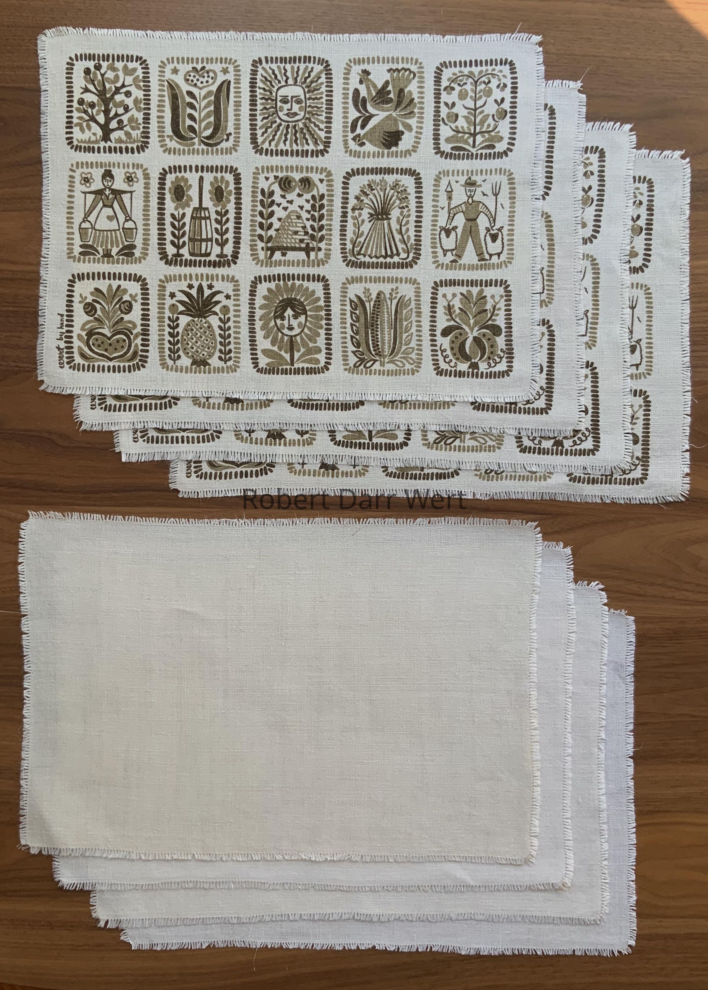 A placemat set with a two-color silkscreen print on off-white linen depicting symbols of farm industry and plenty in fifteen rectangular images (three rows of five). The design is presented as a contemporary ink and brush homage to Pennsylvania Dutch folk art. The unprinted napkins are an off-white linen.