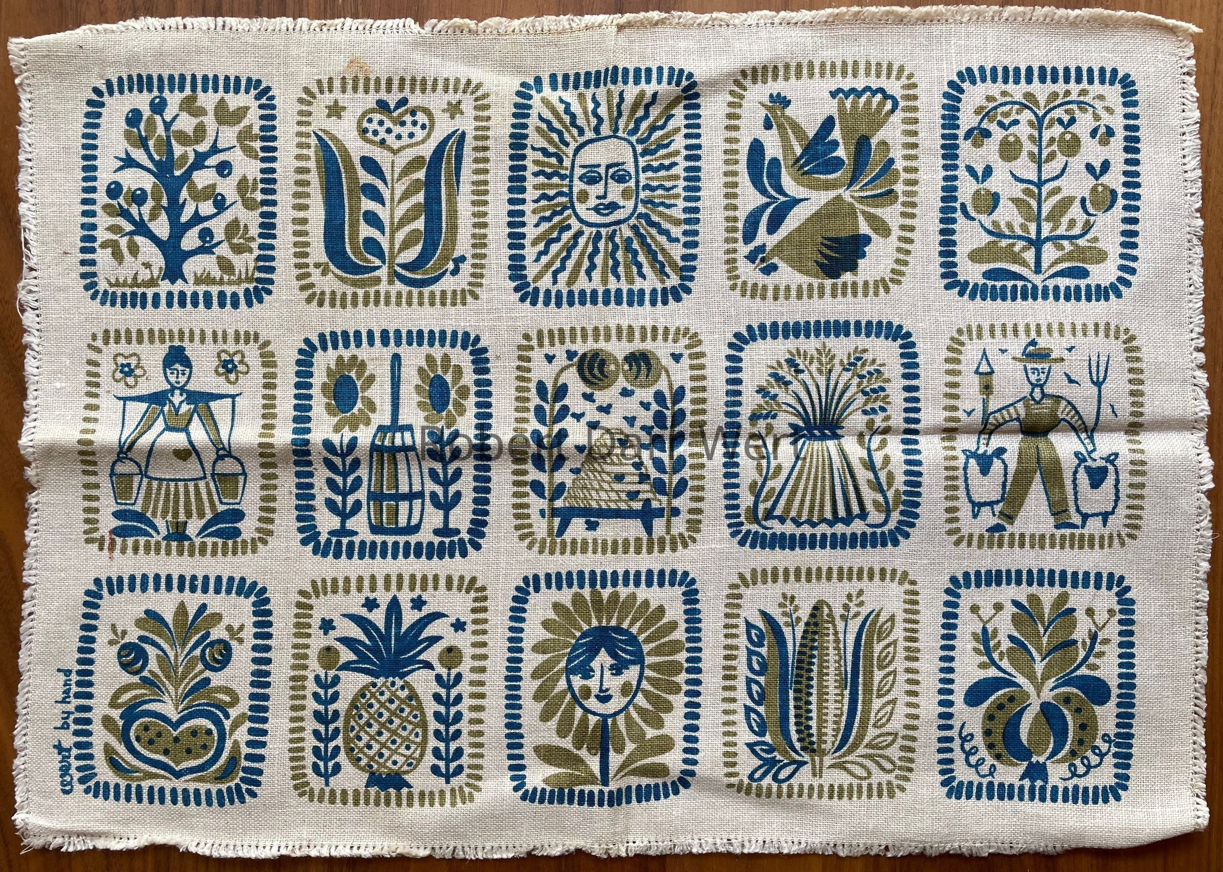 A placemat set with a two-color silkscreen print on off-white linen depicting symbols of farm industry and plenty in fifteen rectangular images (three rows of five). The design is presented as a contemporary ink and brush homage to Pennsylvania Dutch folk art. This set came with solid color white napkins.