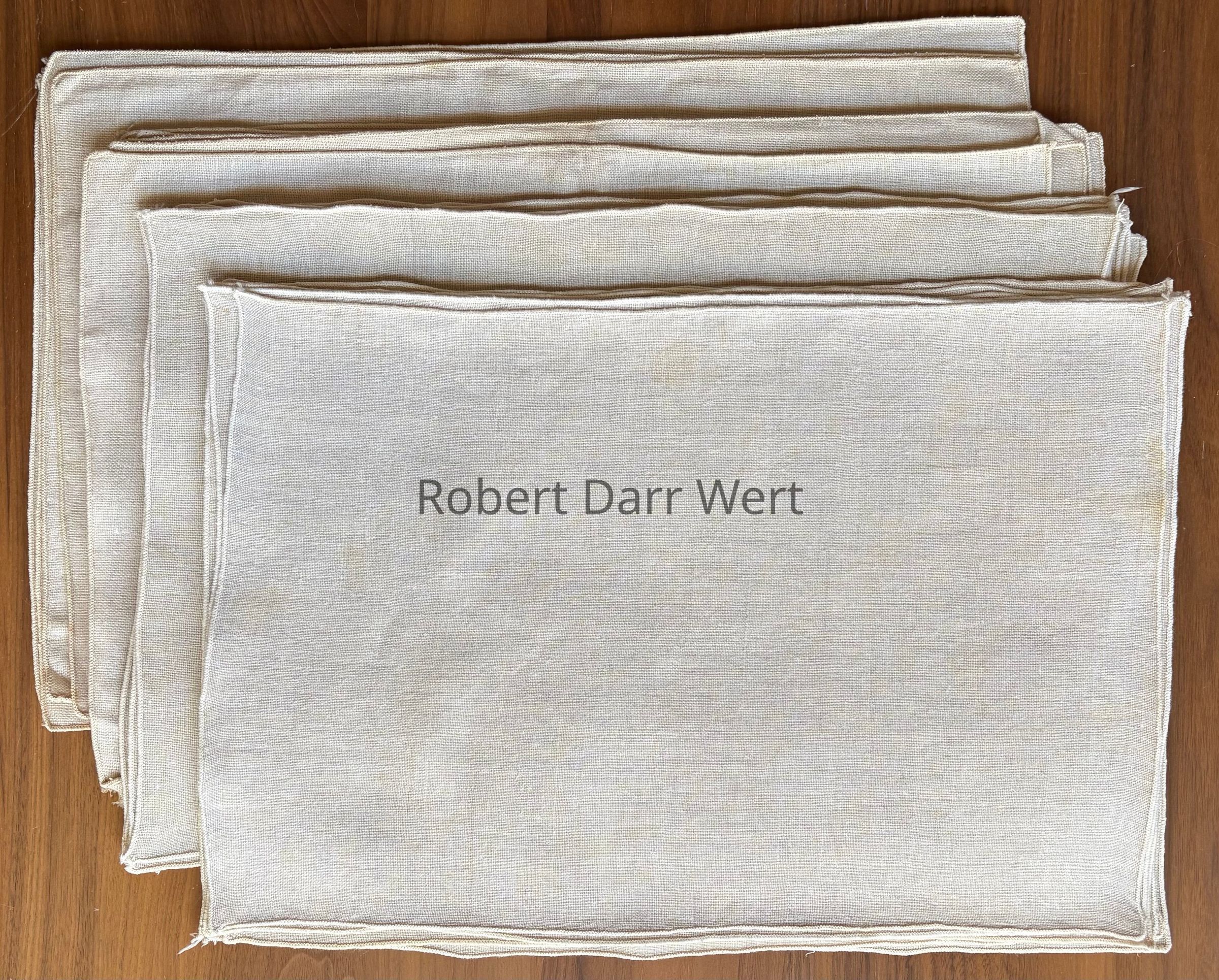 Pre-sewn placemat blanks in off-white linen with serged and bound edges ready for printing. Blanks were sewn for Country Prints at a factory in Jersey City, New Jersey. These blanks were put into use in the early 1960’s as a cost-cutting measure. Prior to using these blanks, placemats were produced with stitched and fringed edges in-house at the Country Prints workshop. The blanks with the bound edges added a more contemporary, streamlined look to the placemat offerings, and were likely easier to cadre for than the fringed mats.
