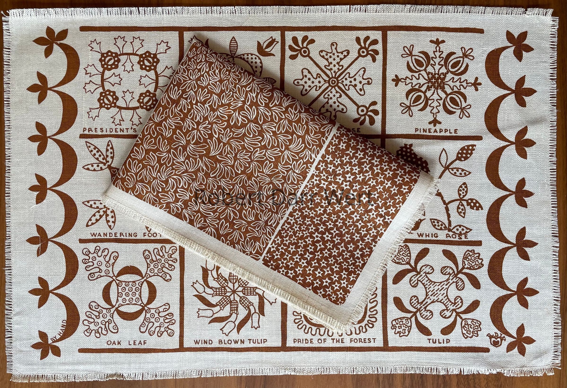 This set is described in a c.1955 Country Prints price list, “Showing 12 identified accurate traditional appliqué patterns — Calico swatches on Napkins. On White Linen in Indigo, Turkey Red or Tobacco Brown.”