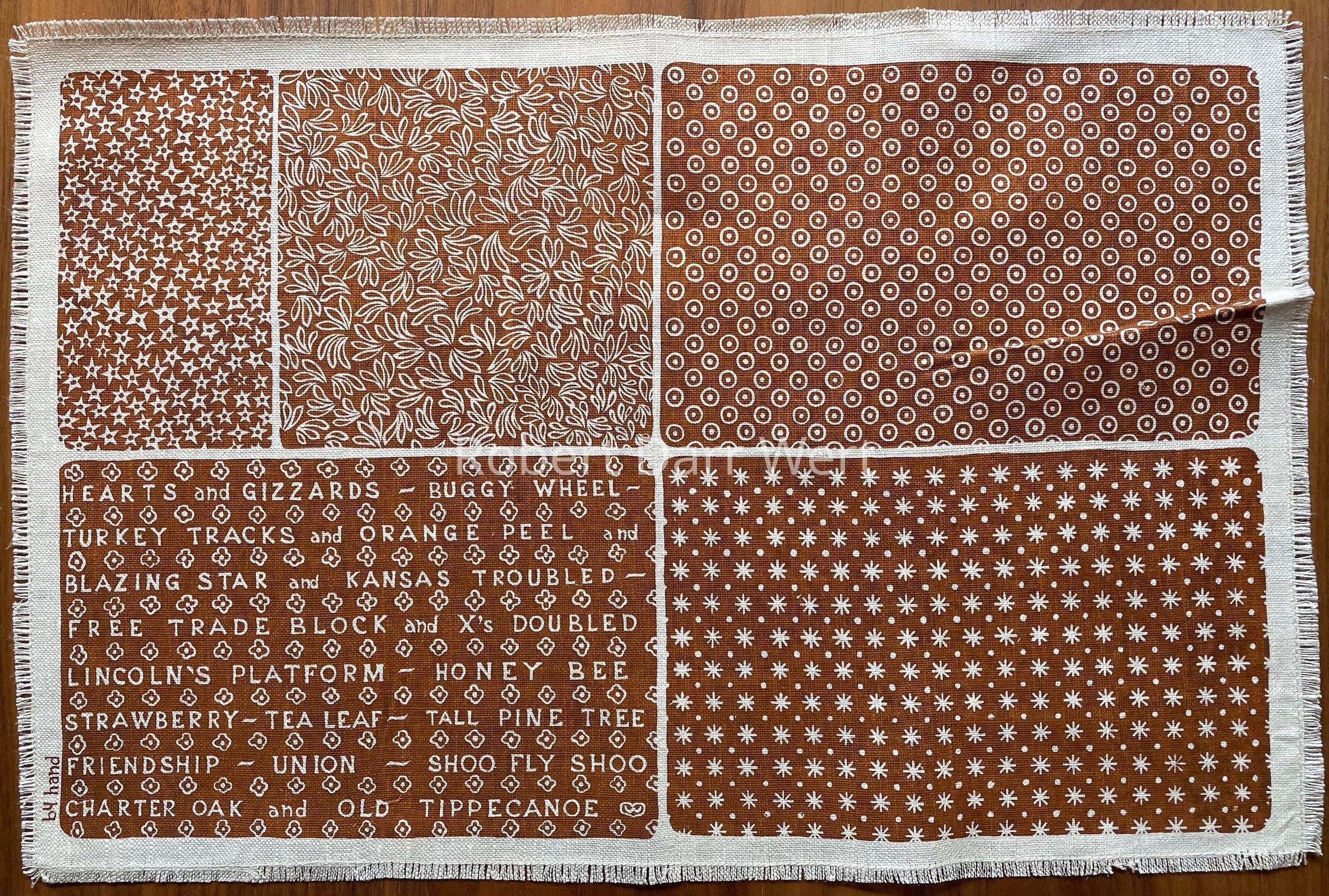 Napkin: five fields depicting Wert’s interpretation of calico prints and a poem referring to names of quilt block patterns: