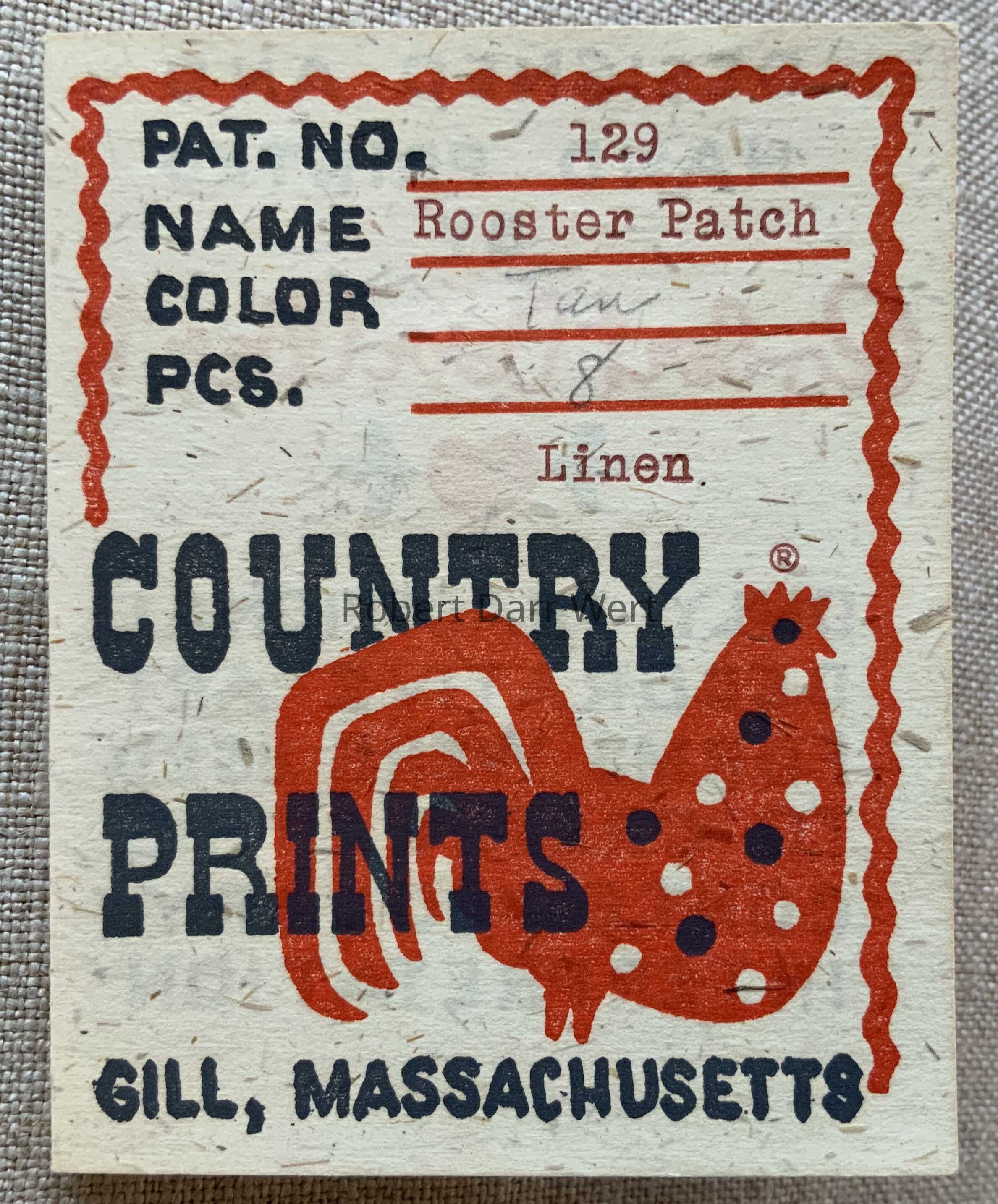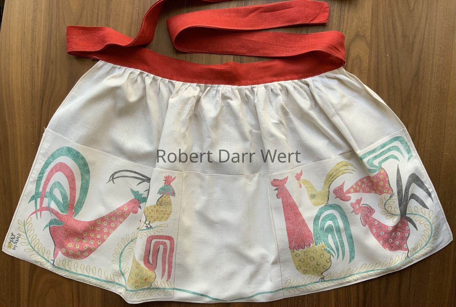 This set is described in a c.1955 Country Prints price list, “Gay variations on our original theme. This has been called “sophisticated”! Bright Red, Clear Aqua, Chartreuse and Black on heavy white or natural. Apron to match, #420 Sourwood Mountain.”