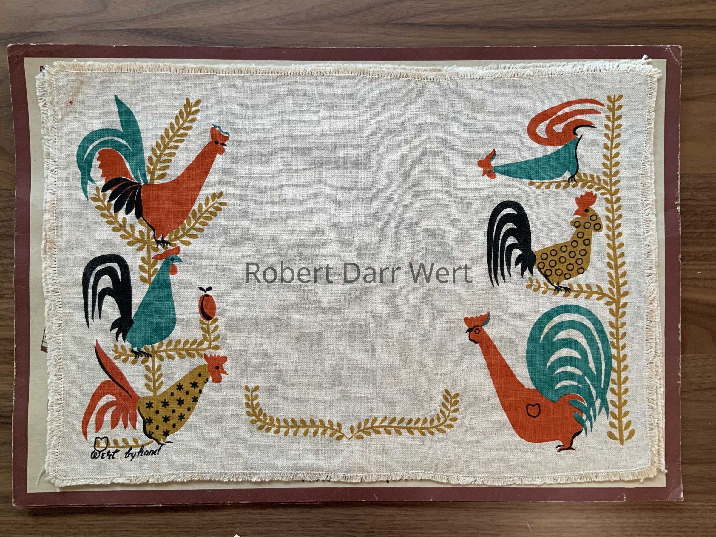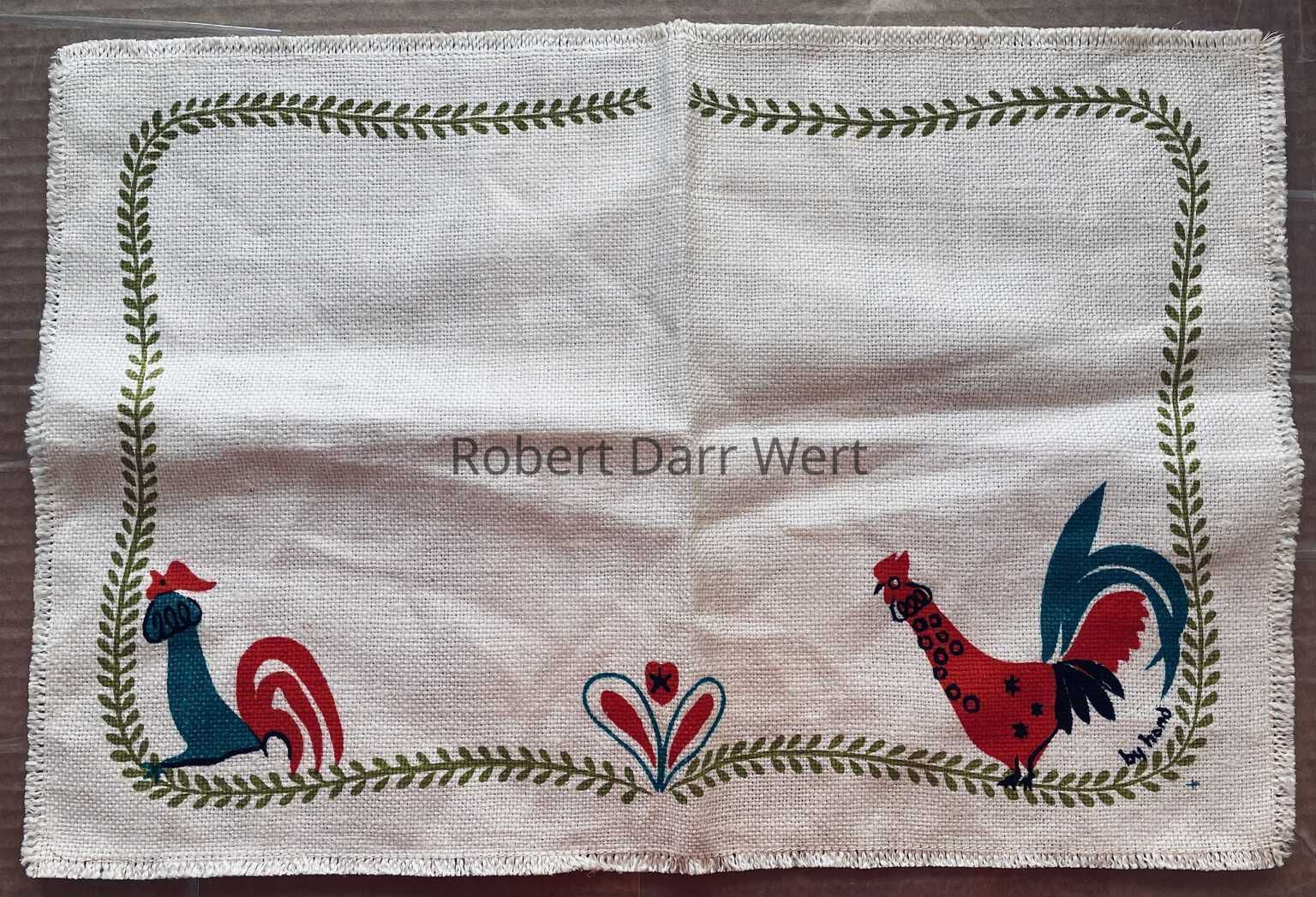 Placemat: Three roosters perch on each side of the mat look toward the center as if scoping the contents of a dinner plate. Four roosters have solid color bodies, two are patterned in Wert’s interpretation of calico prints, another has his squared heart in place of a wing. An apple tops a branch on the left side.