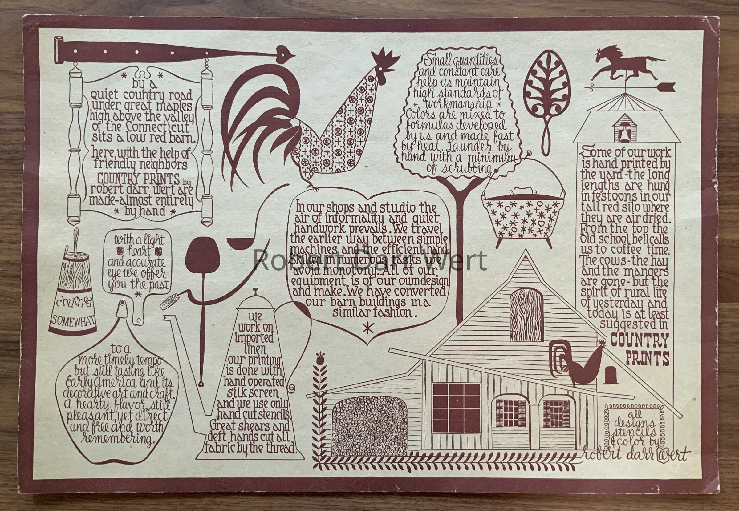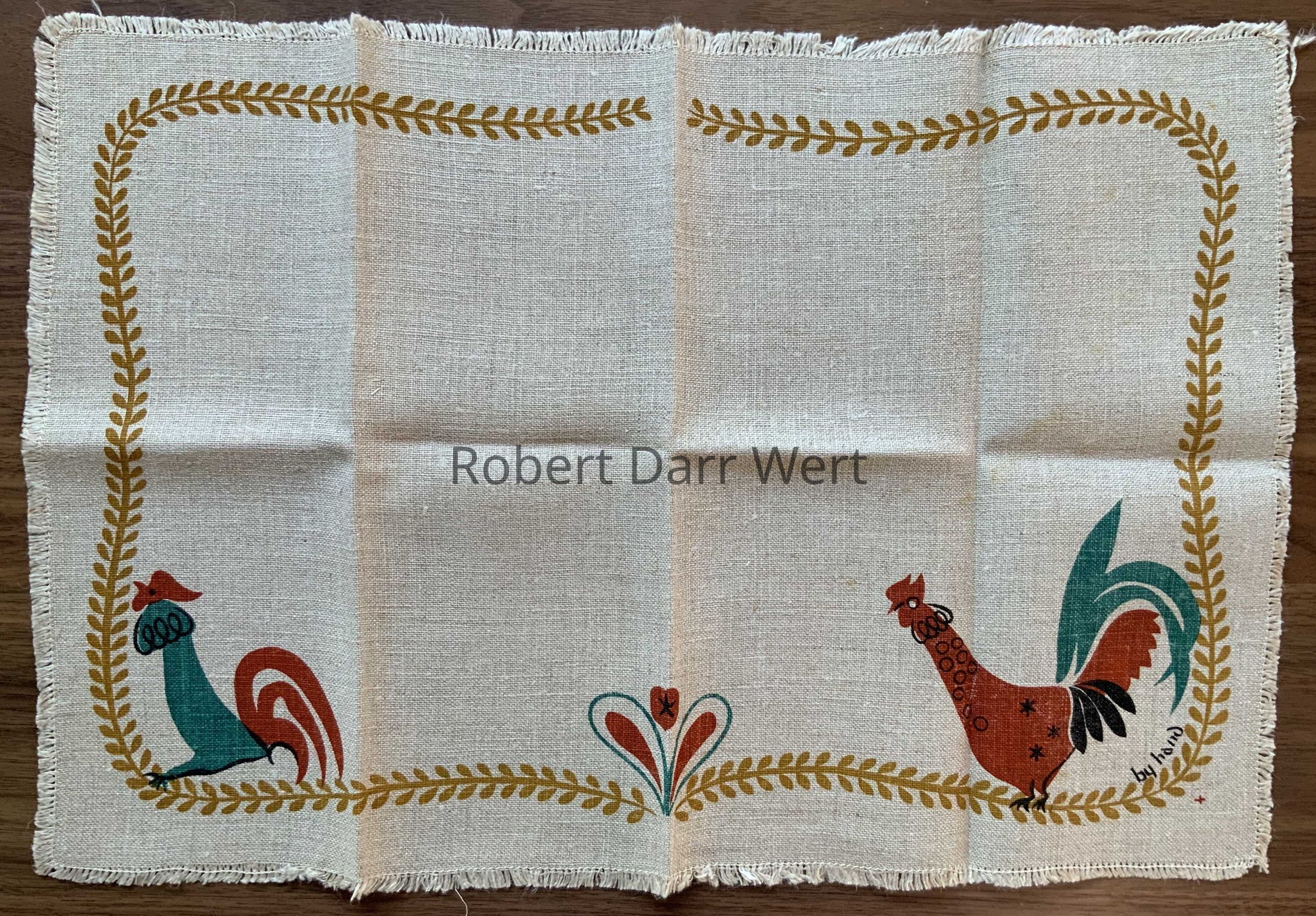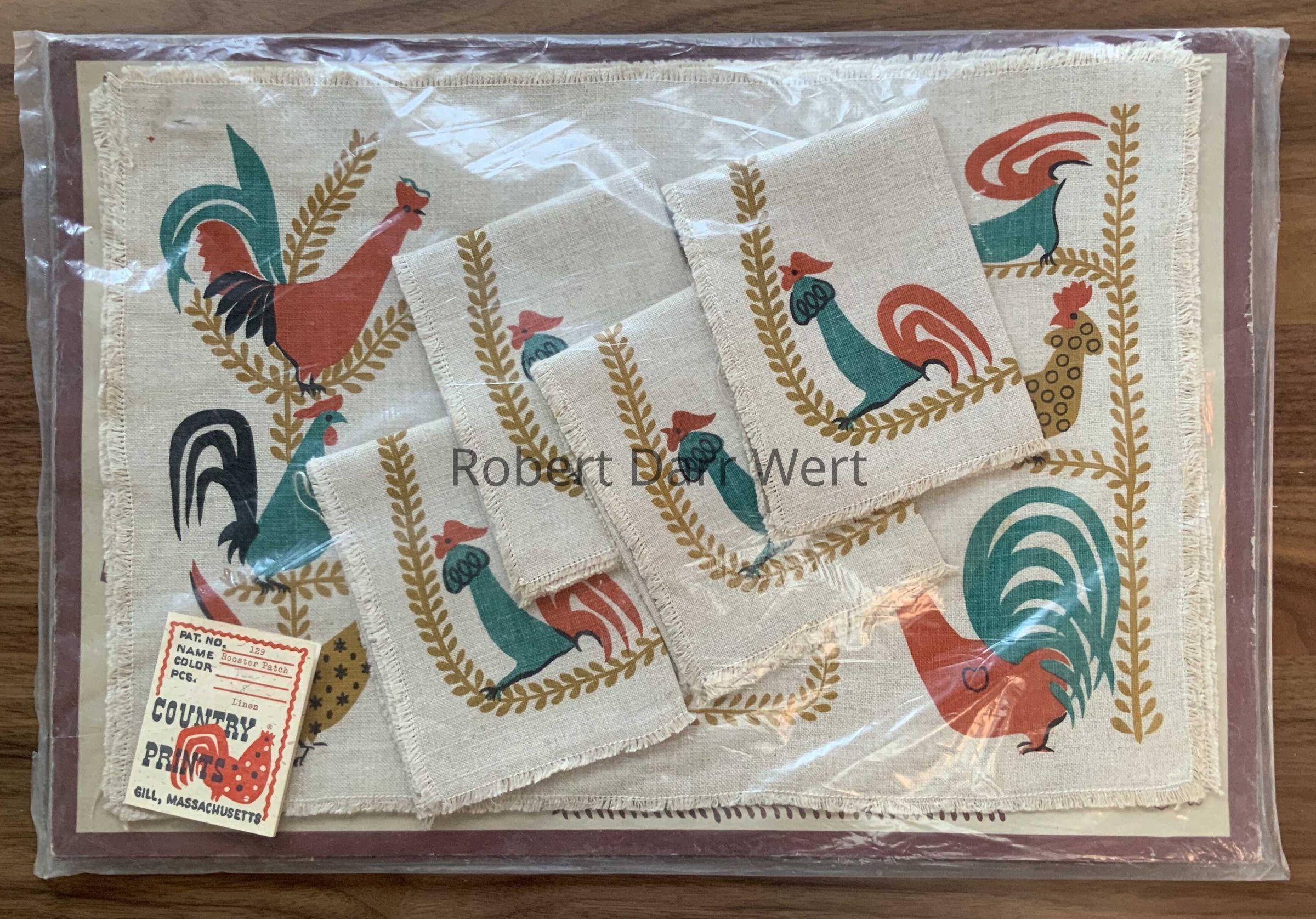 This set appears in the c.1955 brochure “Country Prints Mat Sets and Luncheon Squares by Robert Darr Wert”. It was produced in two colorways: red, mustard, and black on natural linen (this example), and red, blue-green, and black on white linen (see separate entry); see images.