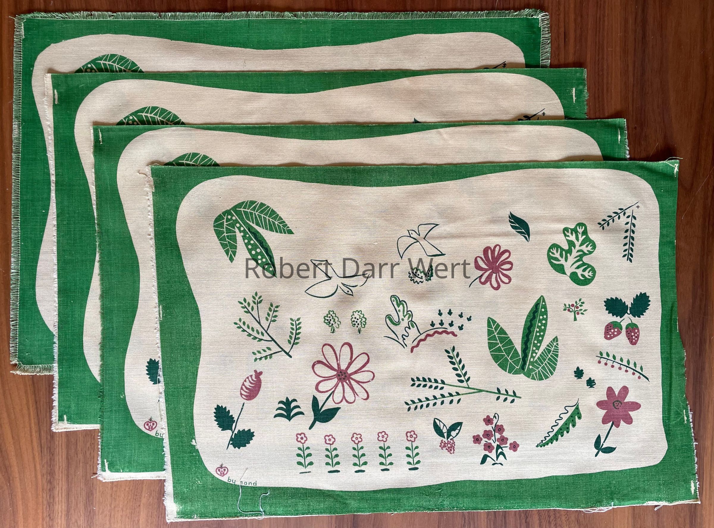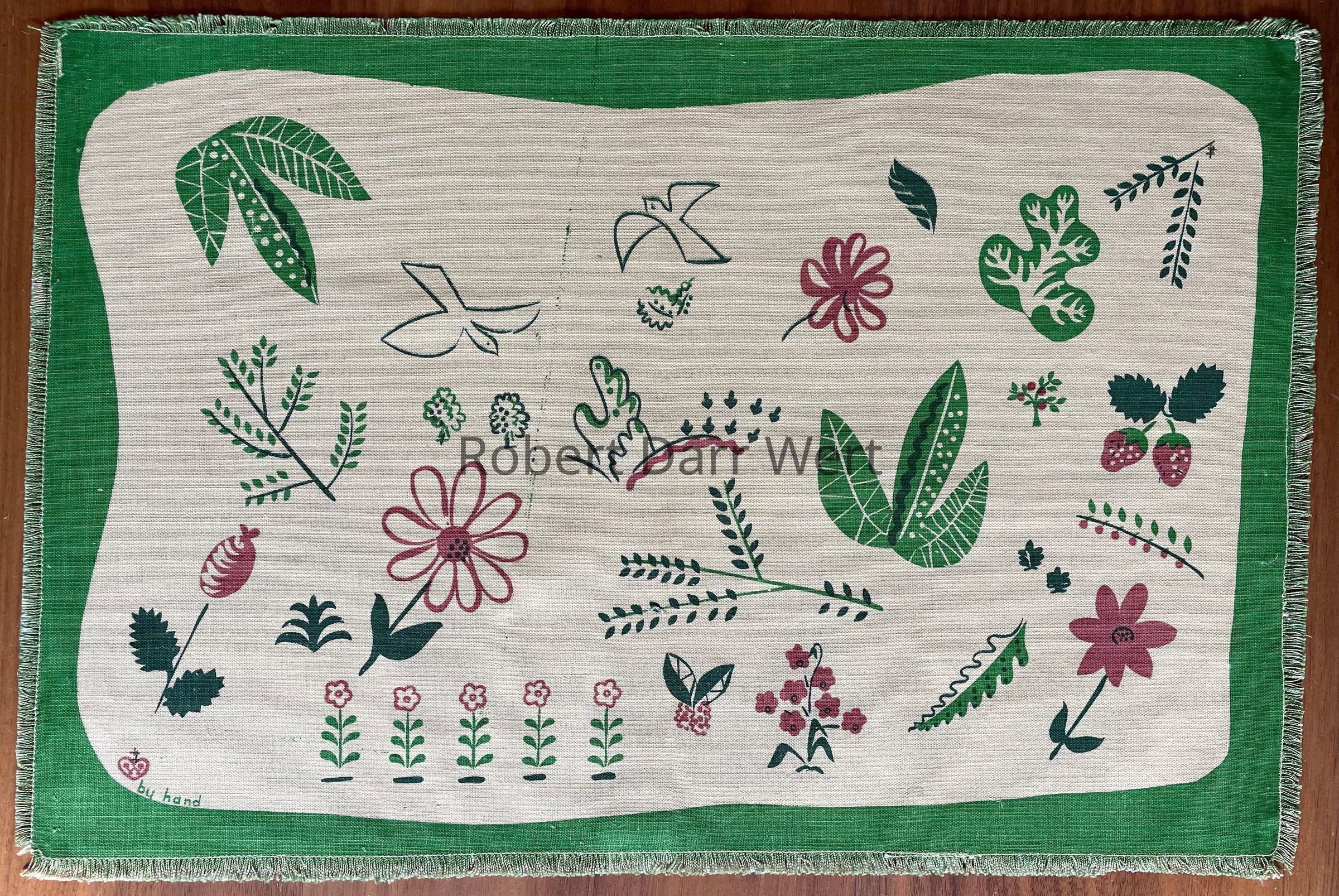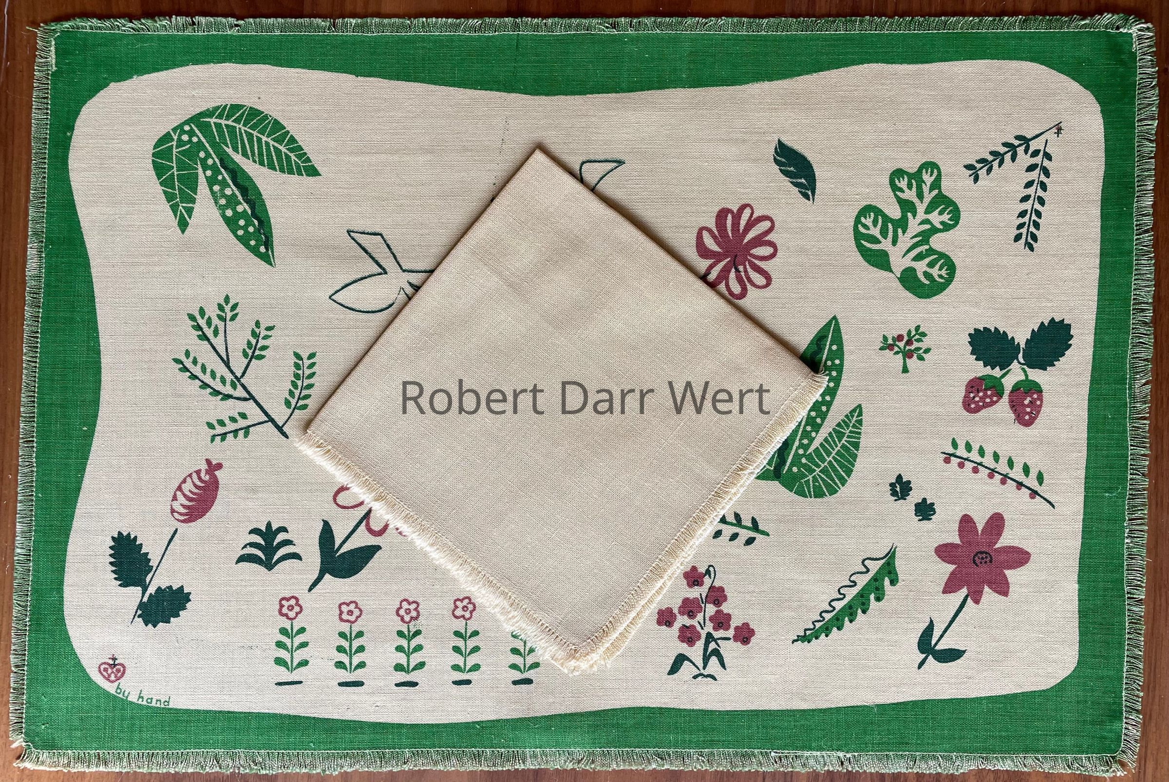 Placemat: “w” in heart, and “by hand”, lower left corner.Material