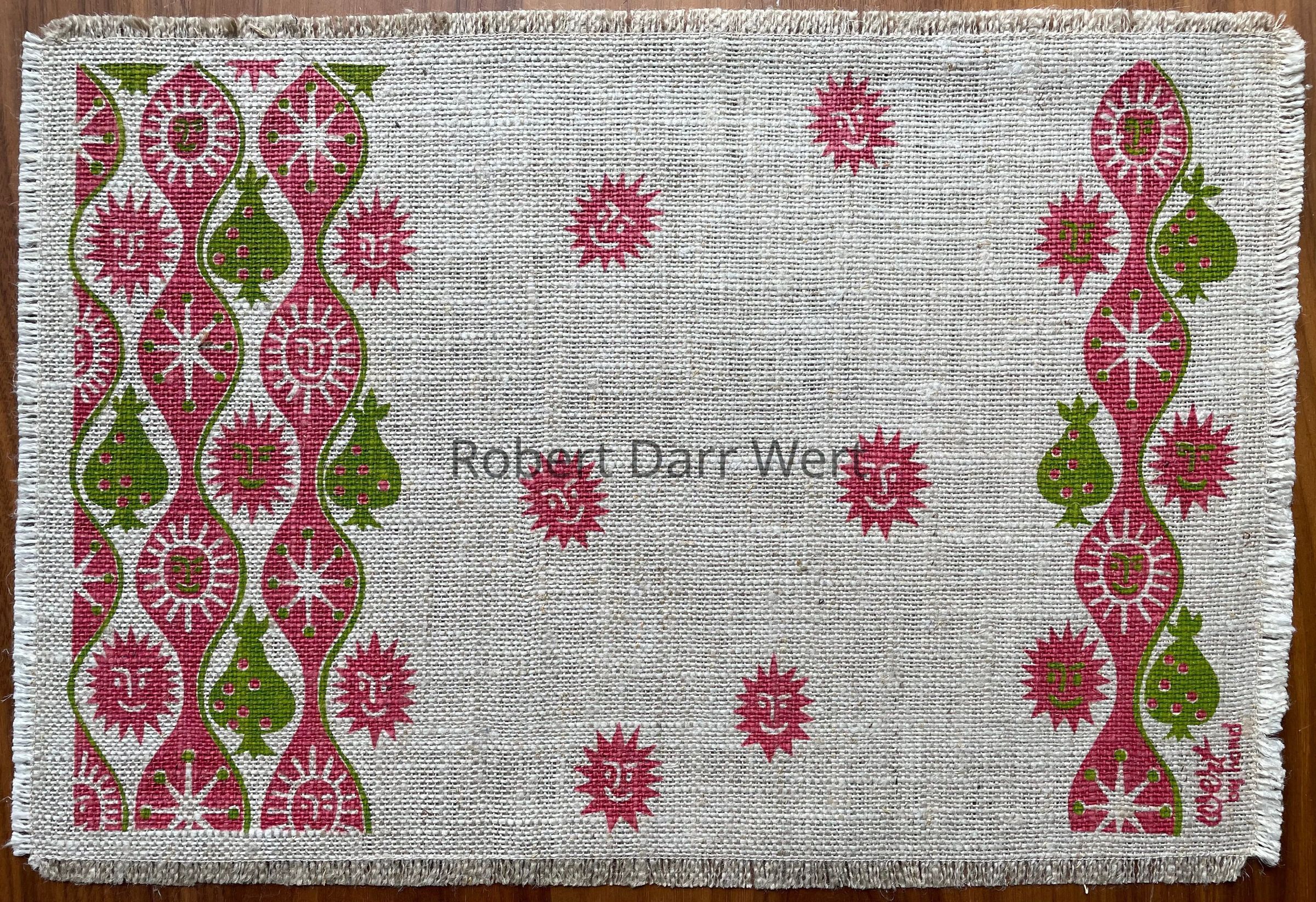 This placemat set is described in two colorways on the Spring 1958 Country Prints price list, “Pink & Green or Red & Gold on heavy textured linen.”
