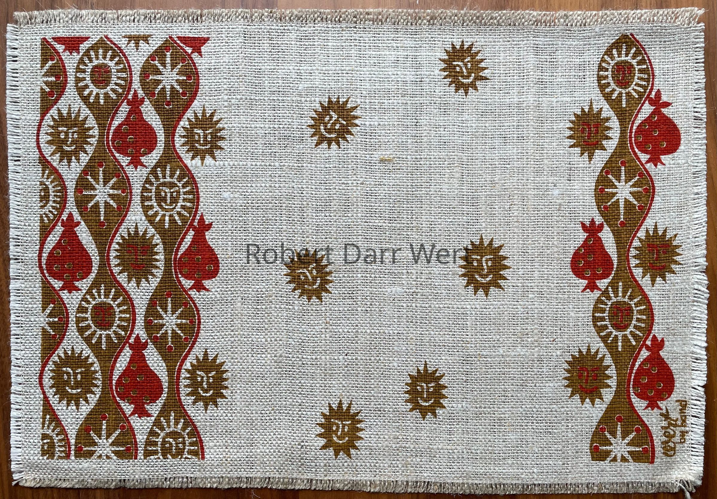 This placemat set is described in two colorways on the Spring 1958 Country Prints price list, “Pink & Green or Red & Gold on heavy textured linen.”