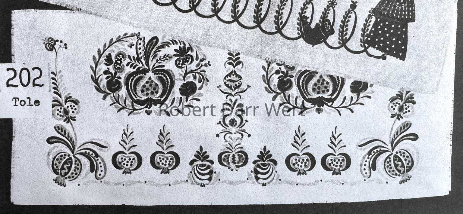 A placemat set with two silkscreen print designs on linen depicting motifs typically found on painted toleware (painted tin).