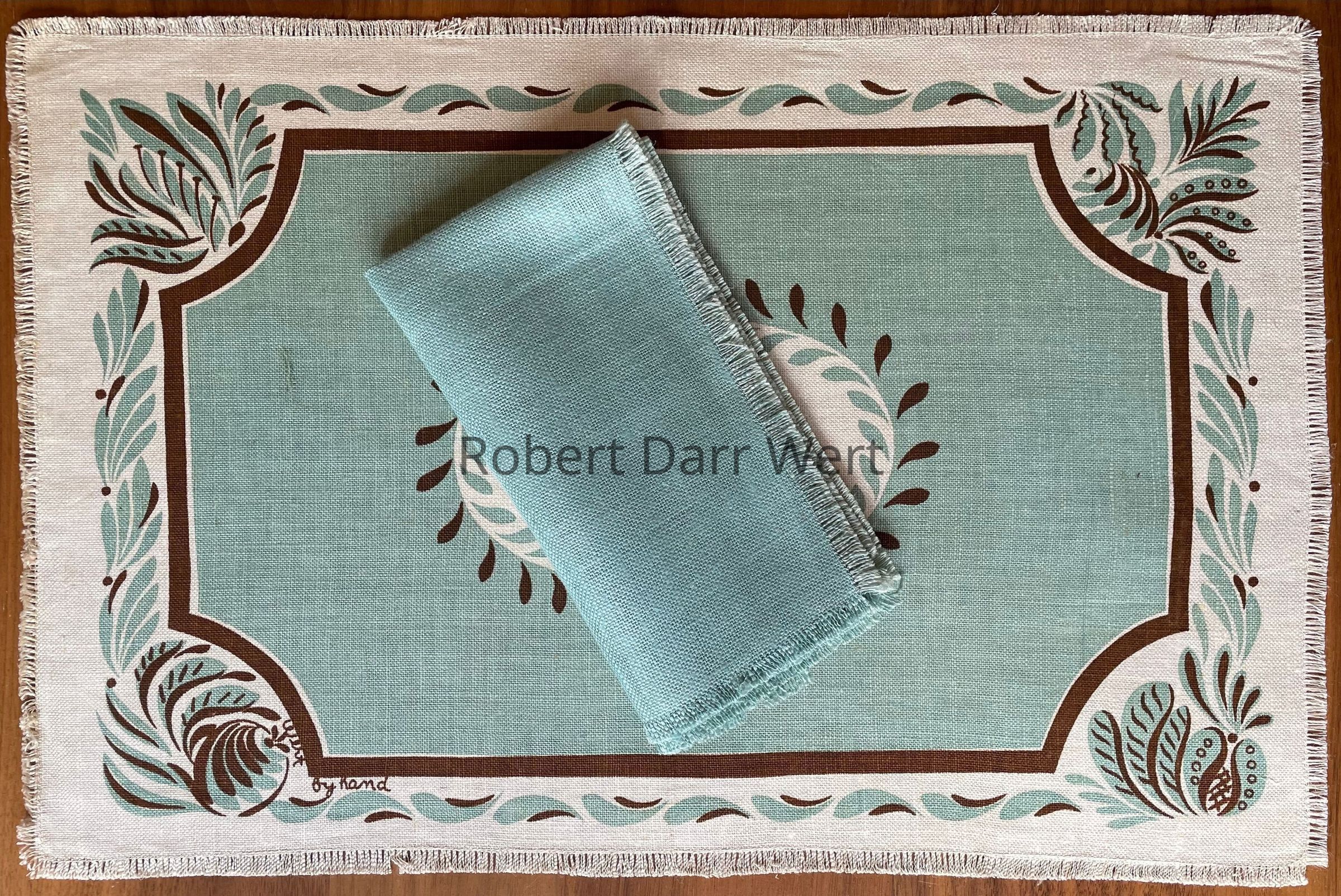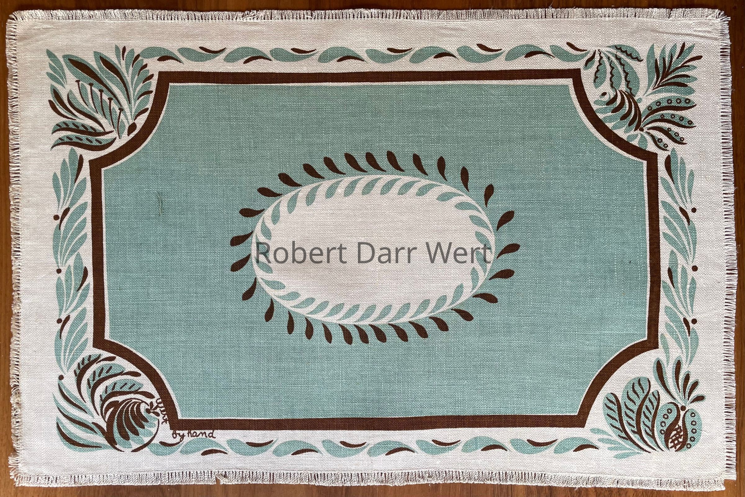 A placemat with a two-color silkscreen print on white linen depicting plant life and borders rendered in the manner of painted tin or toleware. It was produced in at least three colorways: yellow, aqua, or pink.