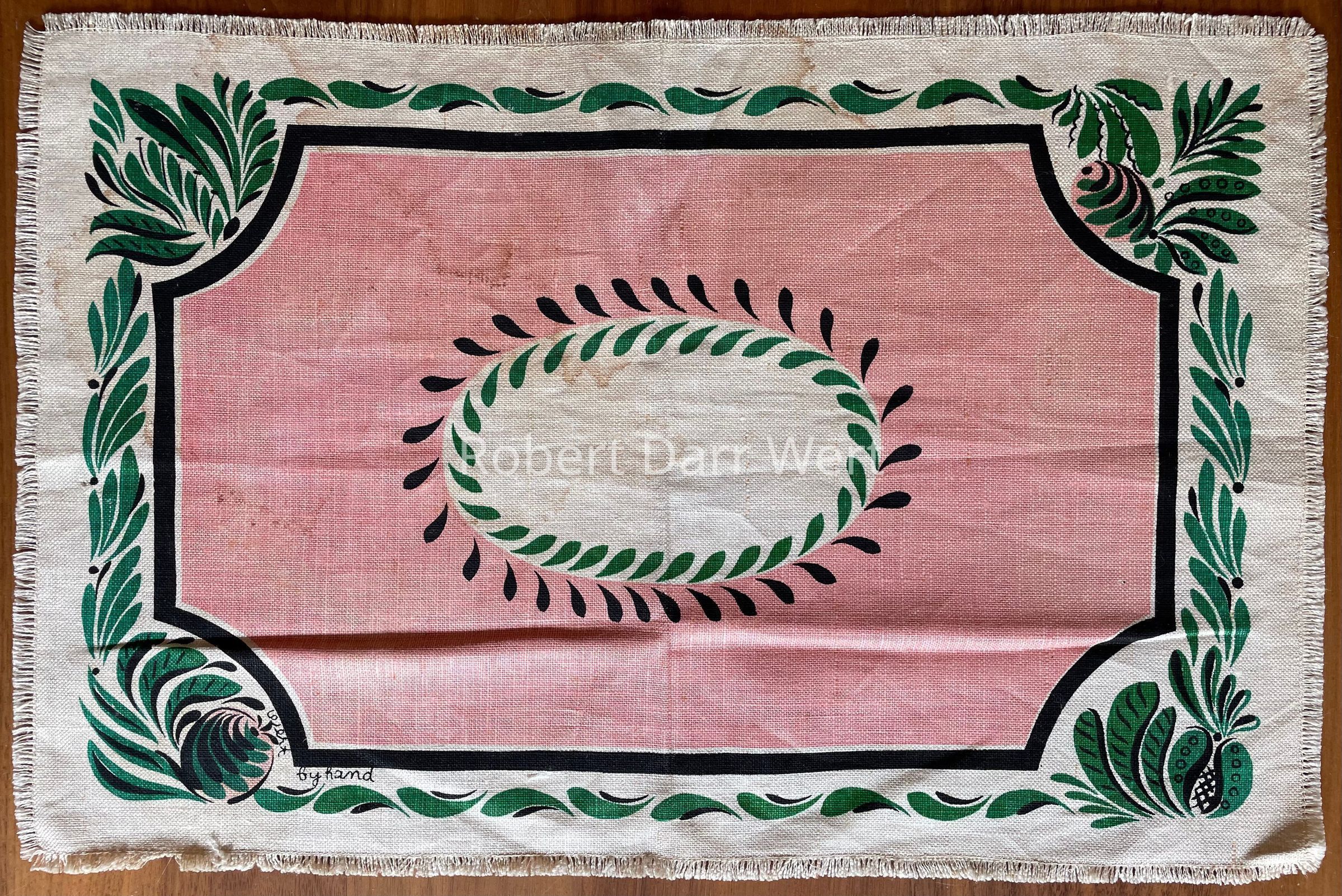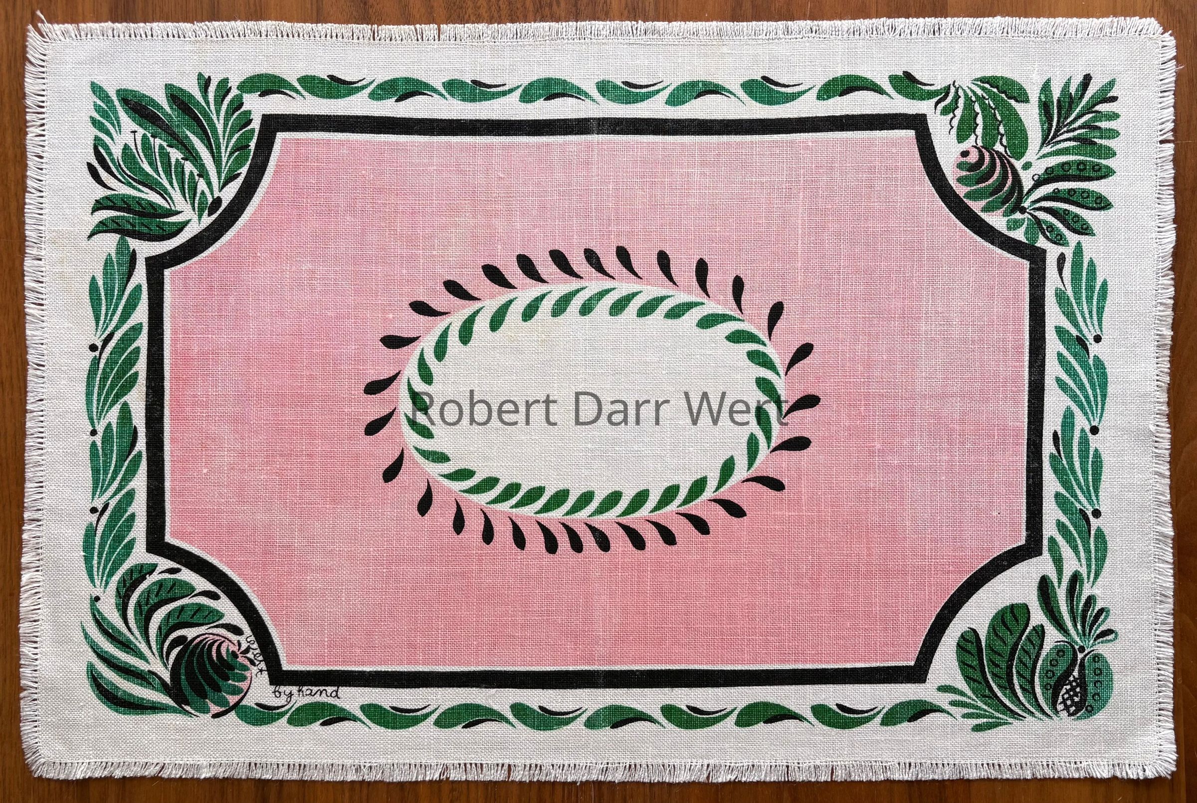 A placemat with a three-color silkscreen print on white linen depicting plant life and borders rendered in the manner of painted tin or toleware. It was produced in at least three colorways: yellow, aqua, or pink.