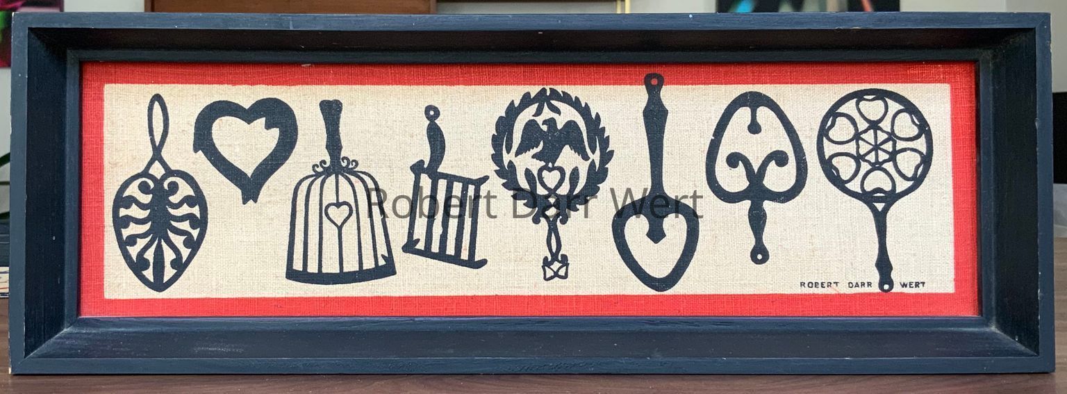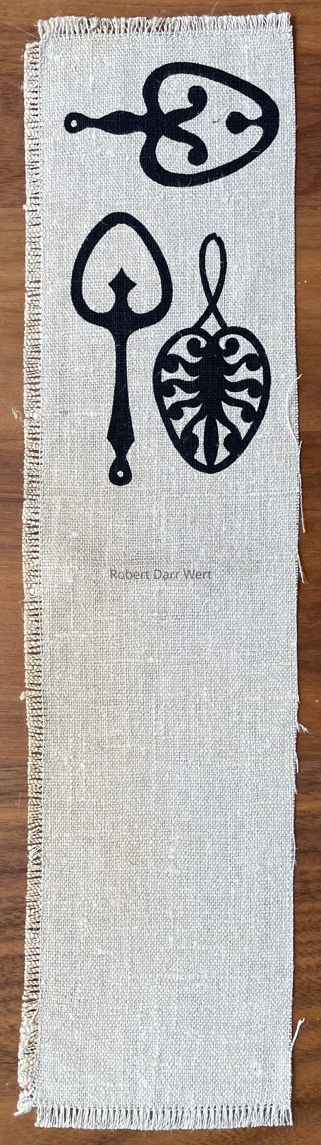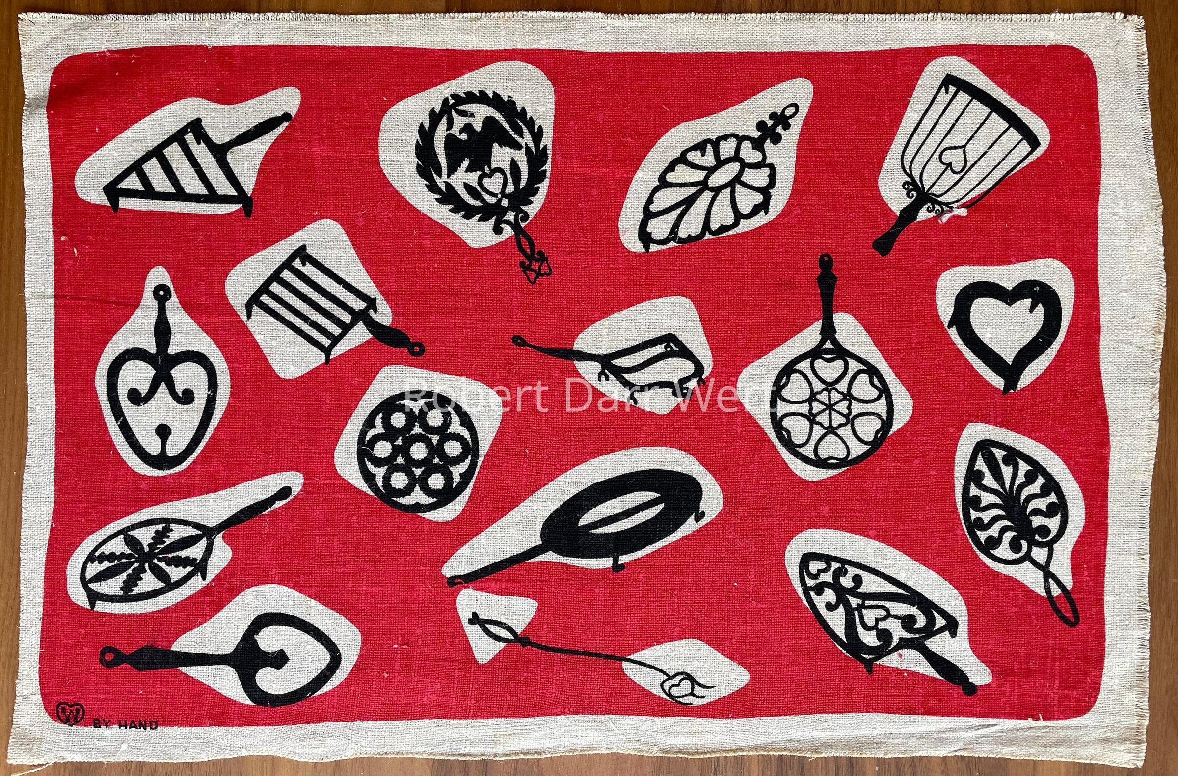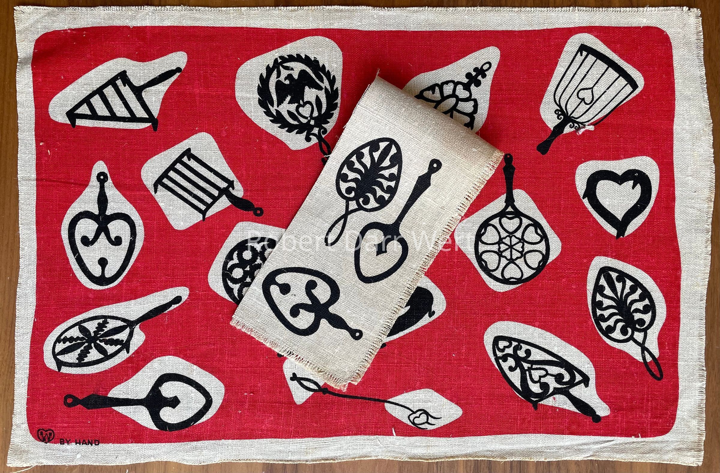A two-color silkscreen print on natural linen depicting sixteen silhouettes of early American wrought and cast iron trivets and kitchen tools. The free form composition brings traditional subject matter into a modern design context.