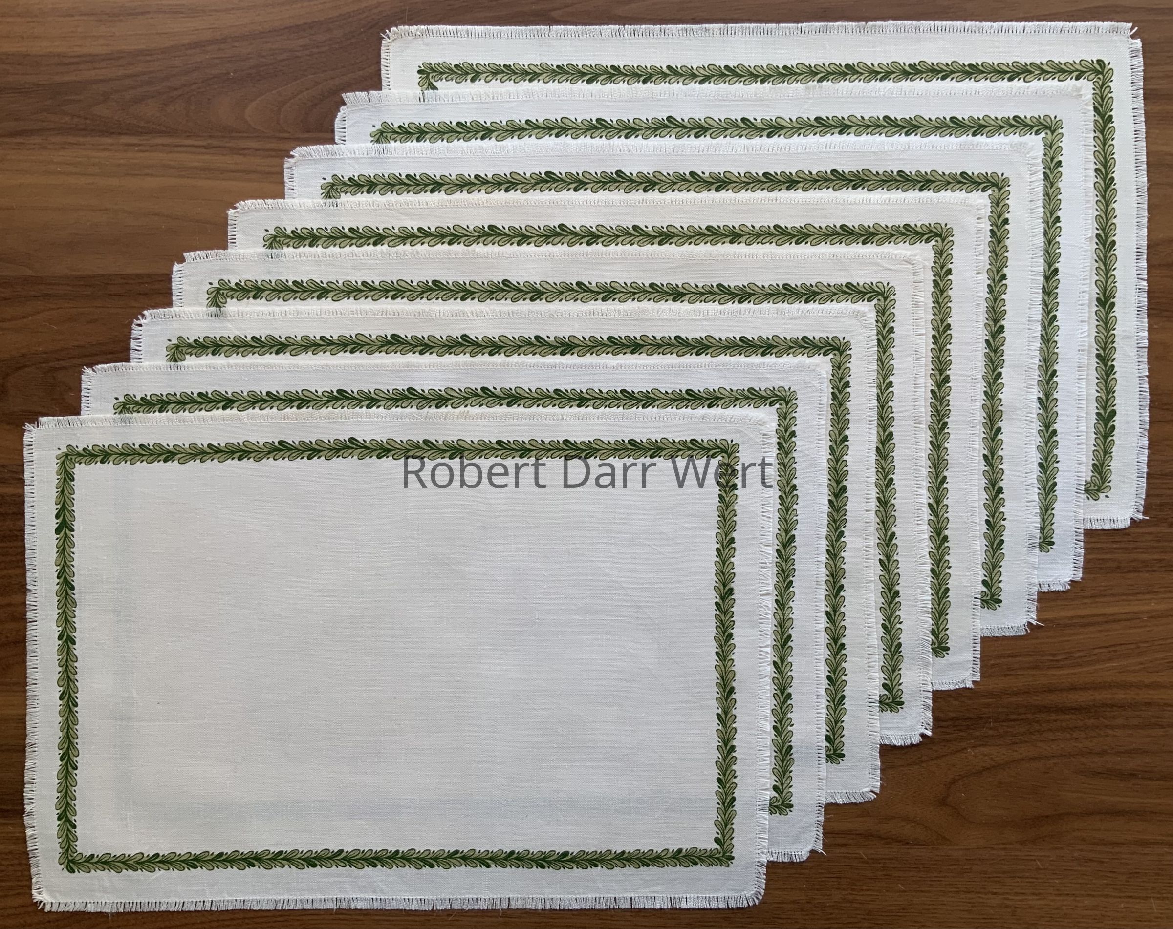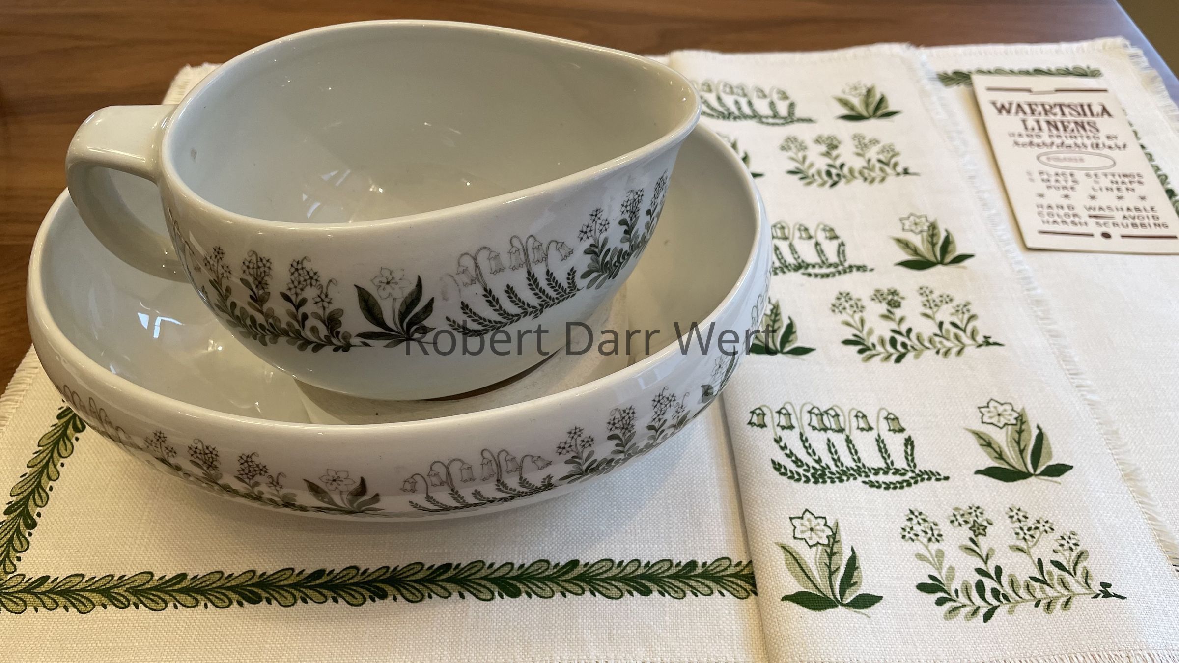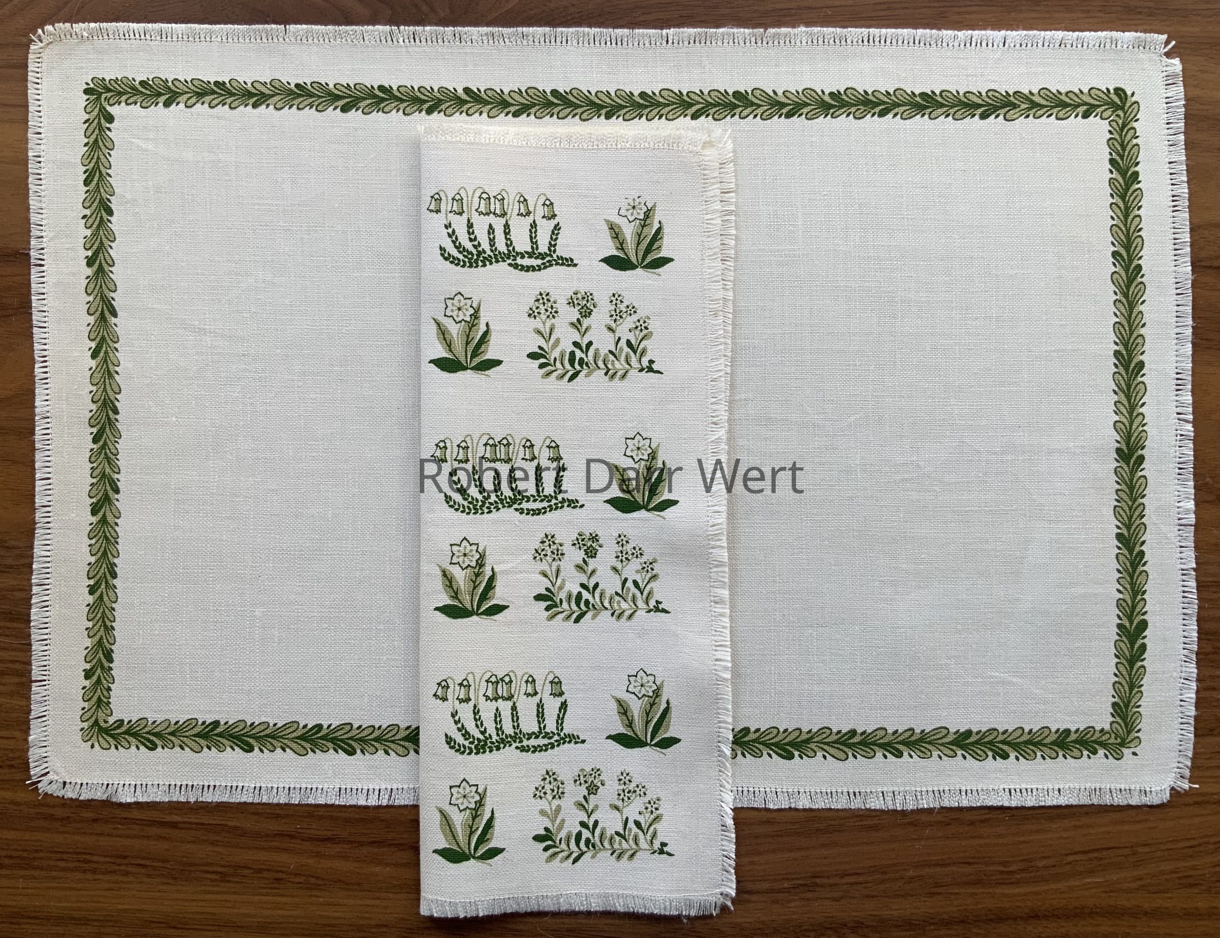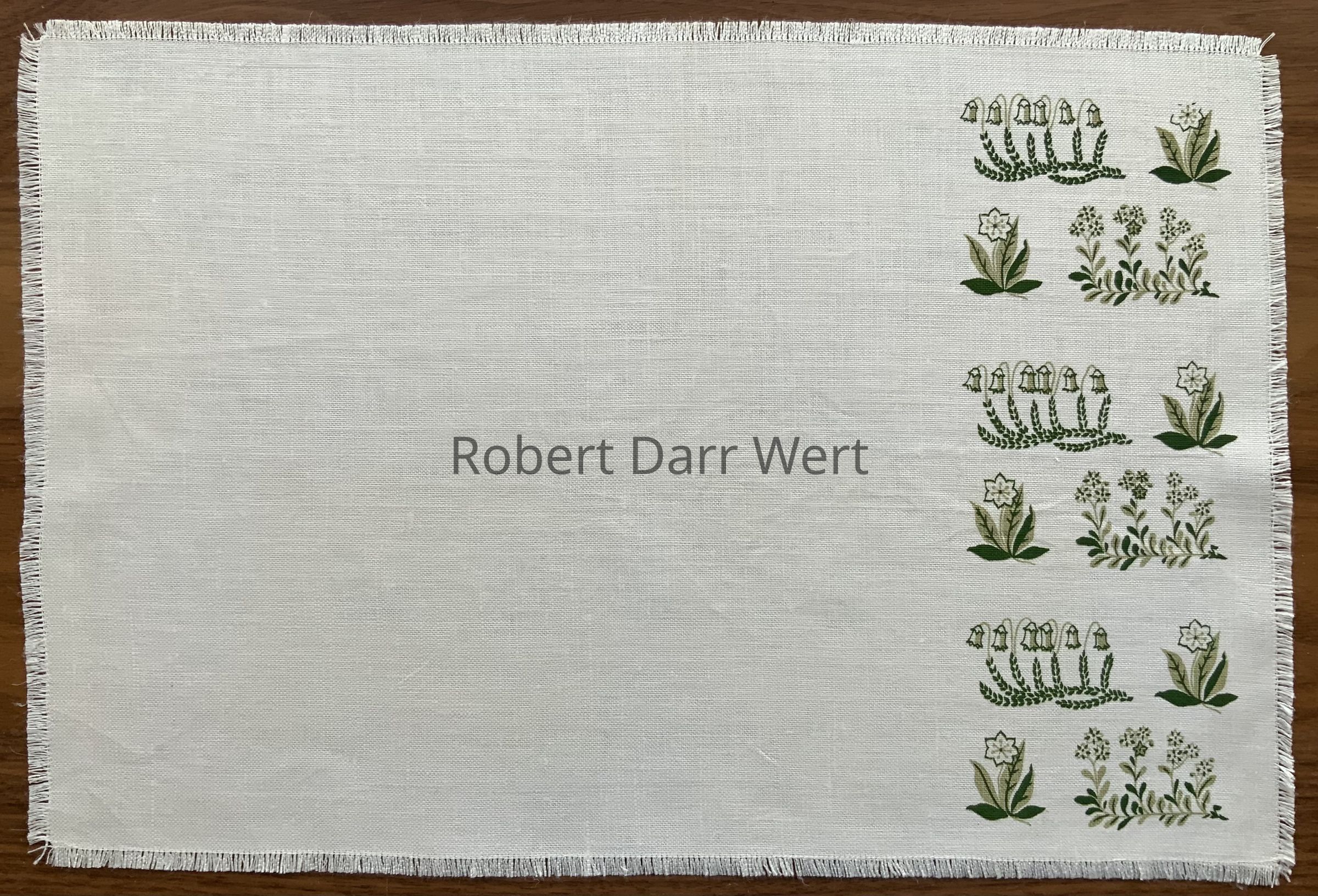 This placemat set set was designed by Wert to coordinate with china designed and produced by Arabia Finland, c.1956. The wildflowers on the napkin are Wert’s interpretation of the “Polaris” china pattern by famed Finnish designer Raija Uosikkinen. The vine border on the placemat is a variant of Wert’s typical trailing vine motif.