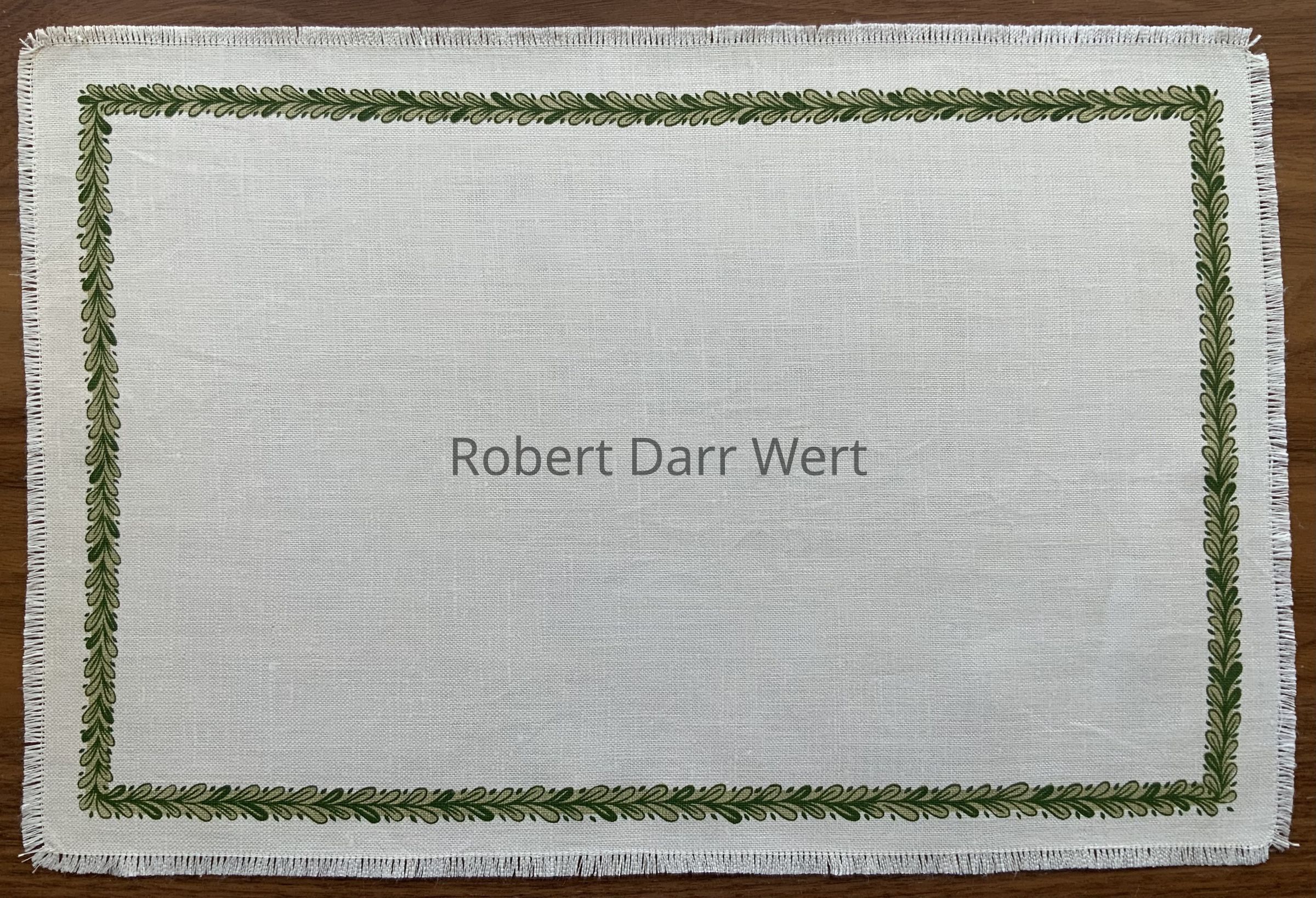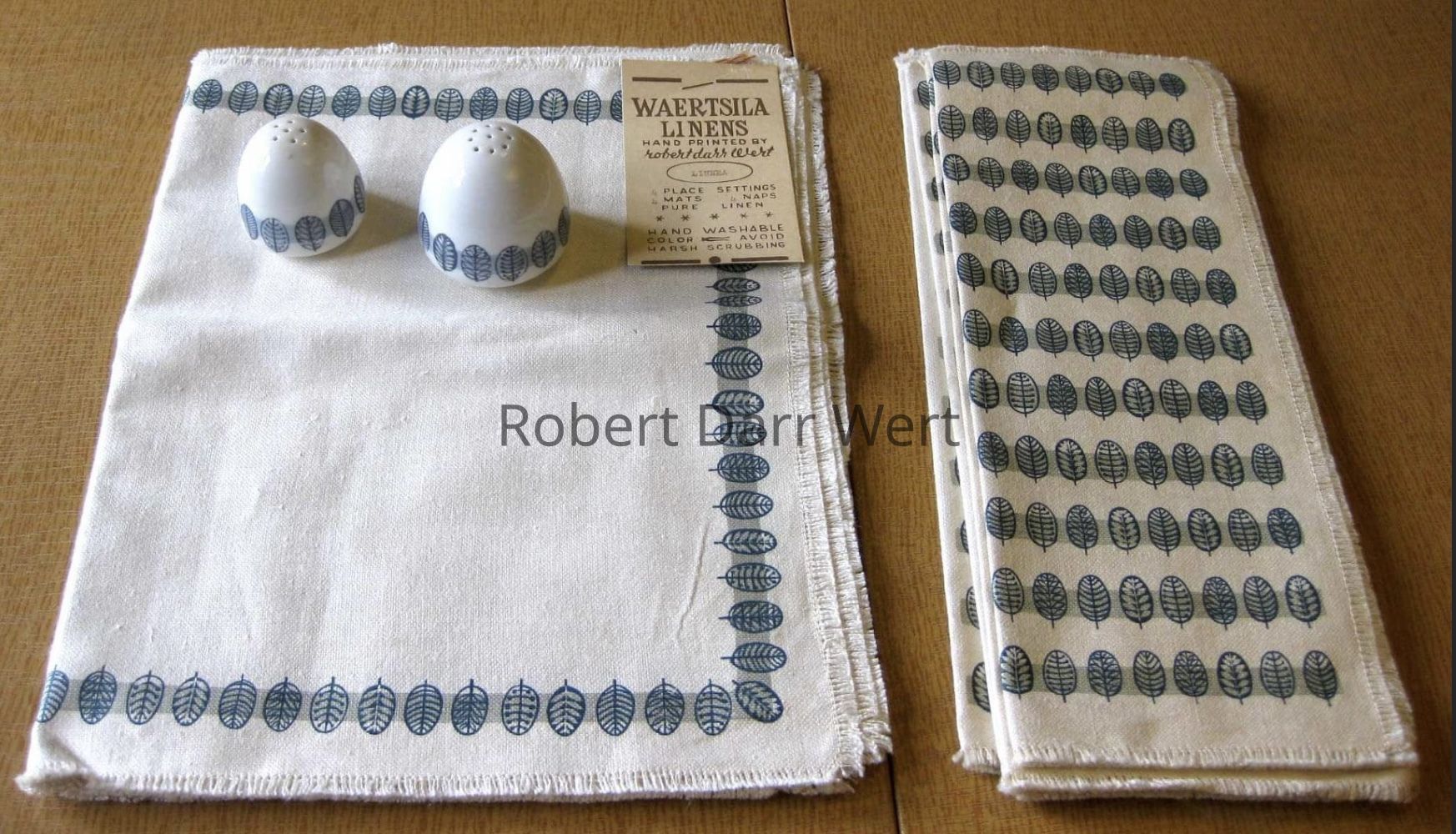 Most likely produced for Twining & Buck of Salisbury, Connecticut, a high end retailer of modern home furnishings. Twining & Buck had relationships with both Arabia and Country Prints from the time the shop opened in 1950. Based on an editorial in Craft Horizons magazine in December 1956, textile historian Susan Ward believes it is most likely Twining & Buck engaged Robert Darr Wert to produce silkscreen printed bibs and placemat sets to match the Arabia Finland china in their inventory. Arabia Finland knows of no such working relationship between their company and Wert. Two baby bibs and two placemat sets have been documented under the name “Waertsila Linens Hand Printed by Robert Darr Wert”; see “Waertsila Linens by Robert Darr Wert” entries.