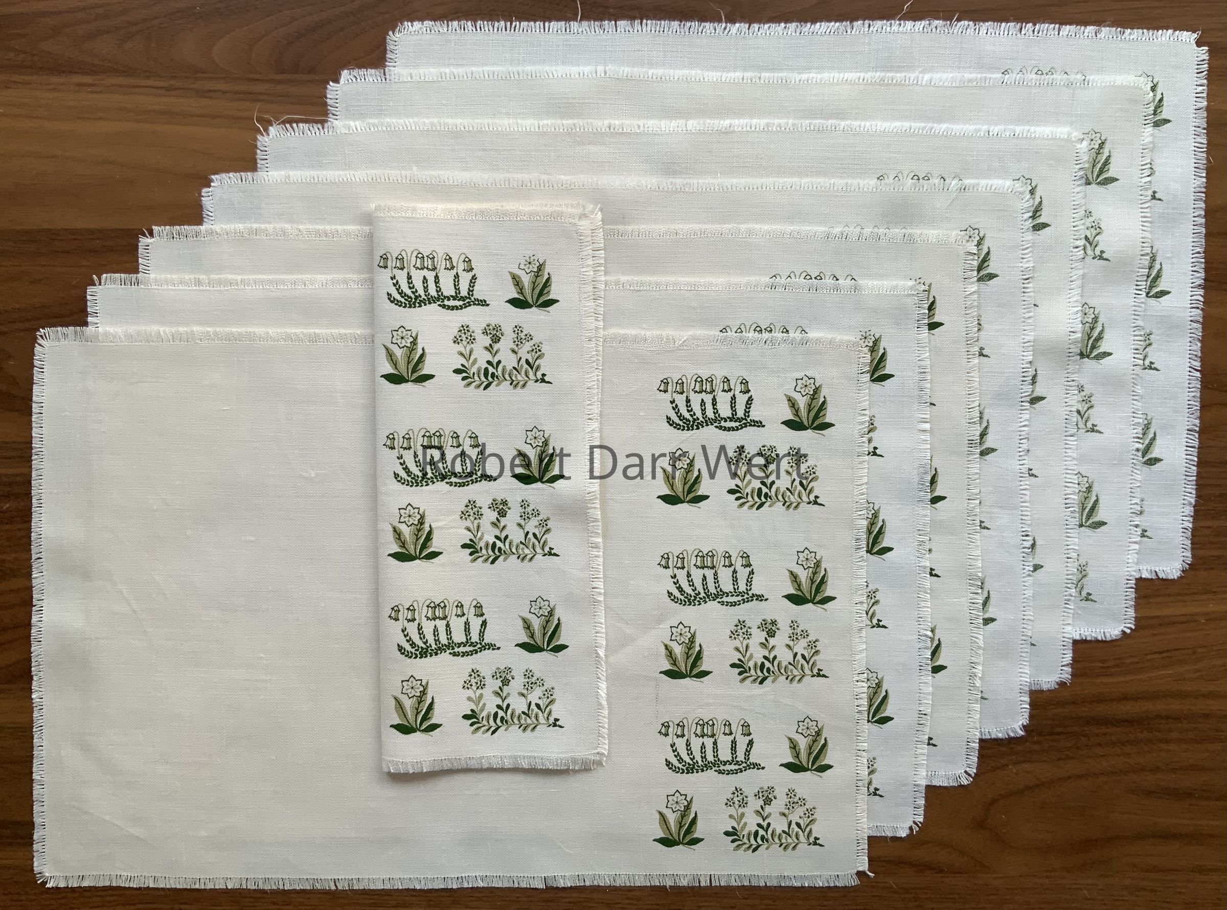 A placemat set with two two-color silkscreen prints on off-white linen depicting wildflowers (napkin) and vines (placemat).