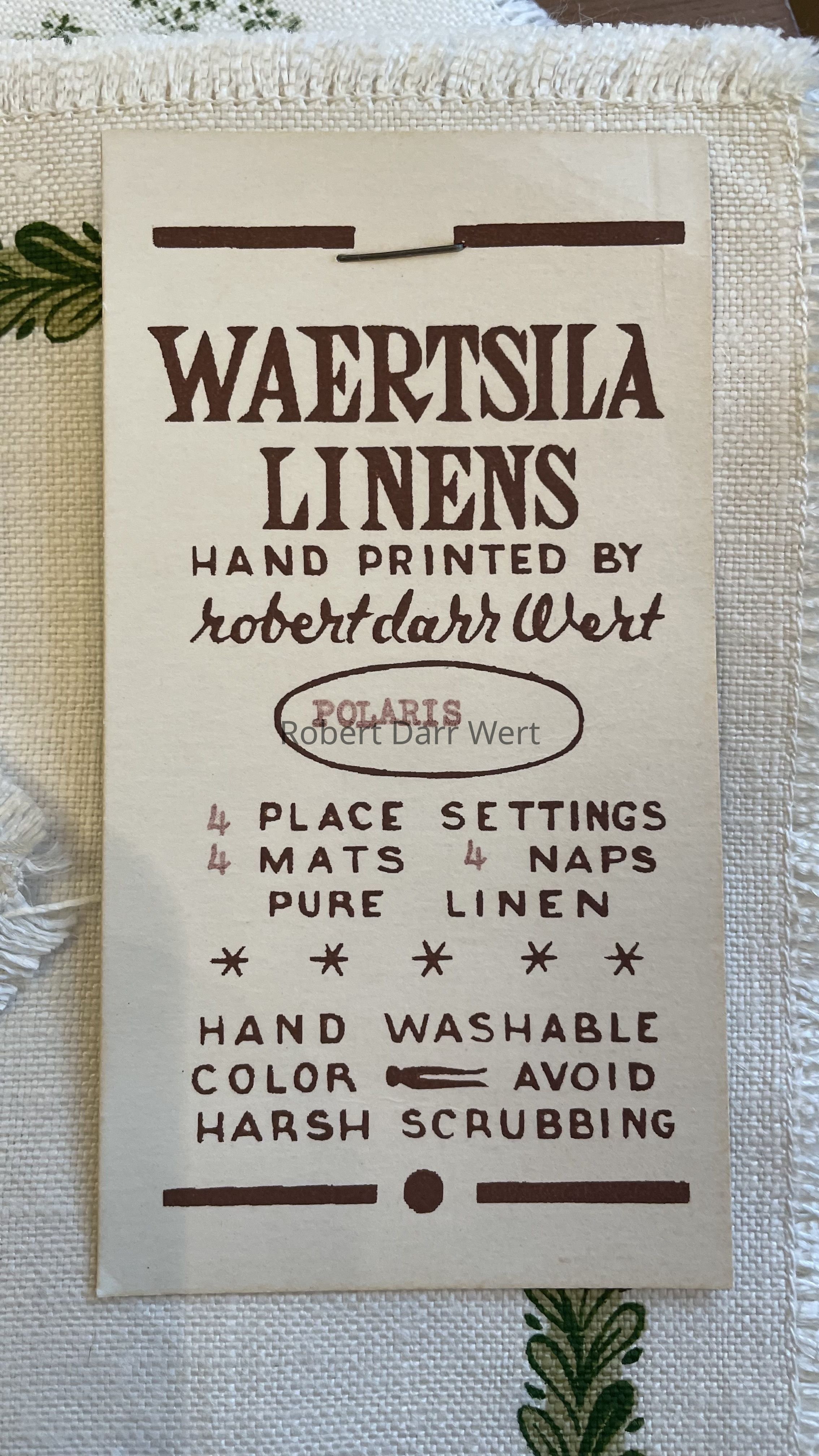Wert also produced a custom product tag for the Waertsila linens; see images.Made/Created
