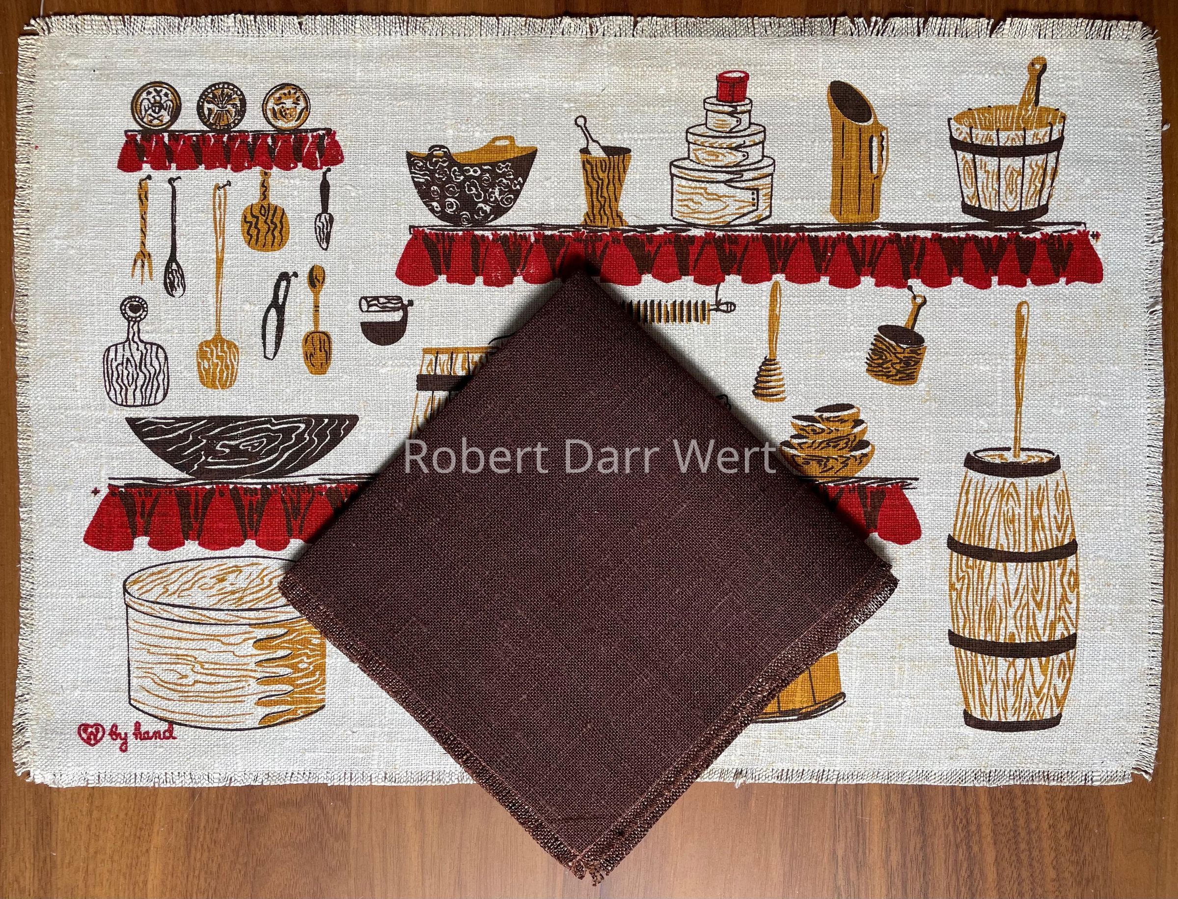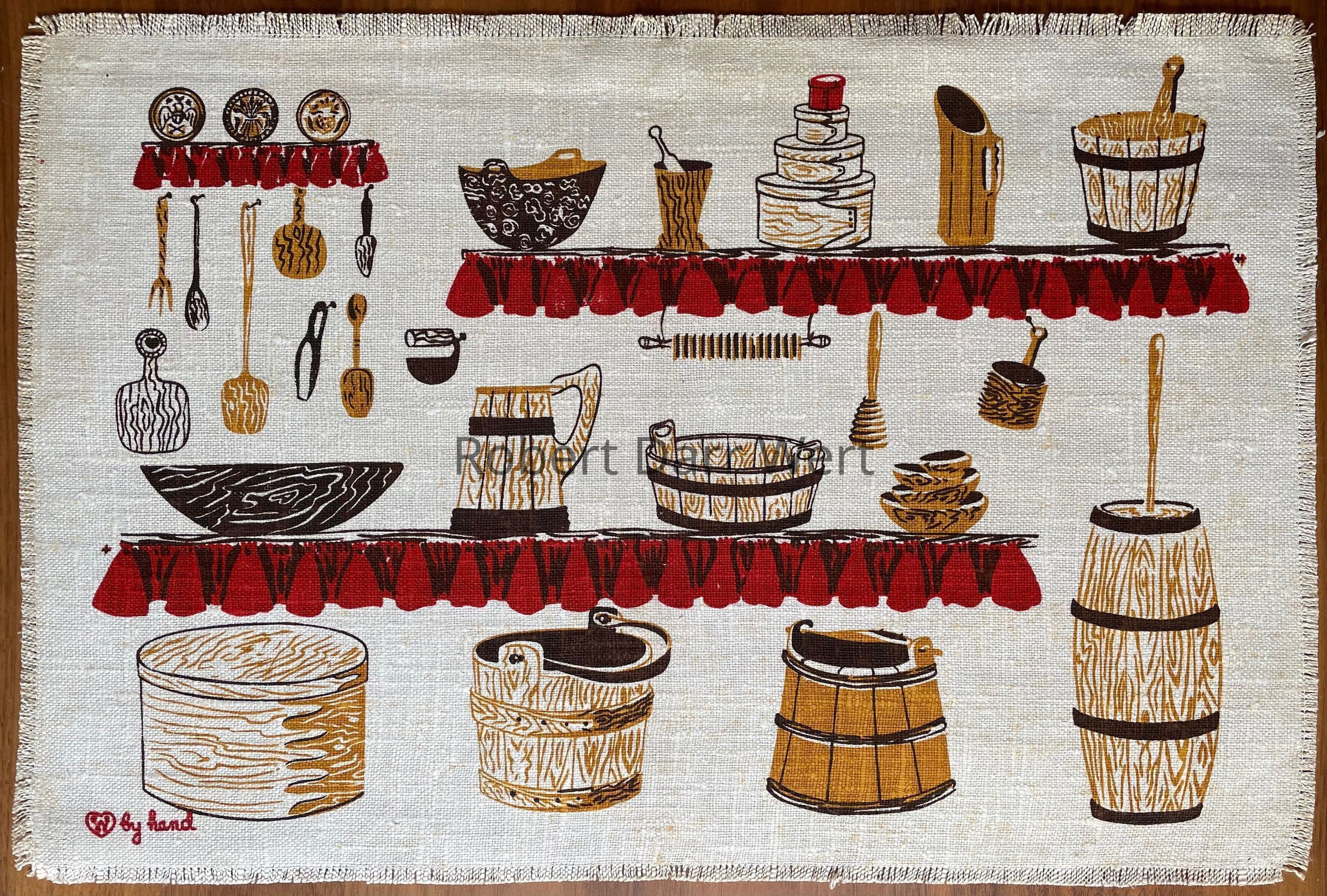 A placemat with a three-color silkscreen print on off-white linen depicting early American wooden ware on shelves with gathered fabric valances. A matching napkin has not been documented.