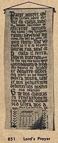 A Country Prints Plowshares silkscreen printed wallhanging with an attached paper calendar for 1965. The composition features the Lord’s Prayer in both Latin and English, presented in calligraphic script. The design continues under the stapled paper calendar so the hanging can be used after the year is over.