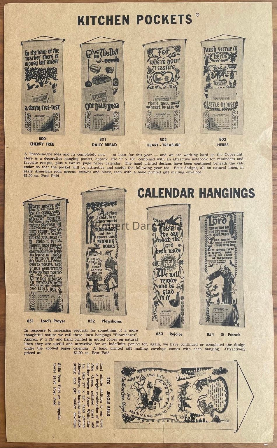 Plowshares was Country Prints’ line of Christian-themed products, most of which were aimed at the Christmas market. Kitchen Pockets wallhangings and calendar hangings were introduced in 1964 for the Fall & Christmas retail markets. The attached calendars were dated for 1965.Made/Created