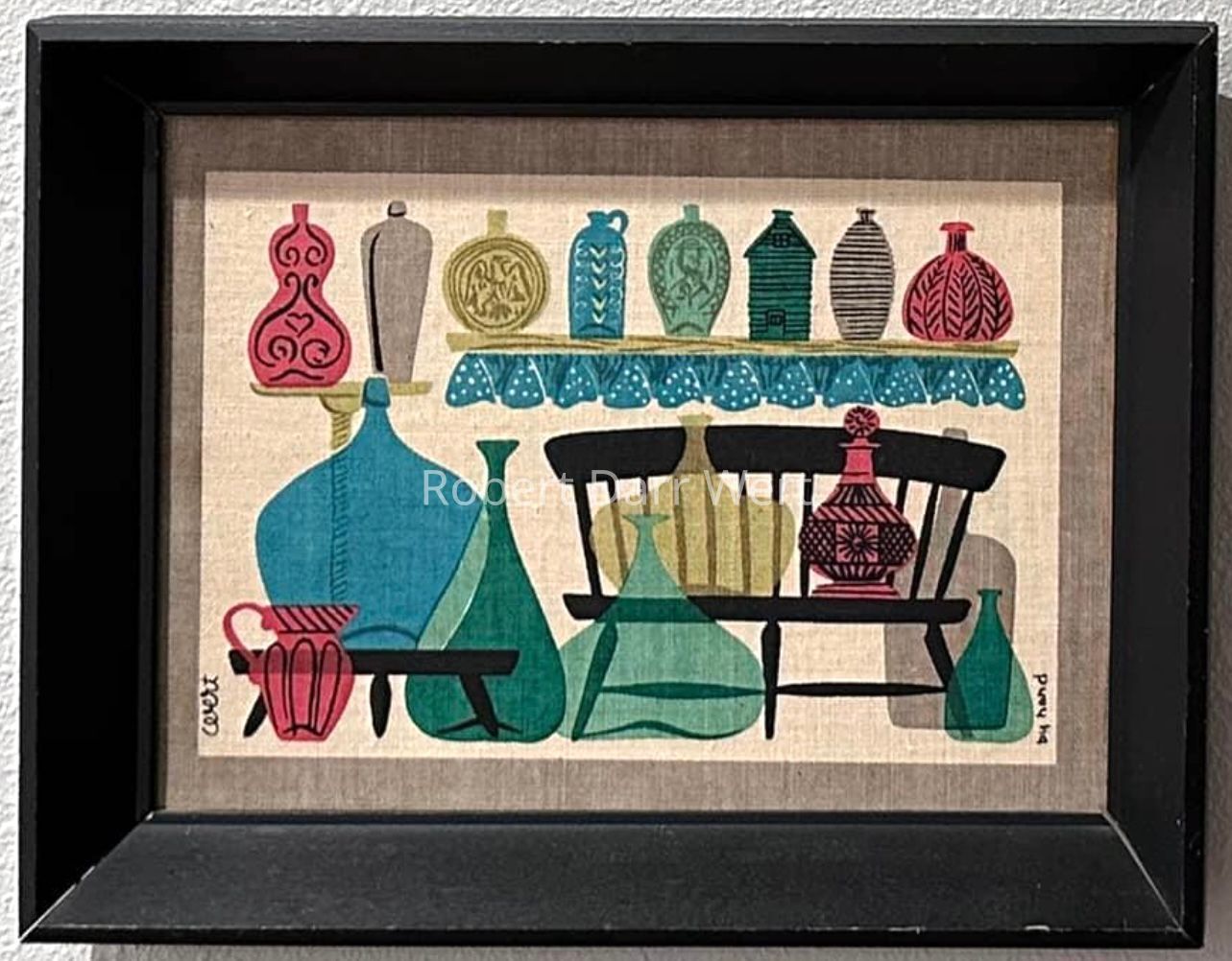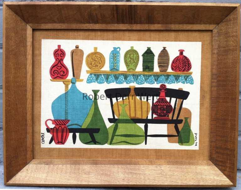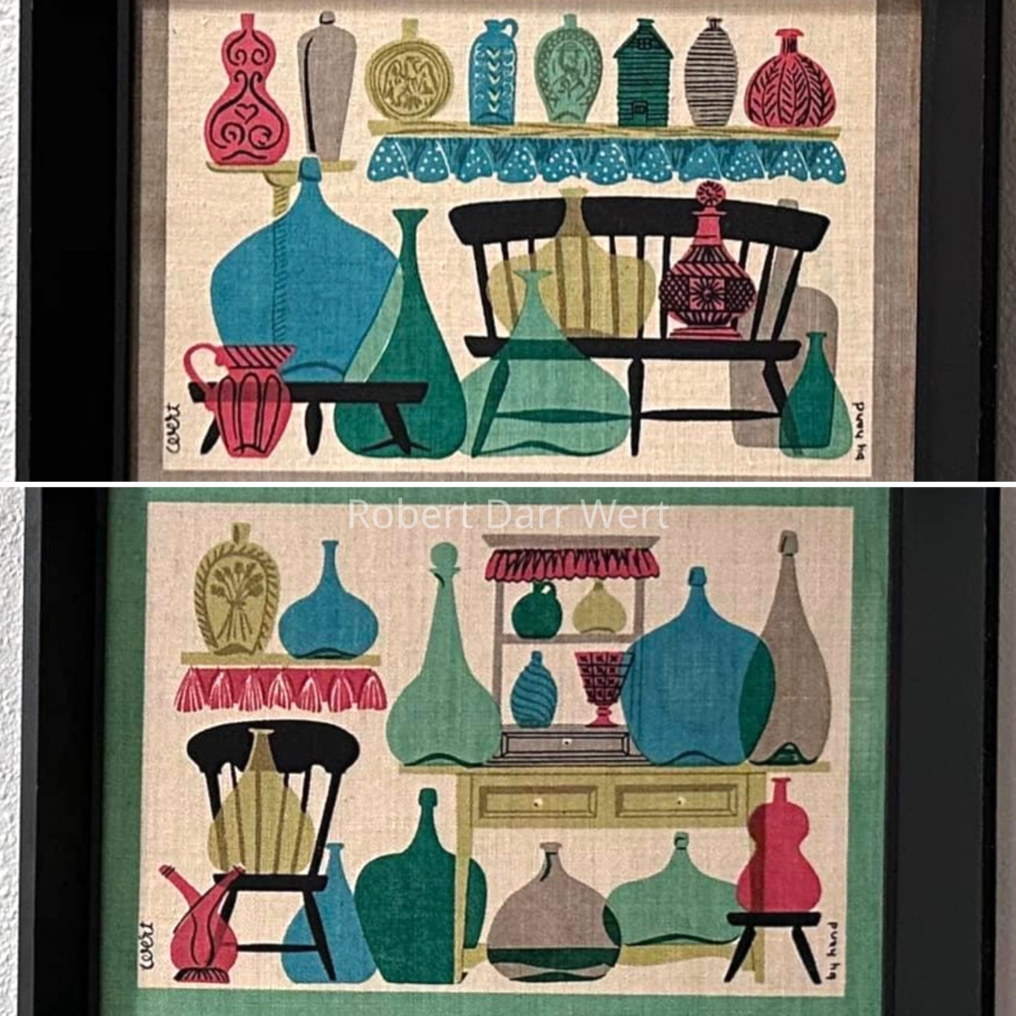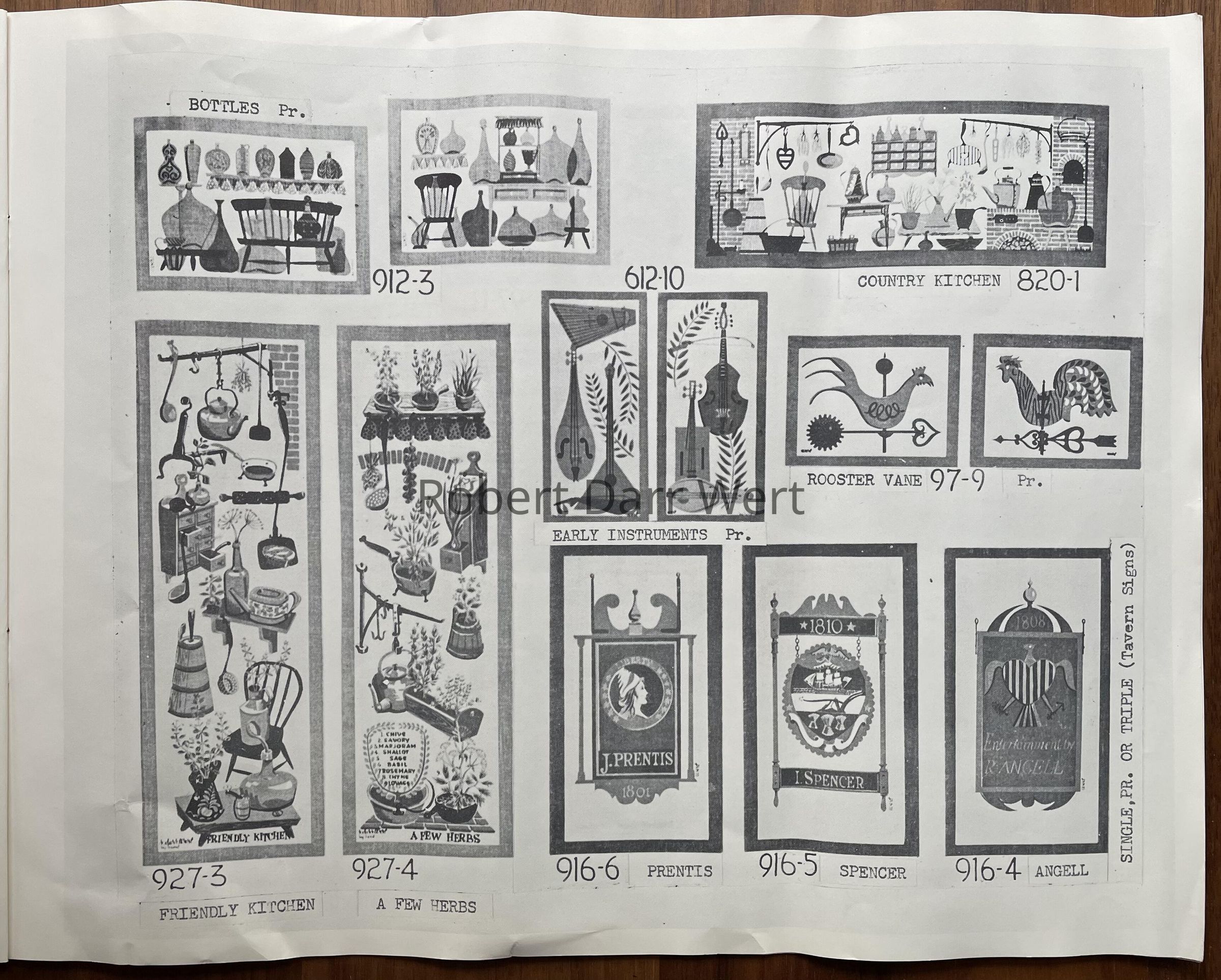 This pair of prints is listed in the Spring 1958 Country Prints price list as Bottles 912-3/4 Pair. It is listed in the January 1960 Country Prints Price list in a choice of antique birch of flat black frames, and appears in the c.1960 brochure “Country Prints in Frames Designed by Robert Darr Wert” as Bottles 912-3 Pair; see images.
