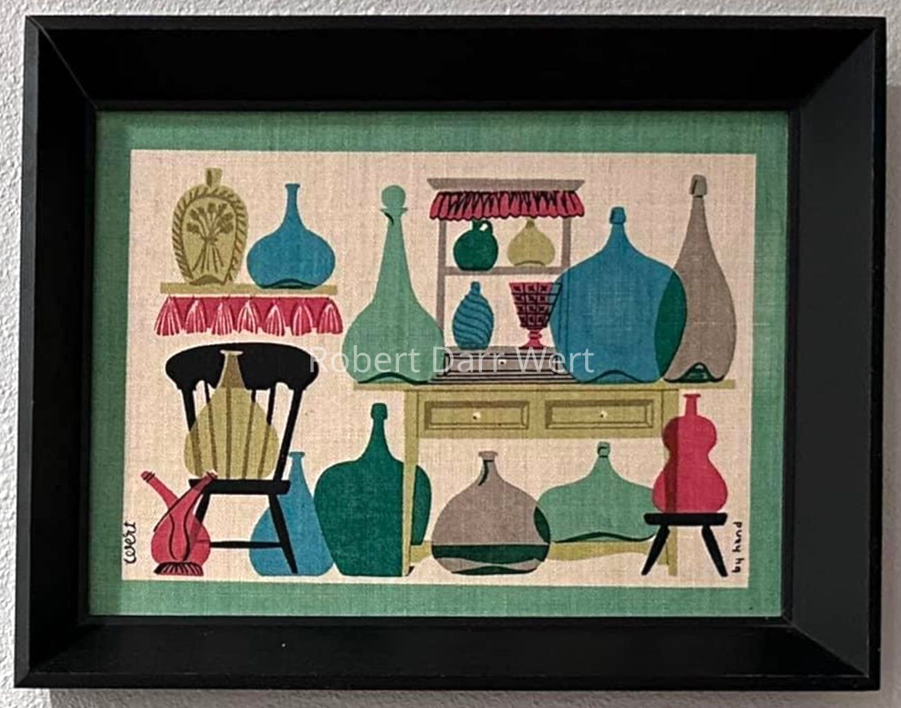 A pair of six or seven-color silkscreen prints on off-white linen depicting numerous early American glass vessels arranged on various wooden home furnishings. The major forms of glass production are represented: mouth blown, mold blown, painted/enameled, and cut glass.