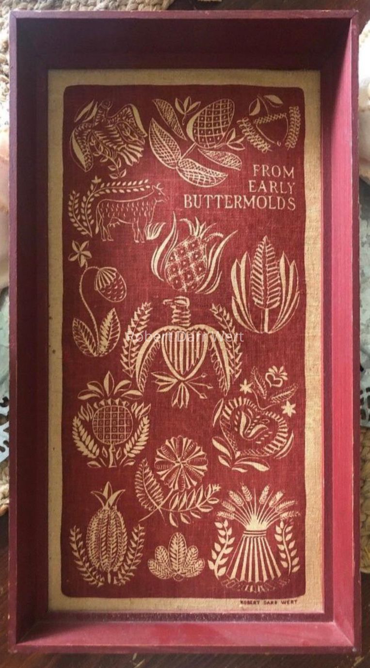 A one-color silkscreen print on off-white linen depicting fourteen designs extracted from carved wooden buttermolds symbolizing welcome, abundance, and national pride. This print was produced in a red painted pine frame, and was one of the first nine framed prints offered by Country Prints.