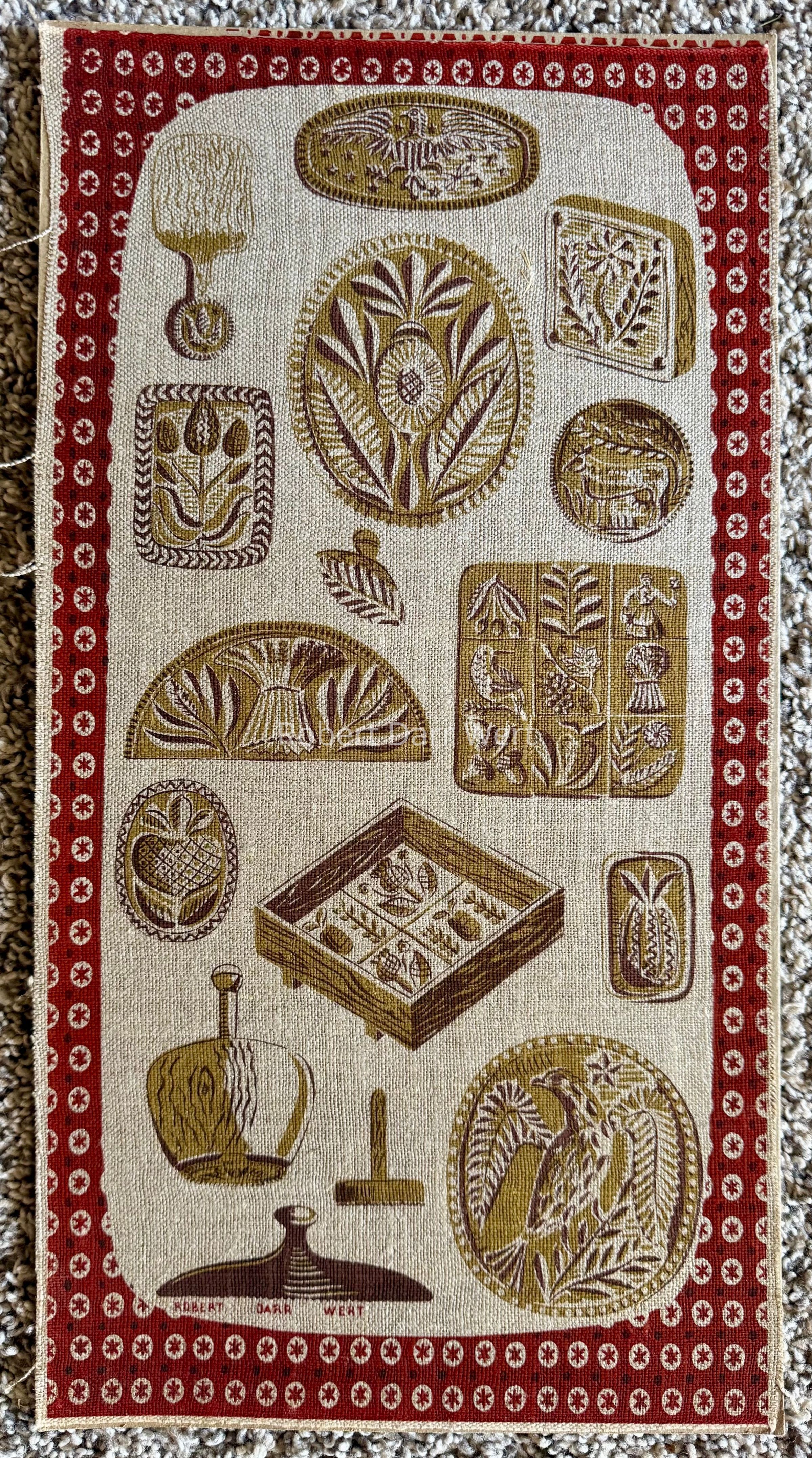 A three-color silkscreen print on natural linen depicting fifteen carved wooden butter molds and a butter paddle with a carved handle. Carvings depict symbols of health, abundance and national pride. The composition is bordered in Wert’s interpretation of a blue calico pattern of polka dots and six pointed stars within circles.