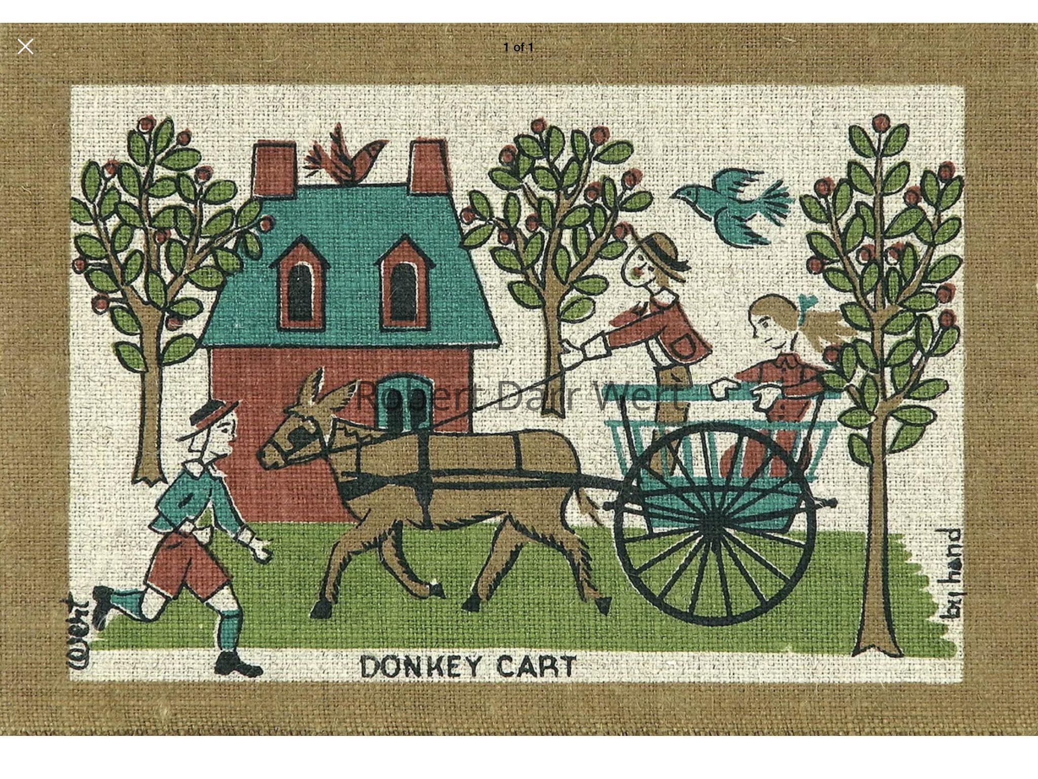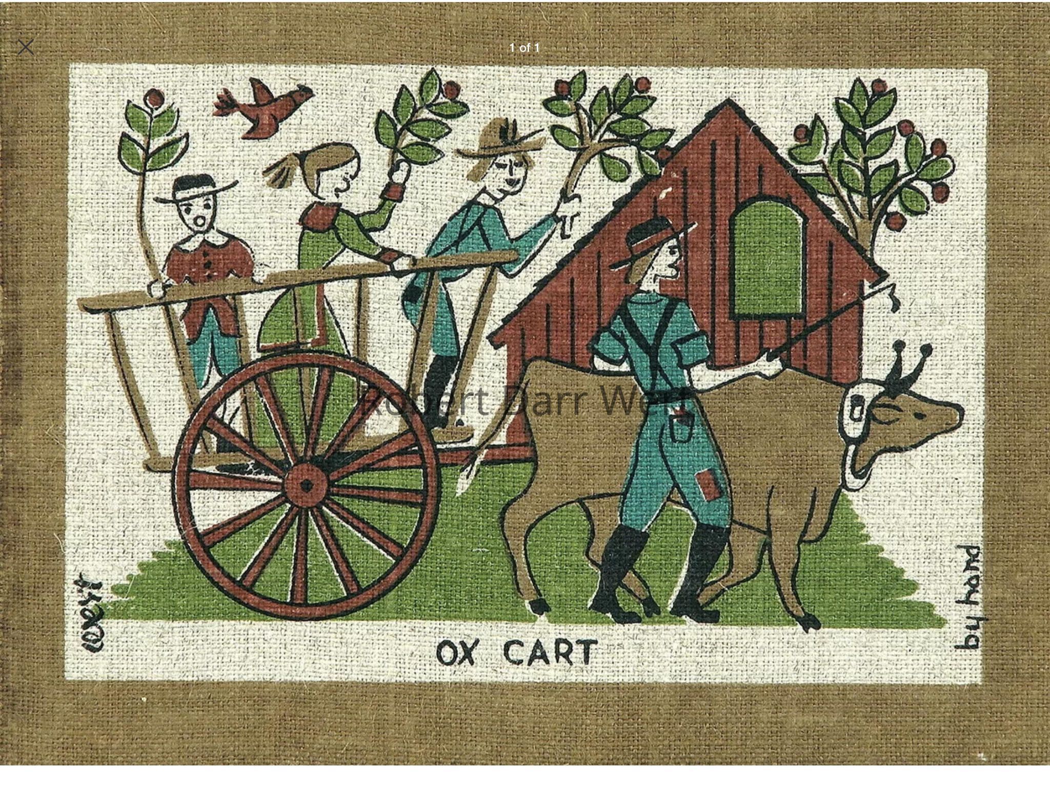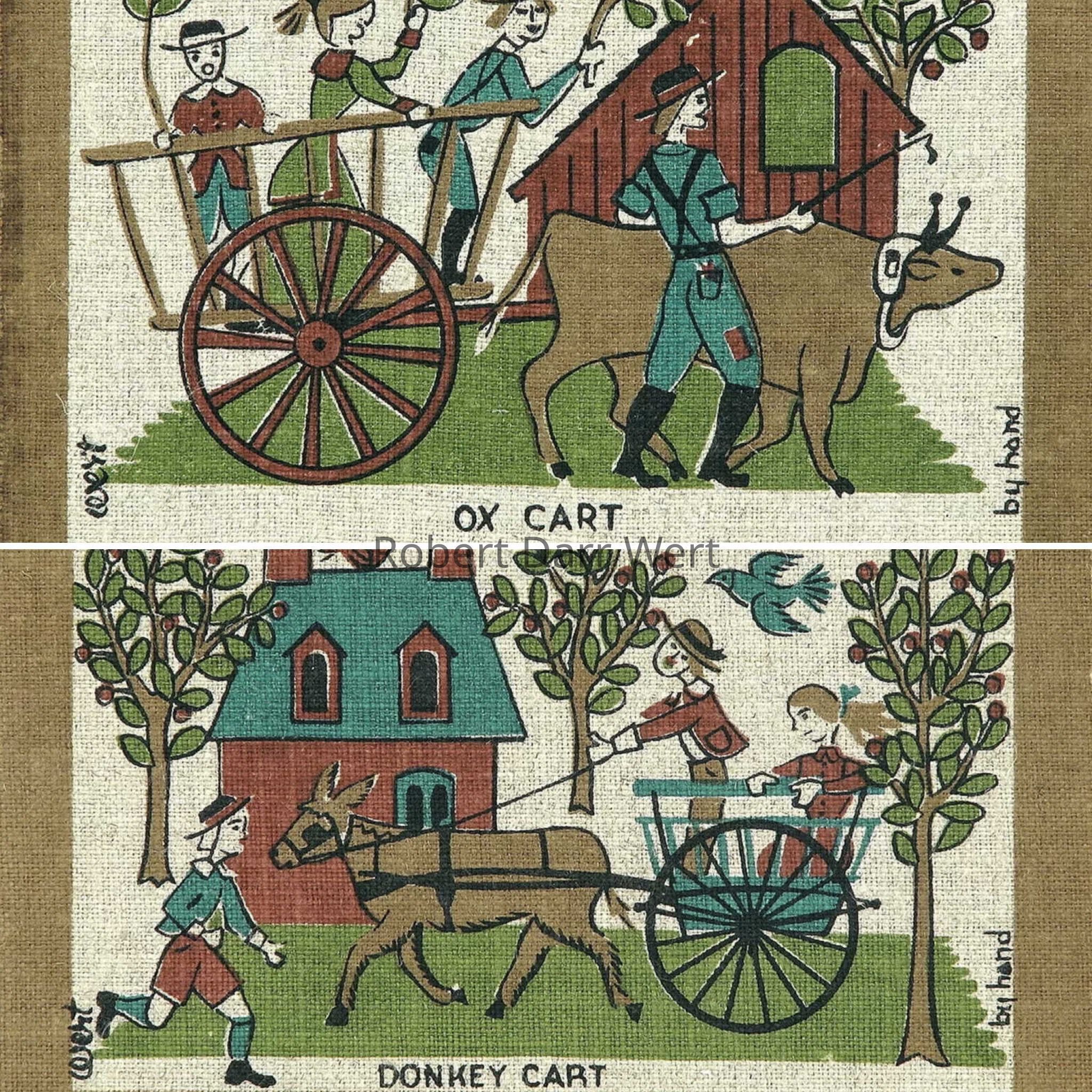 A set of two five-color silkscreen prints on off-white linen depicting an ox cart and a donkey cart in use.