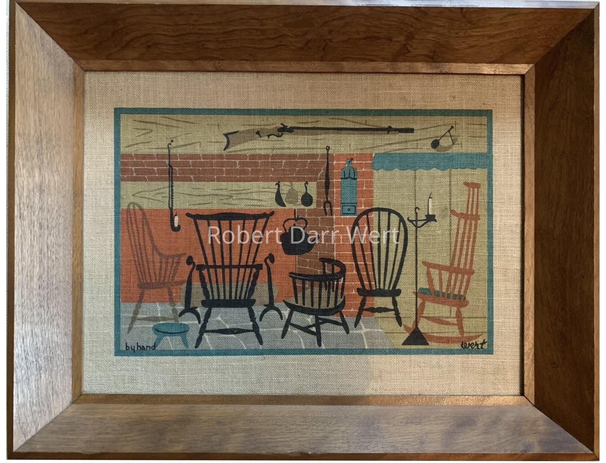 A six-color silkscreen print on natural linen depicting a domestic scene of five chairs in silhouette gathered at an early American kitchen hearth.