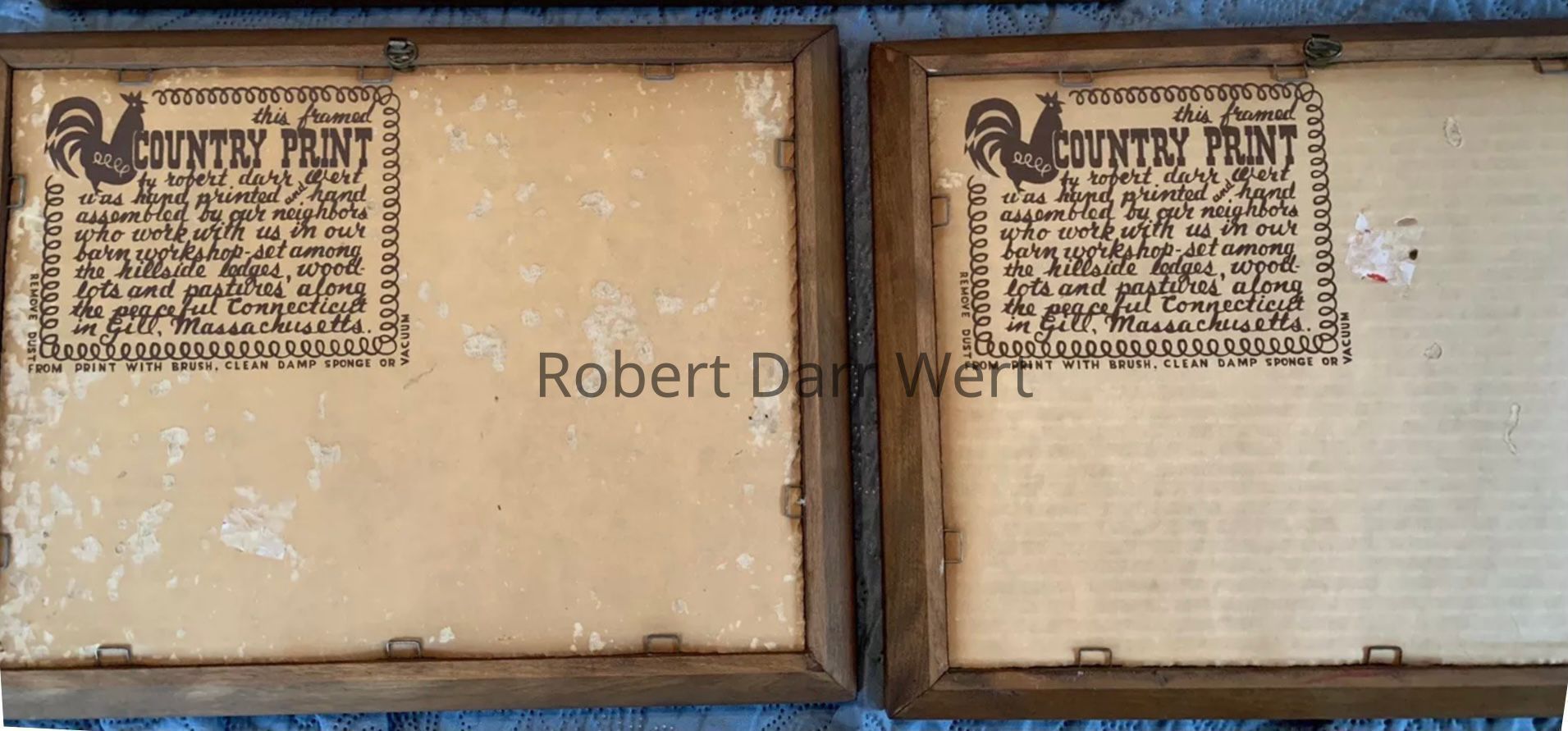 Linen print is dry mounted on chipboard, backed with corrugated cardboard printed with the Country Prints story, and secured within a Country Prints natural wood frame with staples. Cleated hanging hardware is affixed at top back of frame.Inscription/Signature/Marks