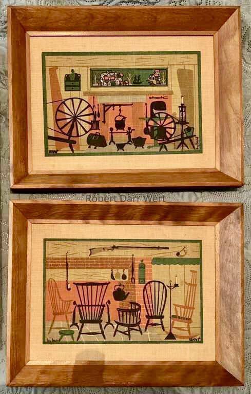 This print appears in the c.1955 brochure “Country Prints in Frames” and the Spring 1958 Country Prints price list as Chair Hearth 912-1 and Spinning Wheels 912-2. Later, on a 1958 Country Prints packing slip, the two are paired as Chair Hearth/Spinning Wheels 912-1/2. In the c.1960 brochure “Country Prints in Frames Designed by Robert Darr Wert” they are paired as Hearth & Wheel 912-1; see images.Made/Created