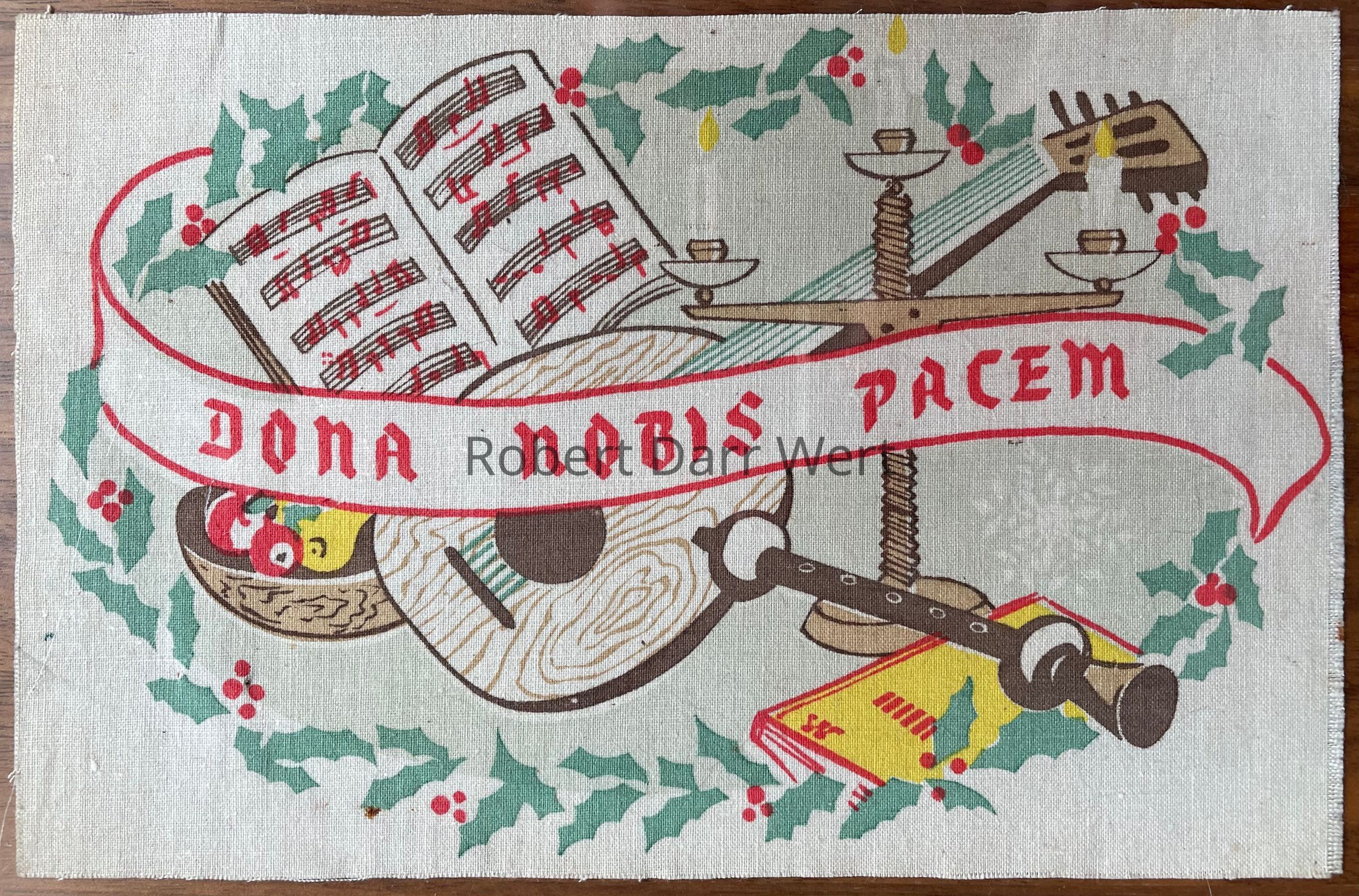 A six-color silkscreen print on off-white cotton crash depicting music and musical instruments, a bowl of fruit, and a candle stand holding three candles, all ringed with holly leaves and berries, fronted with a banner bearing the latin phrase “DONA NOBIS PACEM”, which translates to “GRANT US PEACE”. This is the first annual Christmas greeting produced by Country Prints.Made/Created