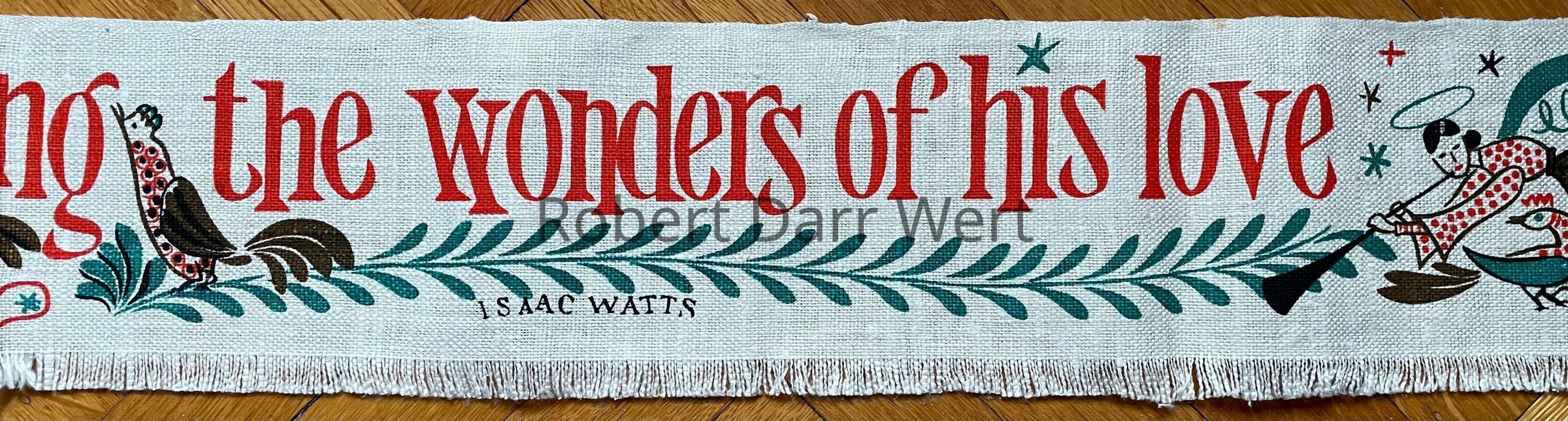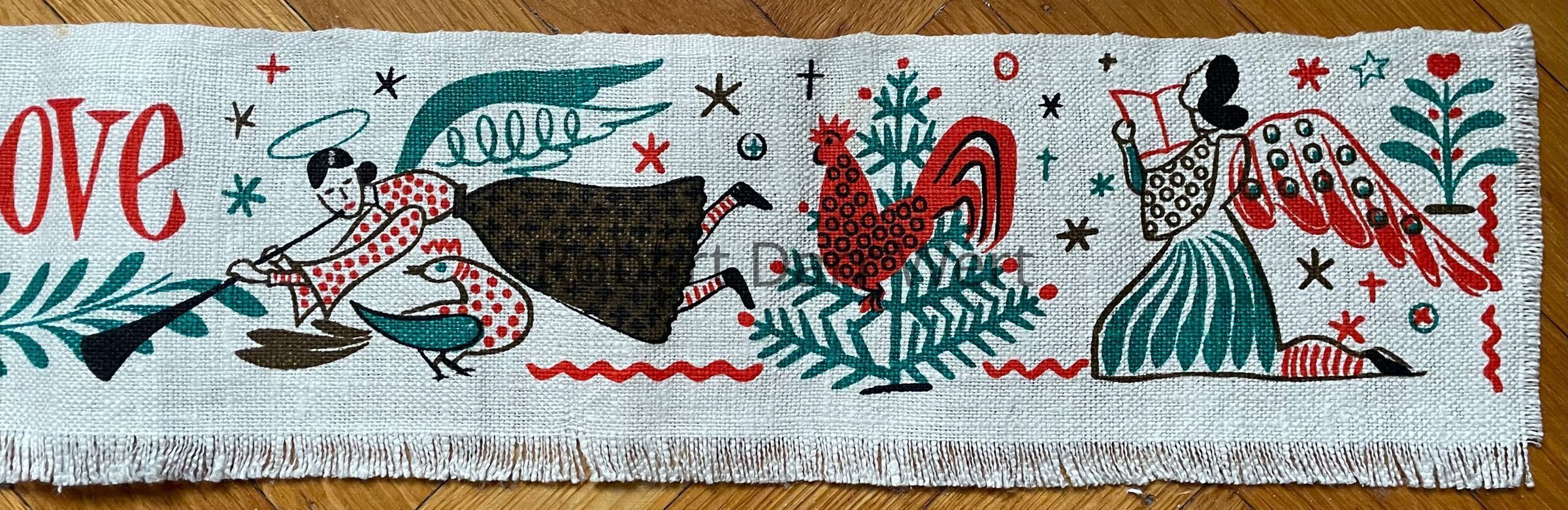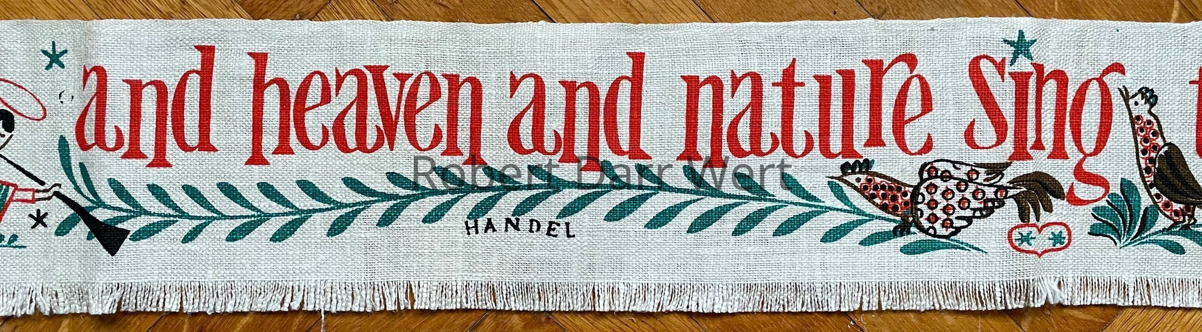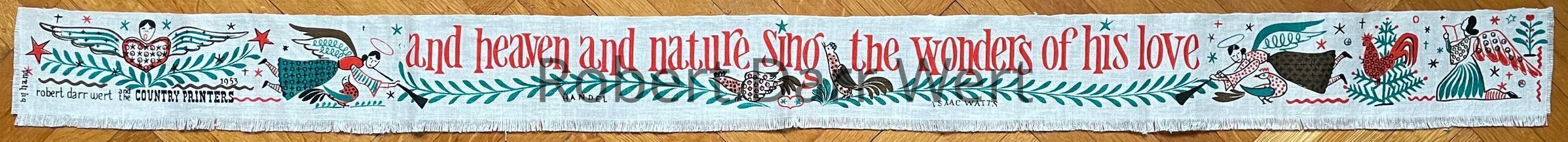 This is a four-color silkscreen print on off-white linen depicting angels, birds, trailing vines, a rooster in a Christmas tree, and the lyric by Handel, “and heaven and nature sing the wonders of his love”, from “Joy to the World”.