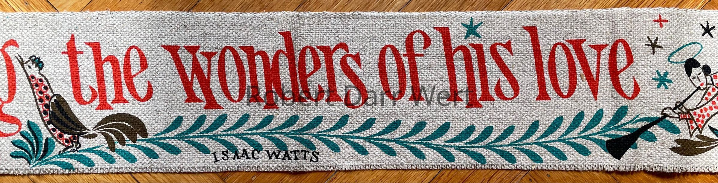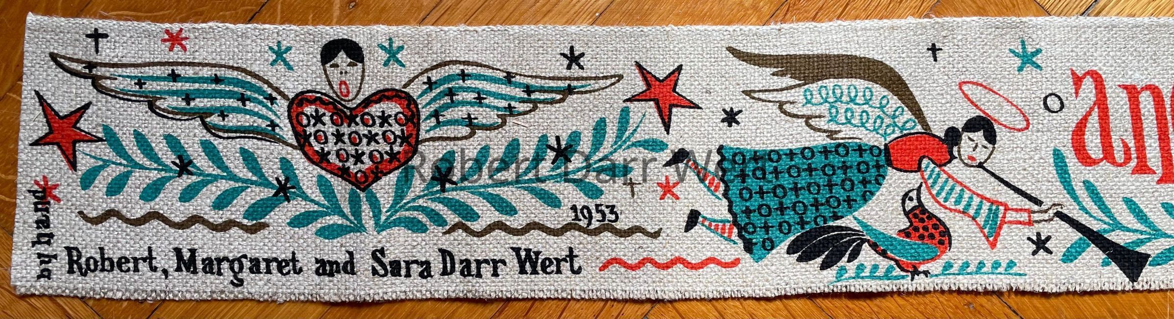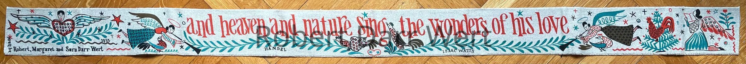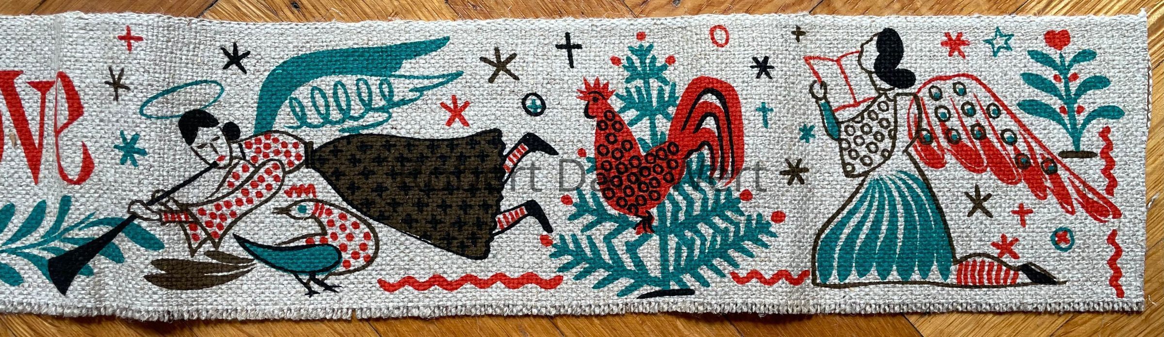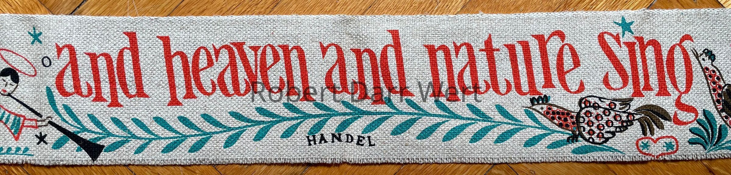 This is a four-color silkscreen print on natural linen depicting angels, birds, trailing vines, a rooster in a Christmas tree, and the lyric by Handel, “and heaven and nature sing the wonders of his love”, from “Joy to the World”.
