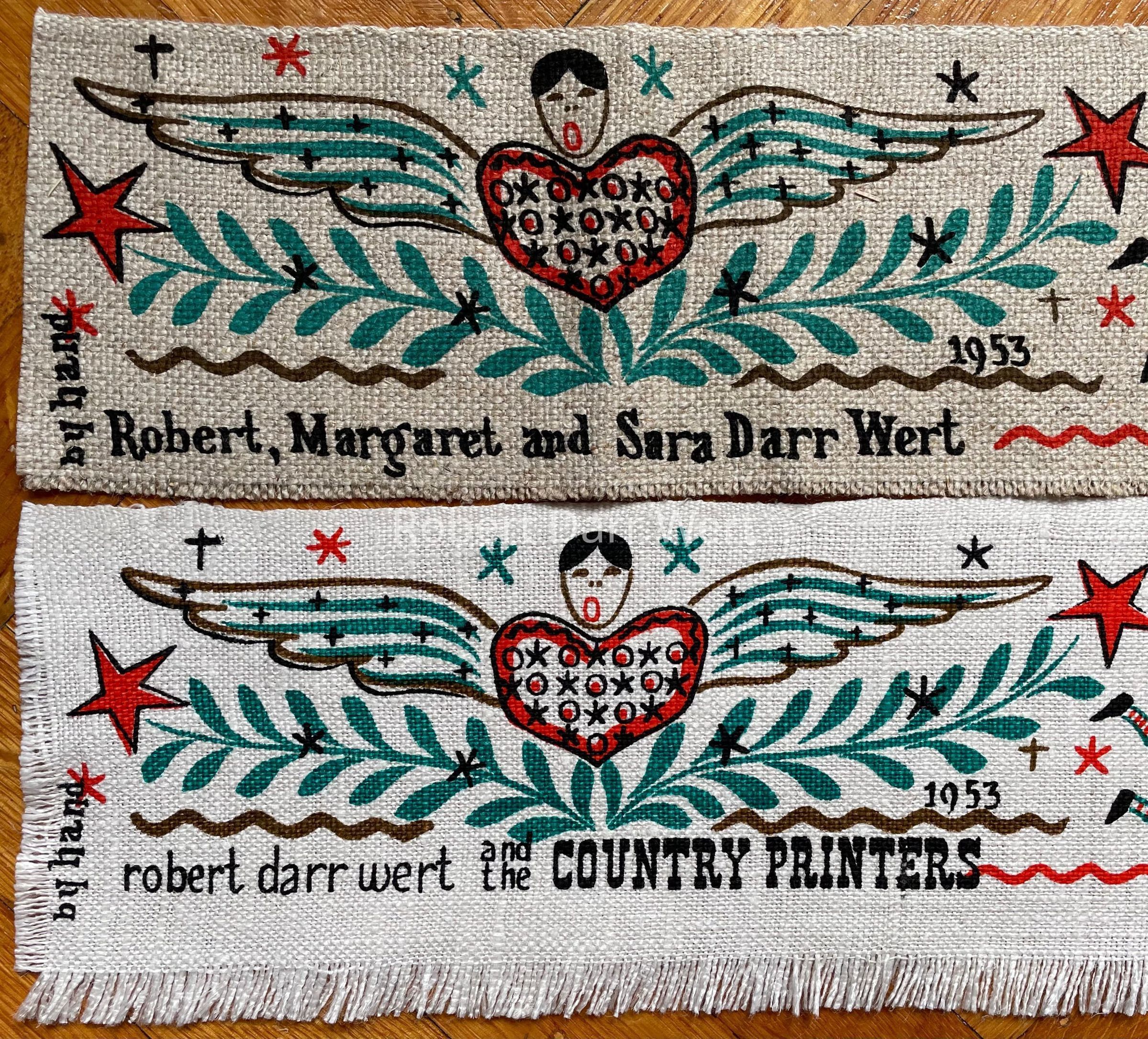 “by hand robert darr wert and the COUNTRY PRINTERS”, at left with date “1953” appearing above “PRINTERS”.Material