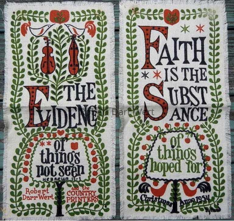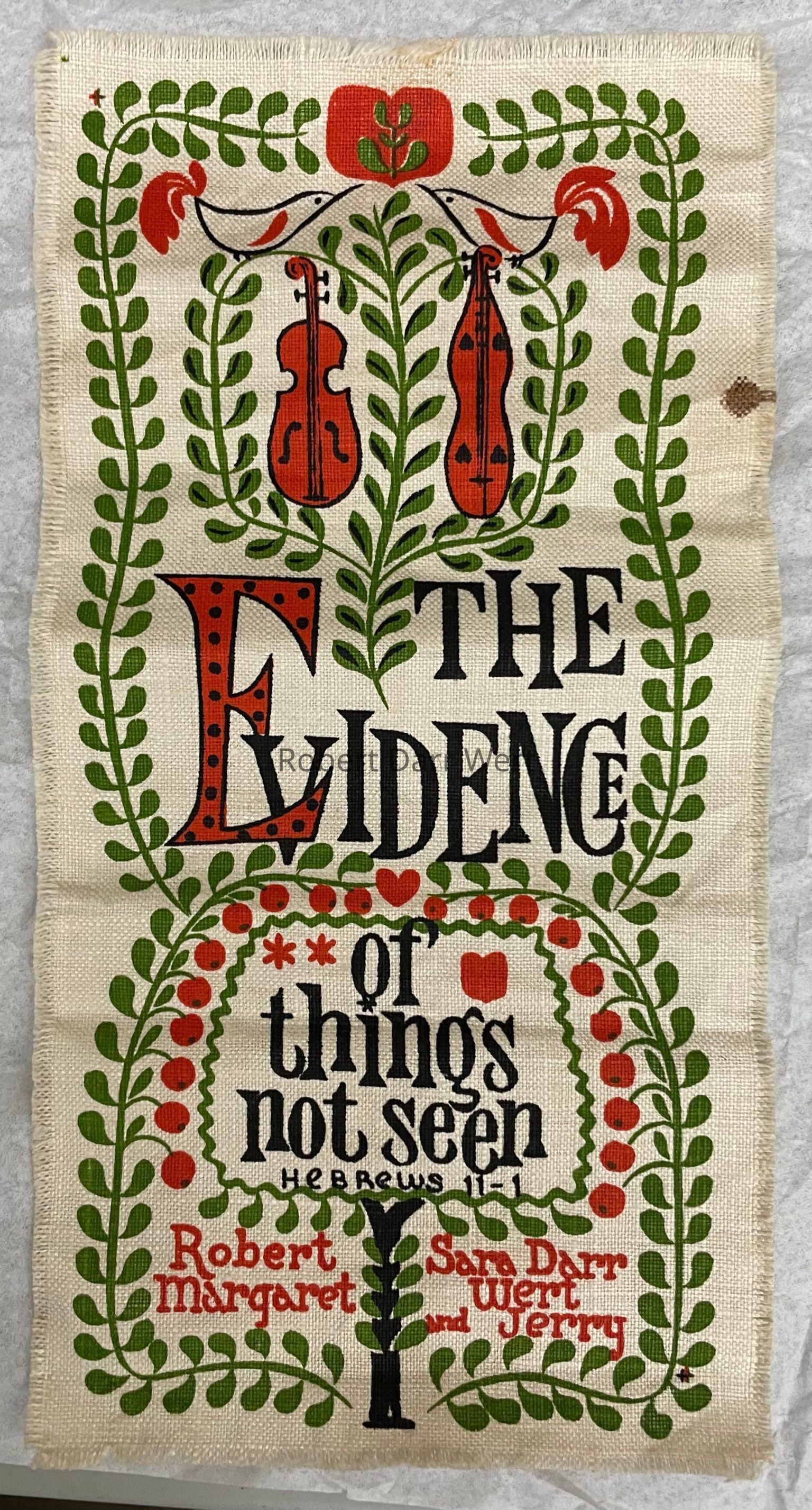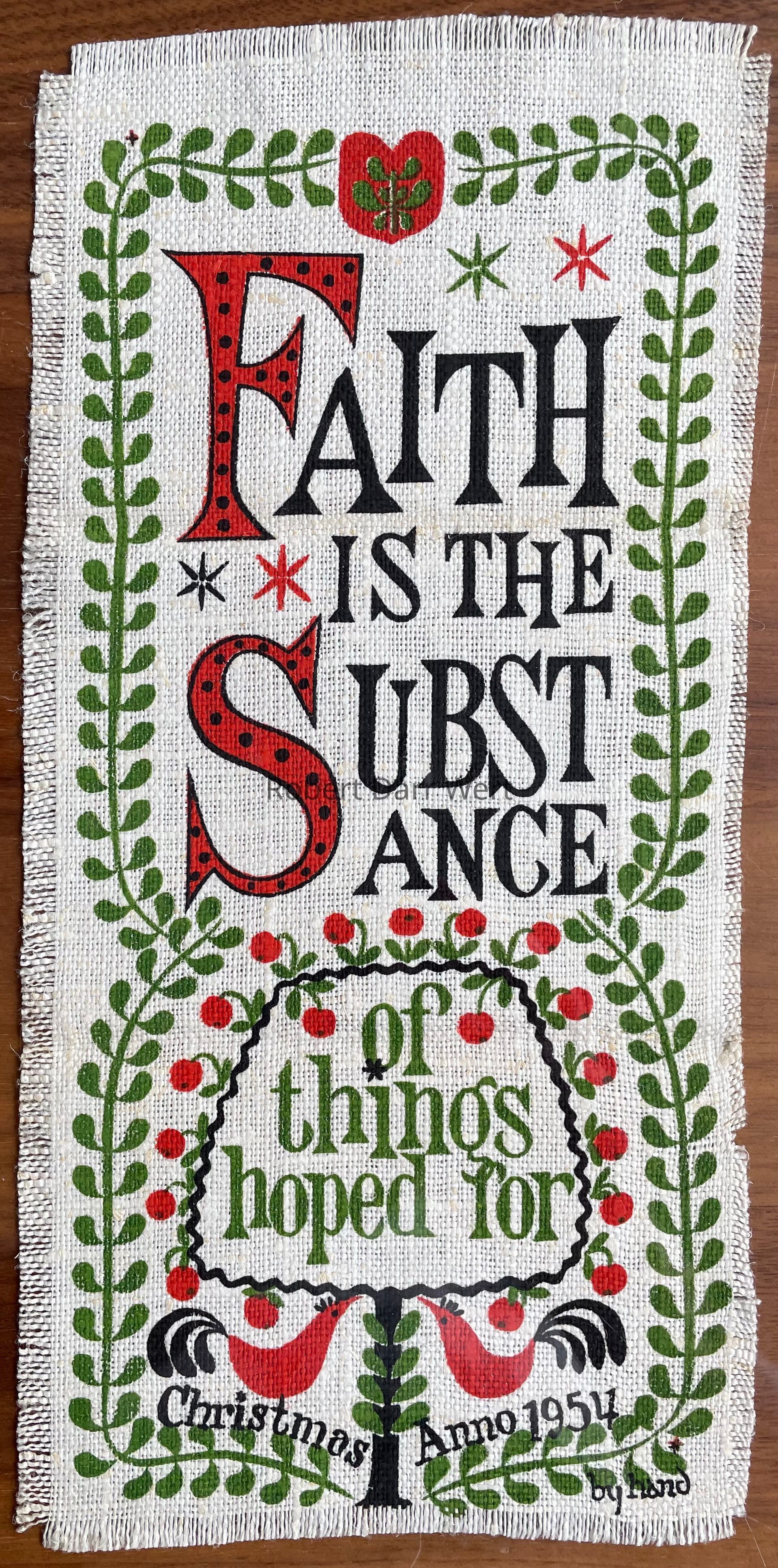 Two three-color silkscreen prints on off-white linen depicting symbols of love and plenty entwined with the Bible verse Hebrews 11-1, which is split between two panels: